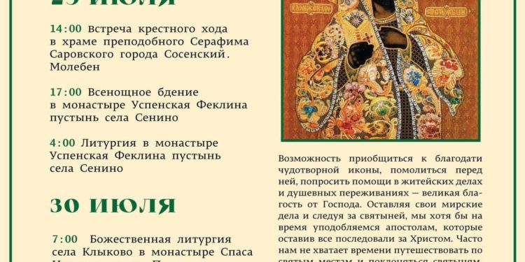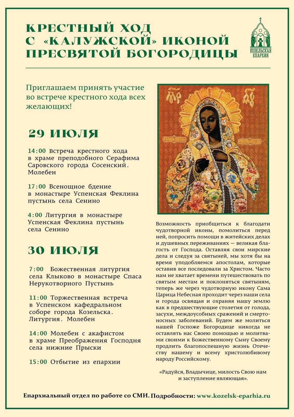 29 июля традиционный ежегодный крестный ход с чудотворным образом Пресвятой Богородицы «Калужская» и образом святых новомучеников Калужских пребывает в приделы Козельского района. Первая остановка в 14. 00 в храме преподобного Серафима Саровского в городе Сосенский.