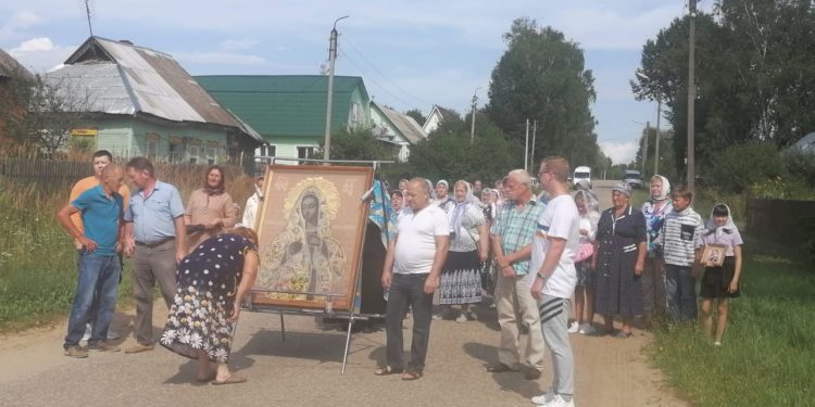 28 июля жители и гости села Чернышено Думиничского района прошли крестным ходом с иконой Калужской Божией Матери. Второй год святыню встречают при въезде в село и проносят по центральной улице. Удивительная благодать и возможность прикоснуться к образу Пресвятой Богородицы тем, кто не может прийти в храм. Для всех желающих поклониться образу Калужской иконы Божией Матери по ходу движения делались остановки. Вместе со взрослыми крестным ходом шли и дети, в руках у многих домашние иконы. Их нежные тонкие голоса тихонько подпевали слова молитвы «Пресвятая Богородица, спаси нас». Чувствовалось единение душ и помыслов, надежда на то, что Богородица слышит мольбы и просьбы каждого, даёт утешение и укрепляет в вере, посылает милость Божию. Под колокольный звон и песнопения торжественно вносили образ Калужской иконы Божией Матери в храм Успения Пресвятой Богородицы. В храме много цветов. Они создают атмосферу праздника и особого почитания и любви к Божией Матери. В центре храма установлены иконы «Калужская» Божия Матерь, образ новомучеников и исповедников земли Калужской. Люди преклоняются к святыням. Настоятель храма иерей Димитрий Гаврилов читает акафист Пресвятой Богородицы. Воцаряется тишина и прихожане вслушиваются в каждое слово, произнесенное священником, славят и особо почитают Богородицу, подпевая слова акафиста «Радуйся, Владычица, милость Свою и заступление являющая».
