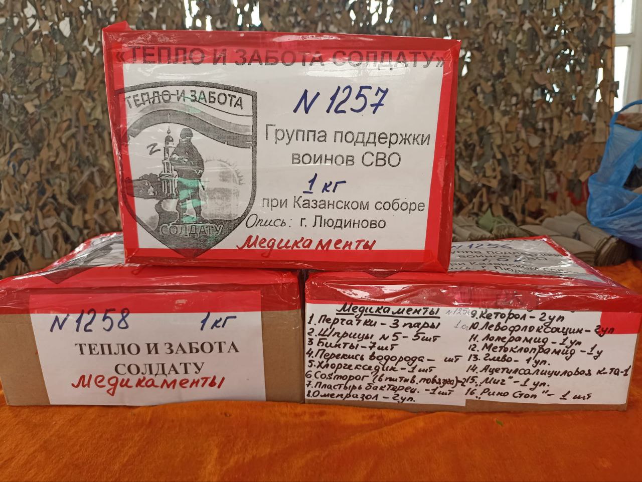 В августе 2024 года Приходская группа добровольцев «Тепло и забота солдату» при Казанском соборе города Людиново (координатор Валентина Купрюхина) снова сформировала и отправила на Курское направление 11 коробок с медикаментами: