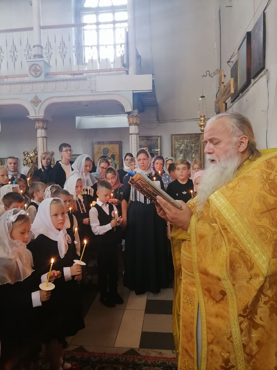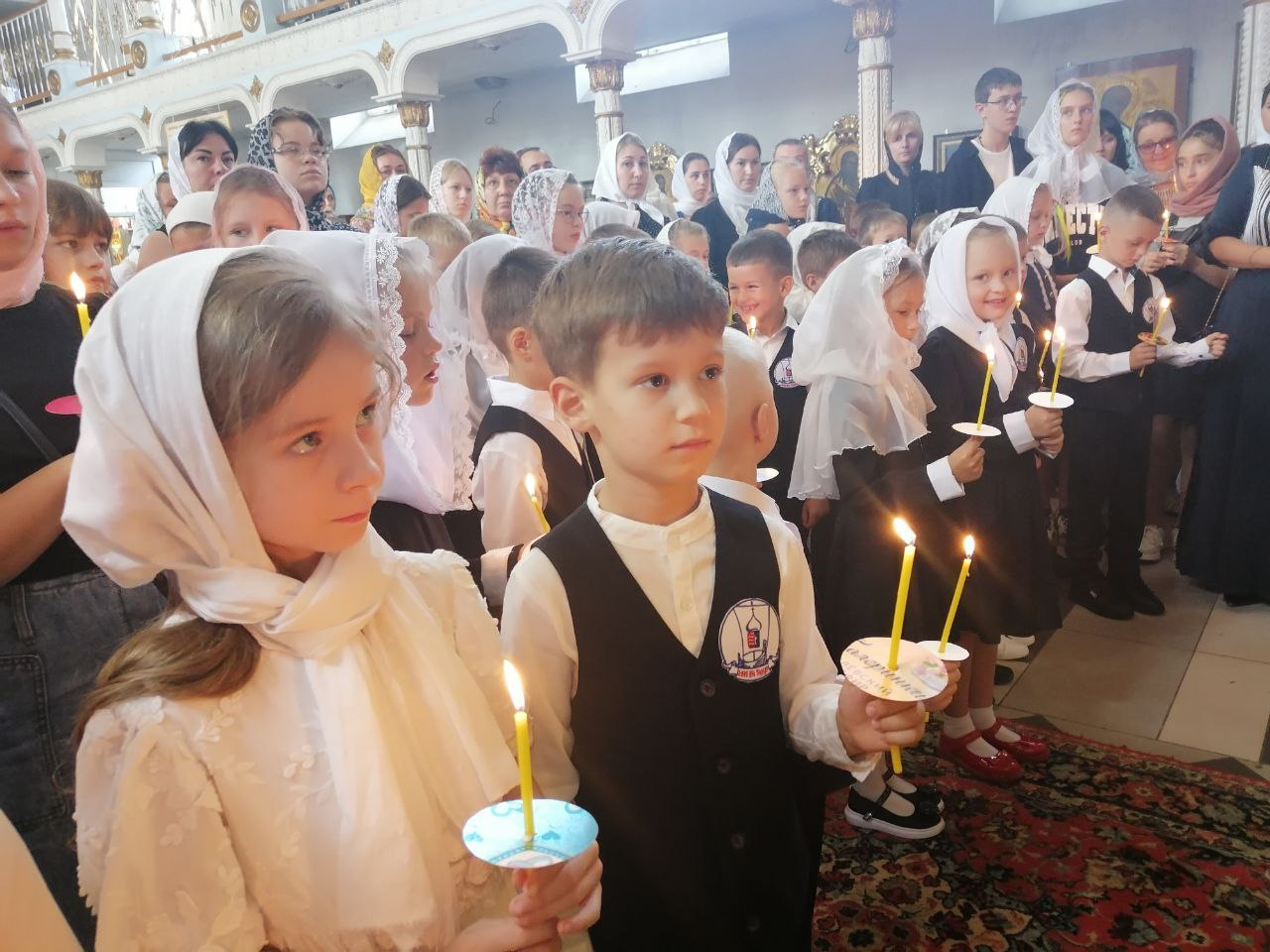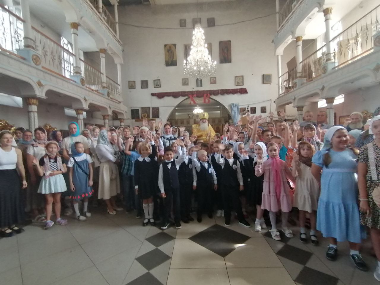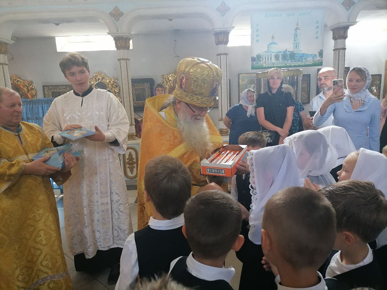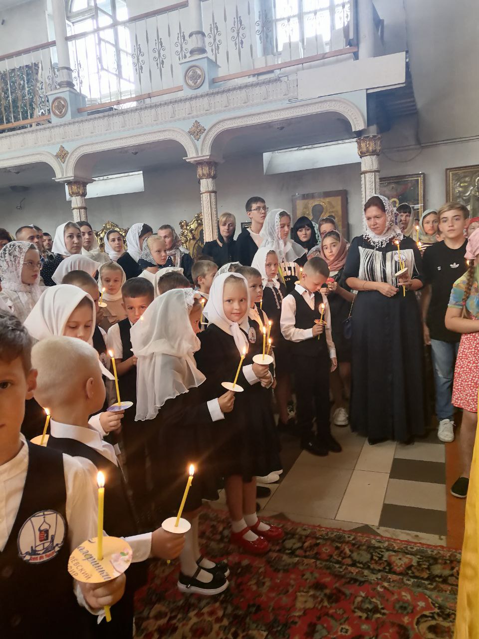 Дети пришли на молебен в храм Божий нарядно одетые, в красивой школьной форме. После молебна отец Алексий от души поздравил всех с новым учебным годом. А будущим школьникам, после общего фото, подарил сладости, иконочки Божией Матери, именуемой «Людиновская» и книги «Капелька добра».