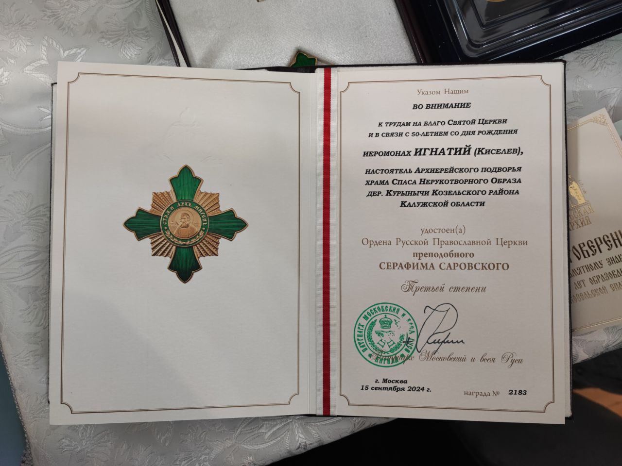 Иеромонах Игнатий (Кисилев) удостоен Патриаршей награды
