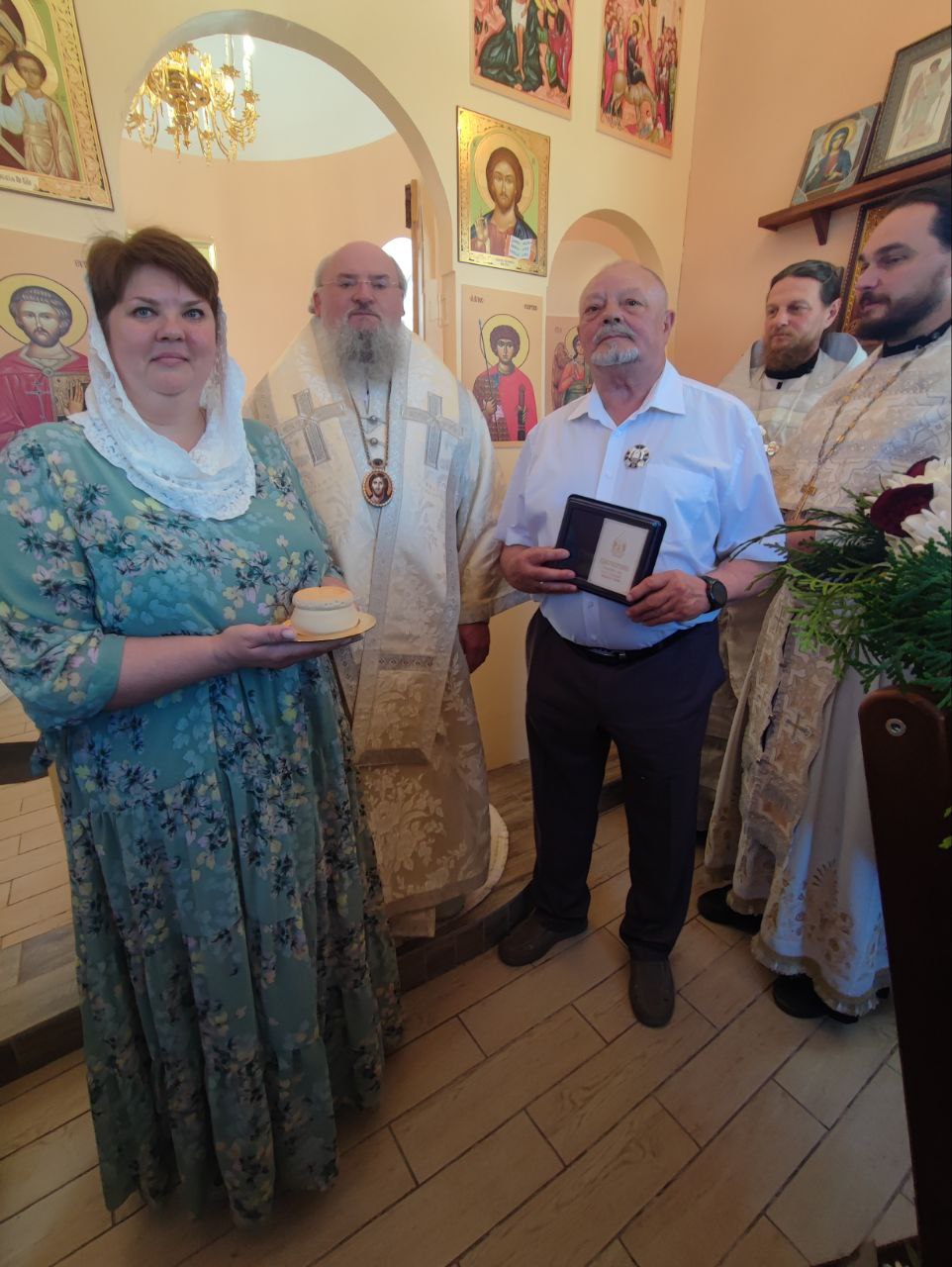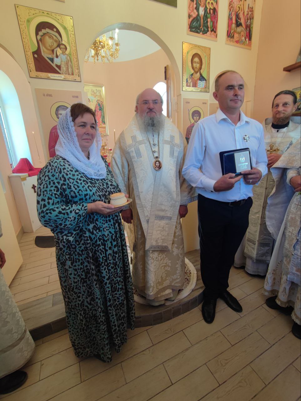 Во внимание к трудам по строительству храма епископ Никита наградил юбилейным знаком 10-летия образования Козельской епархии ктиторов храма — Евгения Михайловича Бубненкова и Михаила Анатольевича Потемкина.