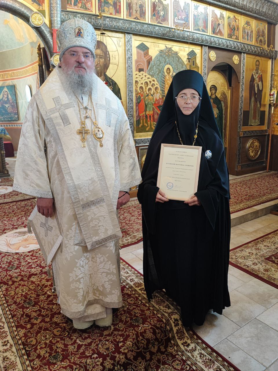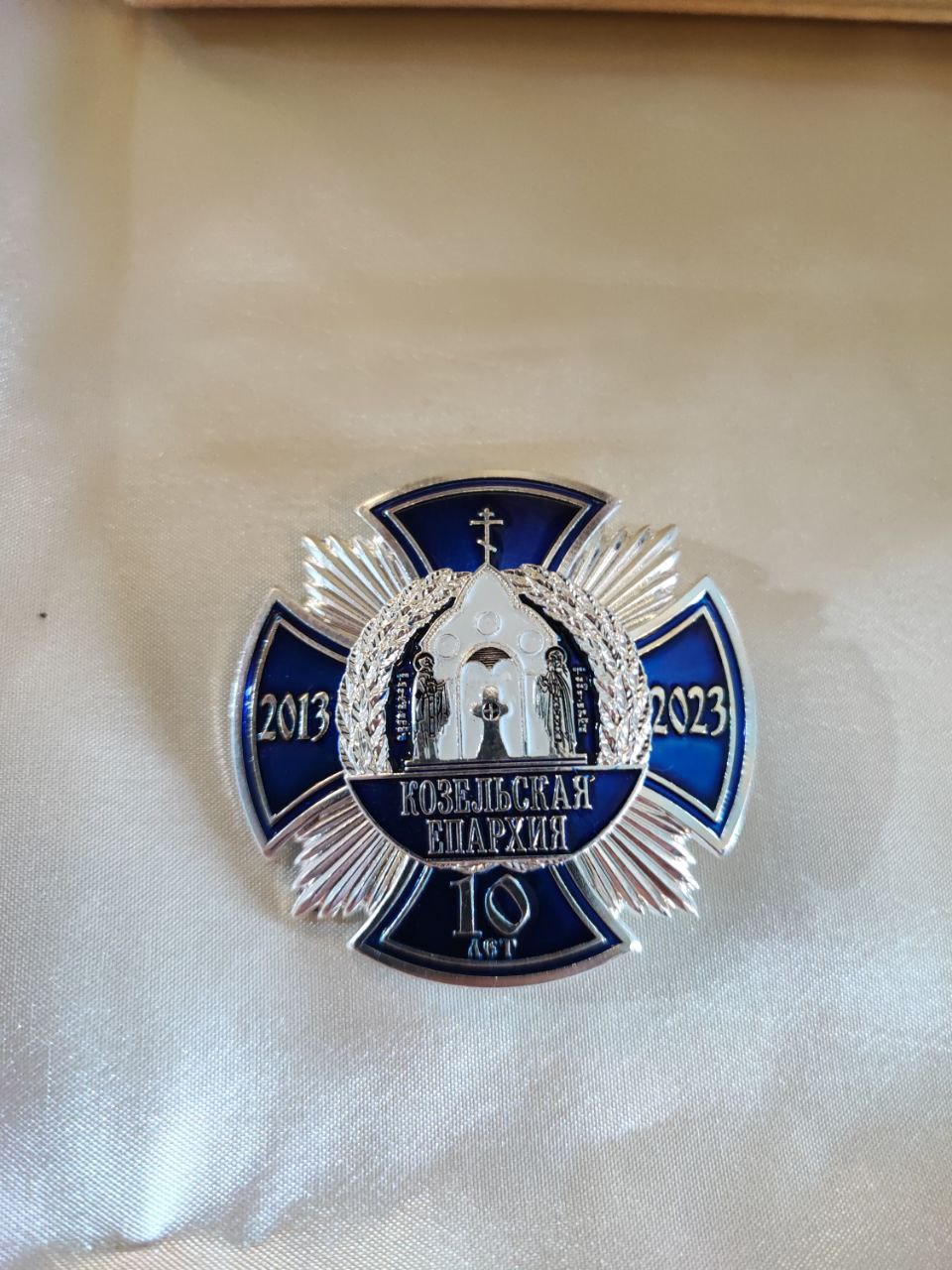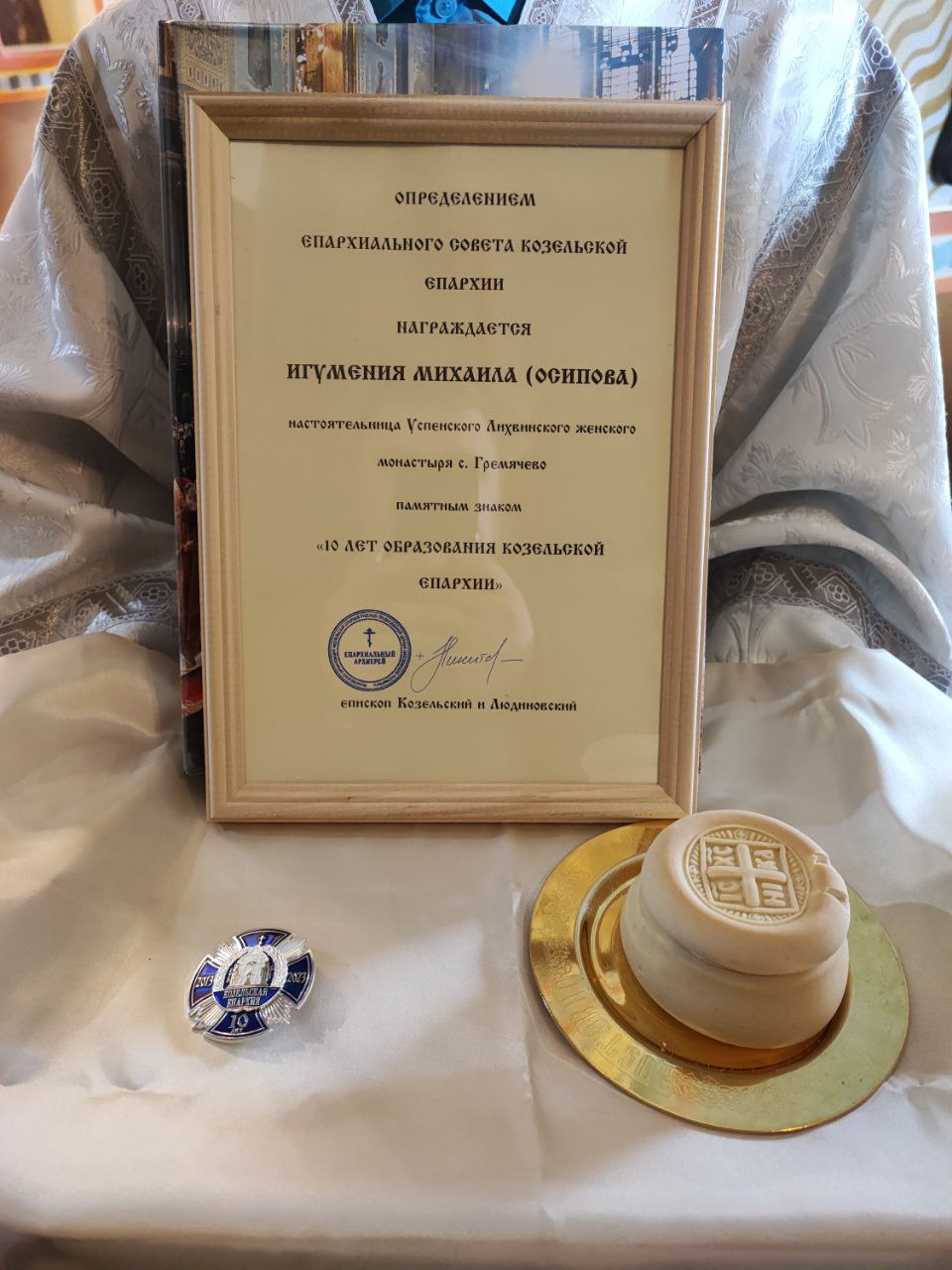 Архипастырь поздравил настоятельницу обители с днем тезоименитства и вручил ей юбилейный знак 10-летия Козельской епархии, а также преподнес святую просфору и памятный подарок.