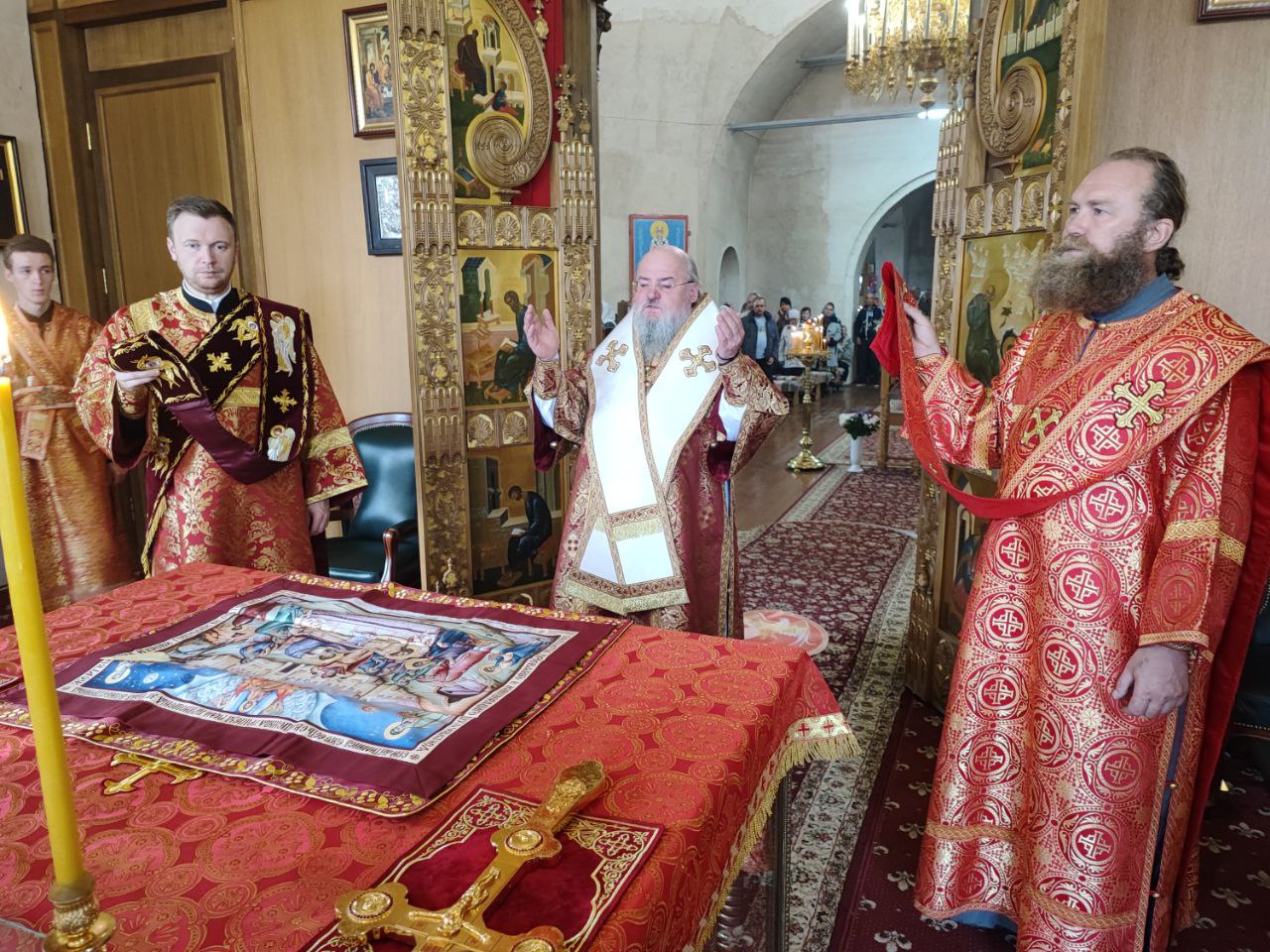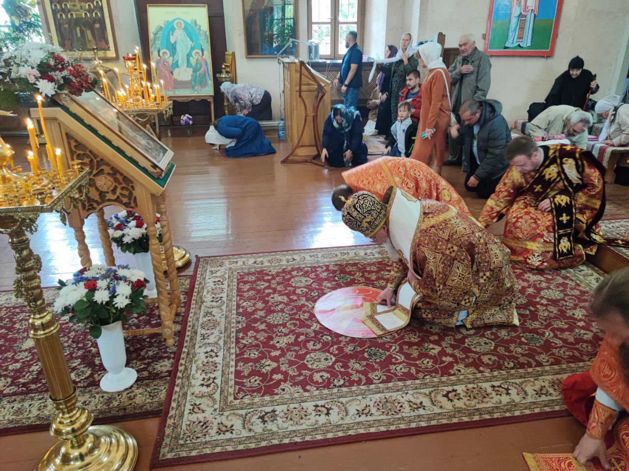 По отпусте литургии священнослужители совершили поклонению Животворящему Кресту, а затем владыка обратился к богомольцам с проповедью.