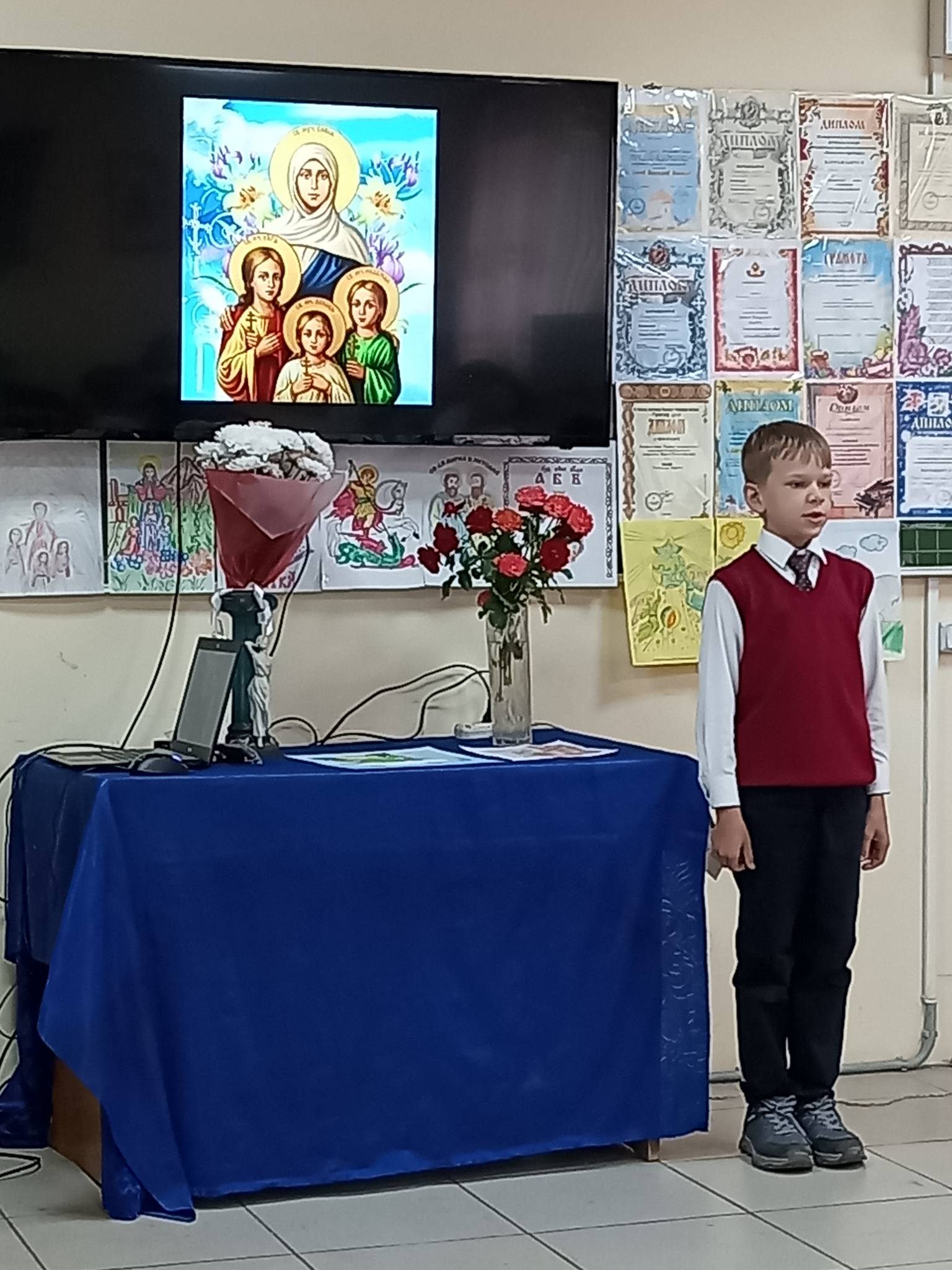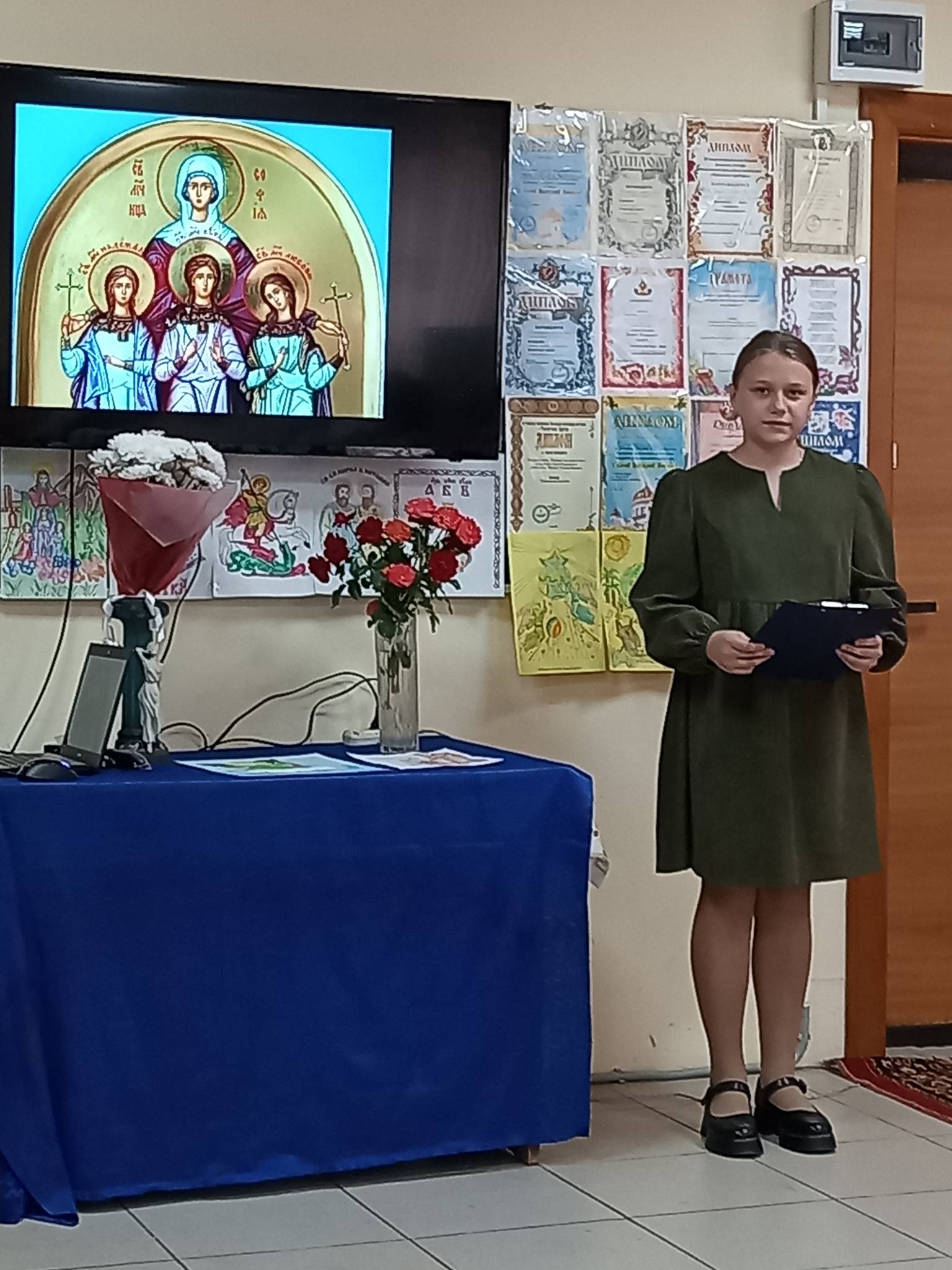 Руководитель школы Клячина Татьяна Ивановна рассказала детям о житии святых мучениц. С интересом зрители слушали и смотрели концертные номера, подготовленные учениками школы, посвященные святым мученицам Вере, Надежде, Любови и матери их Софии. Лучкина Екатерина прочитала авторское стихотворение, которое никого не оставило равнодушным. Так же авторское стихотворении Лучкиной Екатерины, прочитал ее брат Лучкин Кирилл. В 2024 году отмечается 225 лет со дня рождения Александра Сергеевича Пушкина. Своей поэзией он показал пример, как надо практически истолковывать Евангелие. Служение Богу тем даром, который дал каждому человеку Господь, есть основной признак истинной духовности.  На фестивале прозвучали стихи гениального поэта, такие как «Отцы пустынники и жены непорочны», «Отче наш», «Пророк», «Мирская власть», «К Чаадаеву». Так же на фестивале прозвучала классическая музыка и художественное творчество.