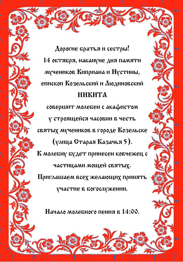 14 октября, накануне дня памяти священномученика Киприана и мученицы Иустинии, епископ Козельский и Людиновский Никита совершил молебен с акафистом и освящением воды у строящейся часовни в честь соименных святых в городе Козельске. Архипастырю сослужили: иерей Сергий Барыкин настоятель храма Благовещения Пресвятой Богородицы, иерей Филипп Лисенков клирик Вознесенского храма, окормляющий строительство, и диакон Евгений Ковригин.