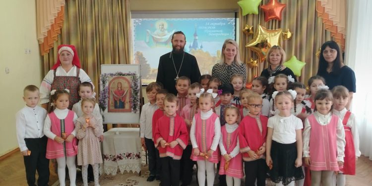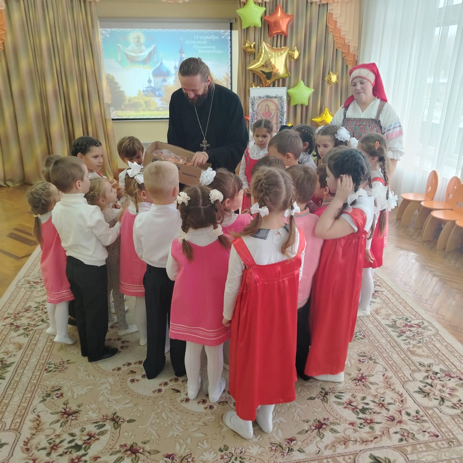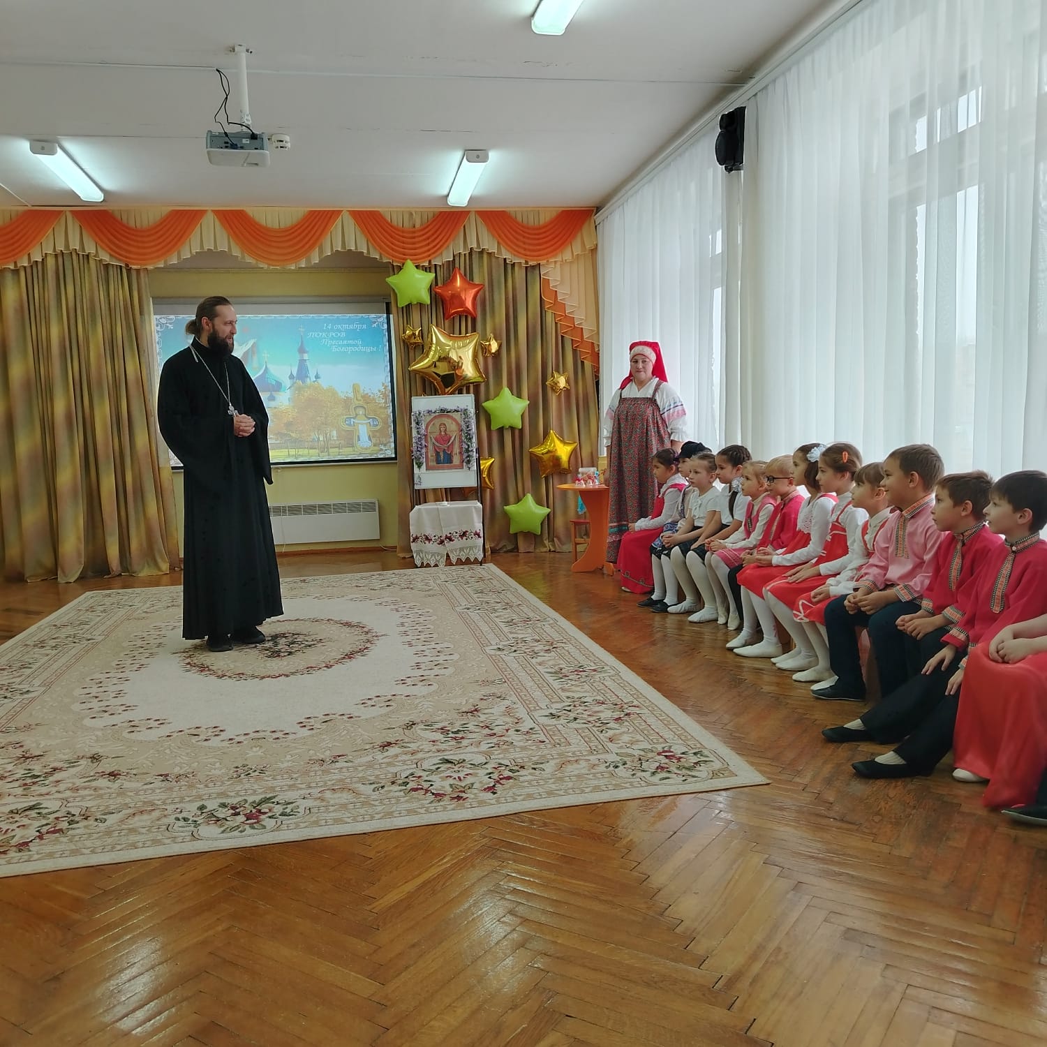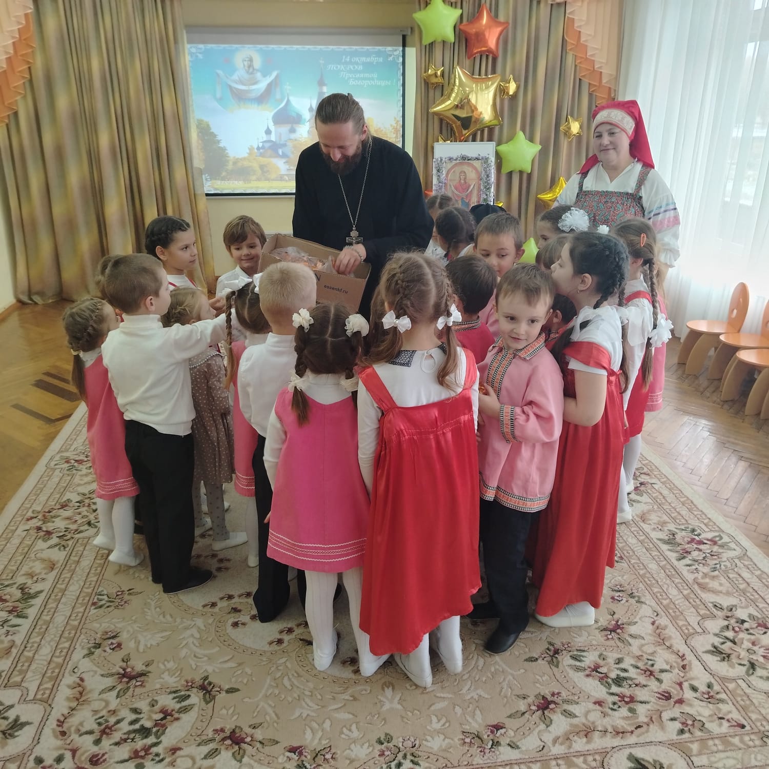 На праздник Покрова Пресвятой Богородицы настоятель храма Зачатия Иоанна Предтечи в селе Губино иерей Дионисий Капустин посетил Козельский детский сад «Ласточка».