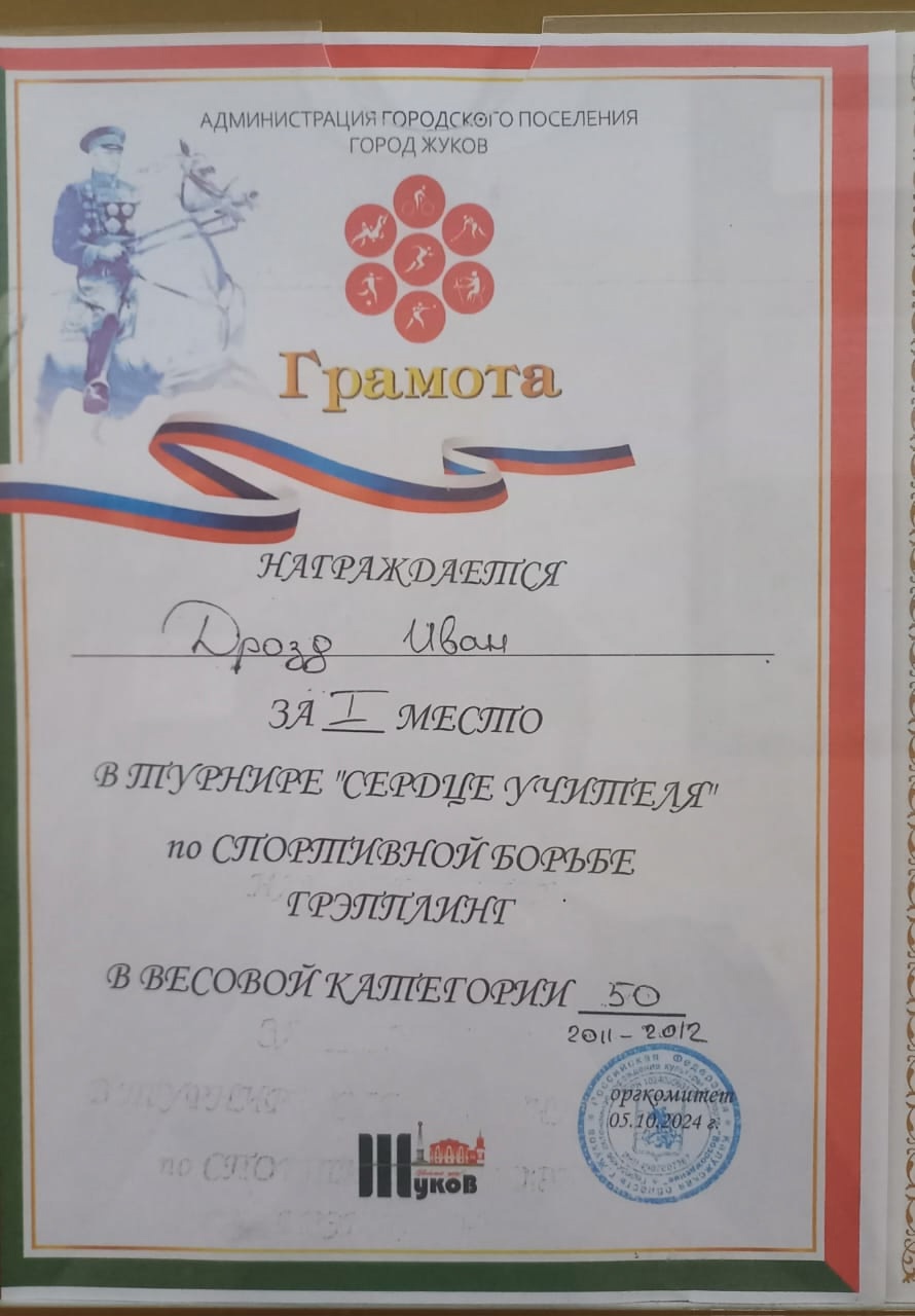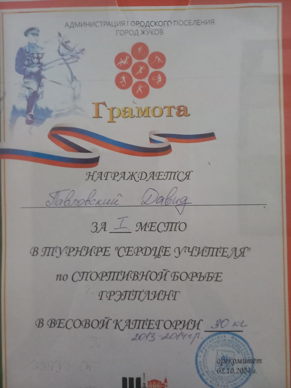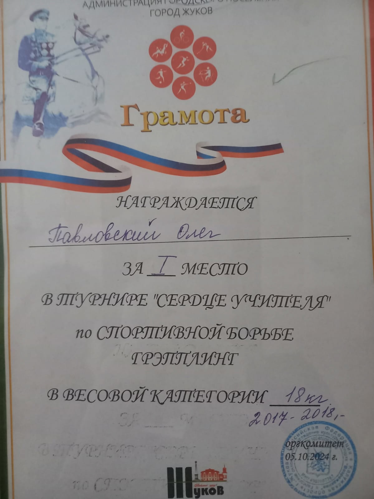 Поздравляем с победой спортивных гимназистов учащихся Козельской православной гимназии: первоклассника Павловского Олега, четвероклассника Павловского Давида и семиклассника Дрозда Ивана, которые 5 октября участвовали в турнире «Сердце учителя» по спортивной борьбе грэпплинг в городе Жукове и заняли первые места в своих весовых категориях. Конечно, победа не стала бы возможной без их учителя-тренера Павловского Олега Владимировича. Так держать, ребята! А Олегу Владимировичу желаем Божией помощи в тренерском служении и новых побед его подопечных.