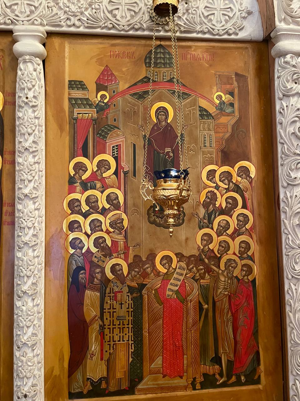 Ра́дуйся, Ра́досте на́ша, покры́й на́с от вся́каго зла́ честны́м Твои́м омофо́ром.