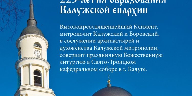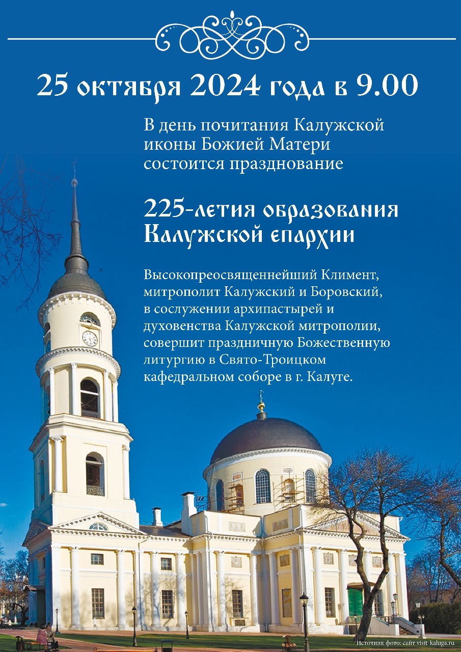 25 октября 2024 года в день почитания Калужской иконы Божией Матери состоится празднование 225-летия образования Калужской епархии. Высокопреосвященнейший Климент, митрополит Калужский и Боровский, в сослужении архипастырей и духовенства Калужской митрополии, совершит праздничную Божественную литургию в Свято-Троицком кафедральном соборе города Калуги. Начало богослужения в 9.00.