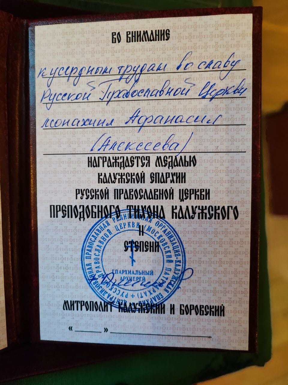 Во внимание к усердным трудам во славу Святой Церкви и в связи с личной юбилейной датой, по благословению митрополита Калужского и Боровского Климента, медалью преподобного Тихона Калужского была награждена настоятельница общины монахиня Афанасия (Алексеева).