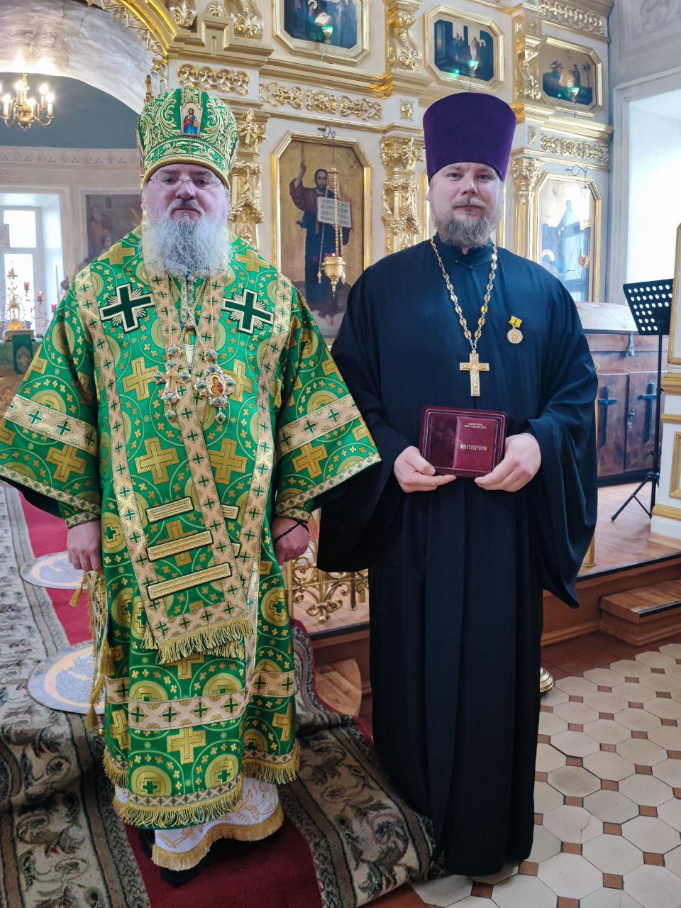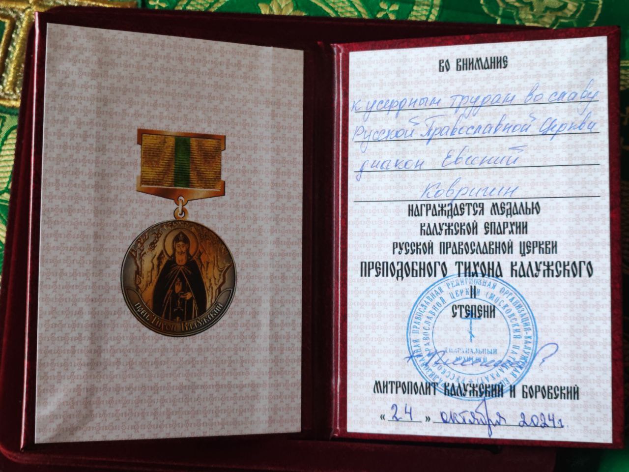 24 октября. Собор всех святых, в Оптиной пустыни просиявших. Епископ Козельский и Людиновский Никита совершил Божественную литургию в храме Благовещения Пресвятой Богородицы города Козельска, где долгие годы совершал свое служение постриженик Оптиной пустыни преподобноисповедник Рафаил (Шейченко). Архипастырю сослужили: протоиерей Павел Морозов, протоиерей Сергий Сычев, иерей Сергий Барыкин – настоятель прихода, диакон Евгений Ковригин, диакон Валерий Волков и диакон Сергий Акопян. На литургии были вознесены особые прошения и молитва о Святой Руси. По благословению Святейшего Патриарха Московского и всея Руси Кирилла эта сугубая молитва совершается во всех храмах Русской Православной Церкви за каждым богослужением. В сан диакона был рукоположен выпускник Барнаульской духовной семинарии Рупасов Демьян Павлович. По отпусте литургии священнослужители совершили молебное пение преподобным старцем Оптинским, а затем, вознеся молитву святым, владыка обратился к богомольцам с архипастырским словом. Во внимание к усердным трудам во славу Святой Церкви и в связи с личными юбилейными датами настоятель прихода иерей Сергий Барыкин и старший диакон Козельской епархии Евгений Ковригин были удостоены медали Калужской митрополии преподобного Тихона Медынского.
