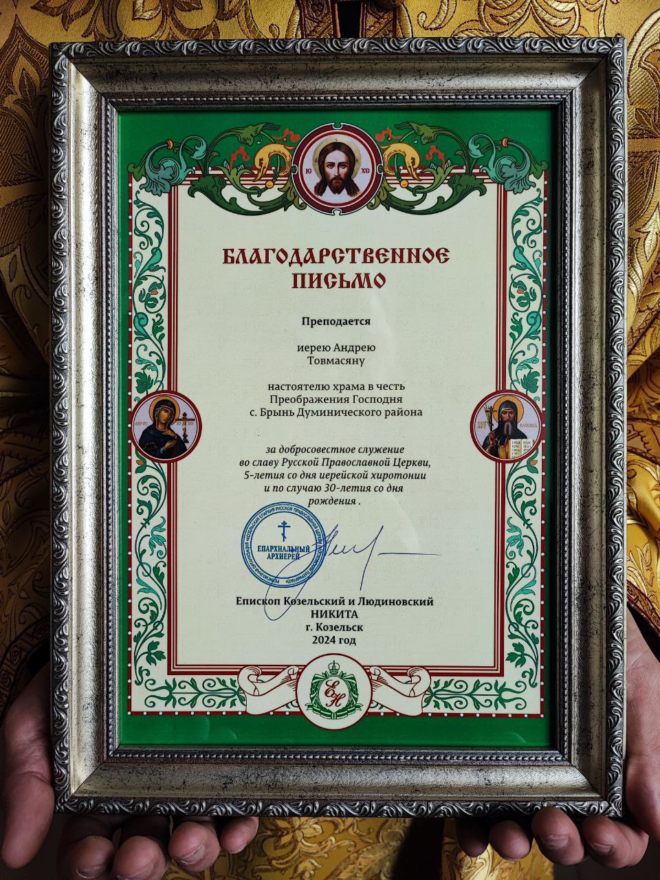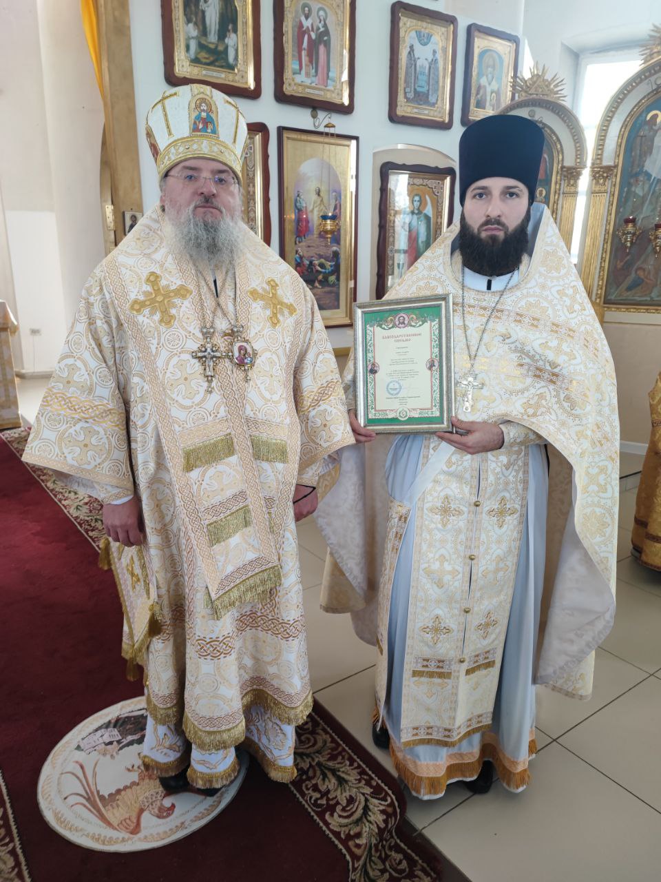 По отпусте литургии владыка обратился к богомольцам с архипастырским словом. В связи с тридцатилетием со дня рождения и пятилетием со дня иерейской хиротонии епископ Никита вручил иерею Андрею Благодарственное Архиерейское письмо.
