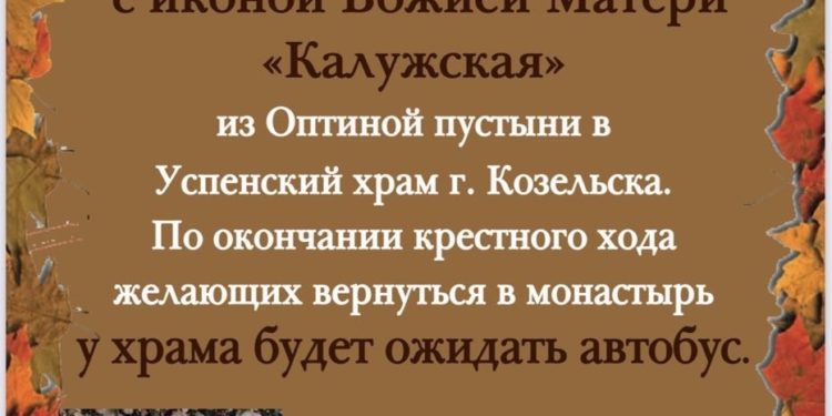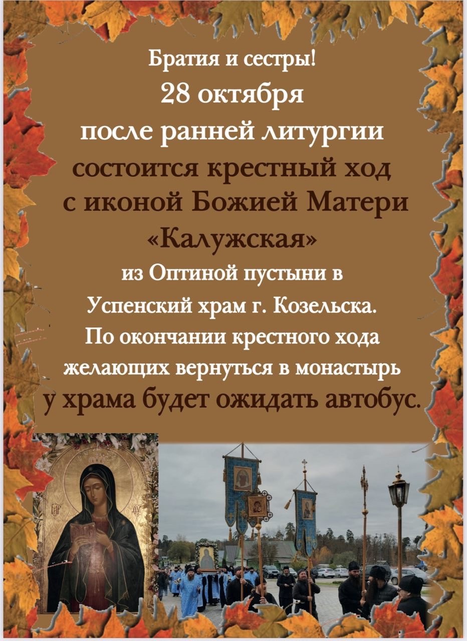 28 октября состоится крестный ход с Калужской иконой Божией Матери и монастыря Оптина пустынь в Успенский кафедральный собор города Козельска