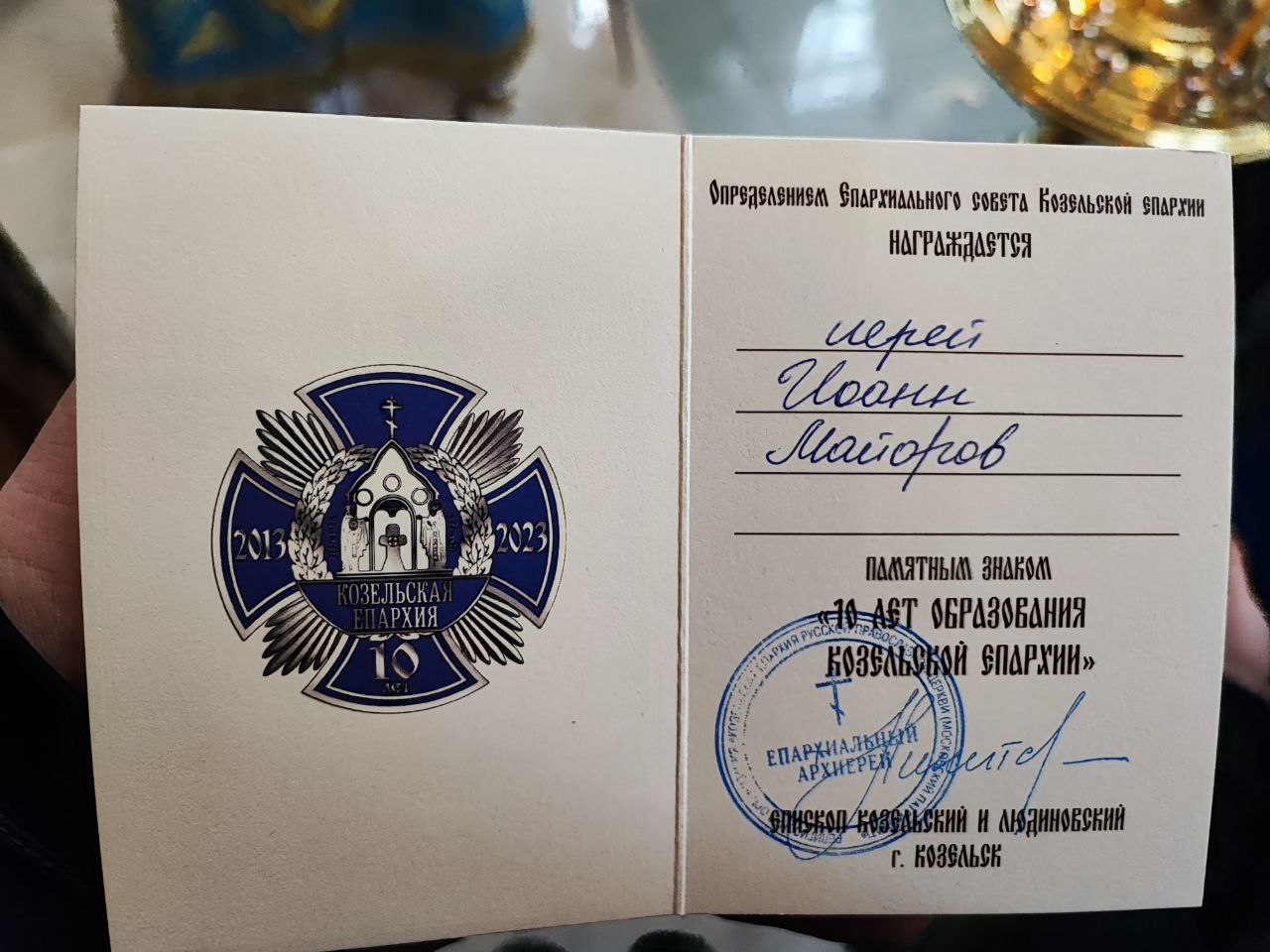 Во внимание к усердным трудам во славу Святой Церкви и пятилетием служения в священном сане настоятель храма иерей Иоанн Майоров был удостоен юбилейного знака 10-летия образования Козельской епархии и благодарственного Архиерейского письма. Также в благодарность за помощь храму ряд активных прихожан получили Архиерейские грамоты.
