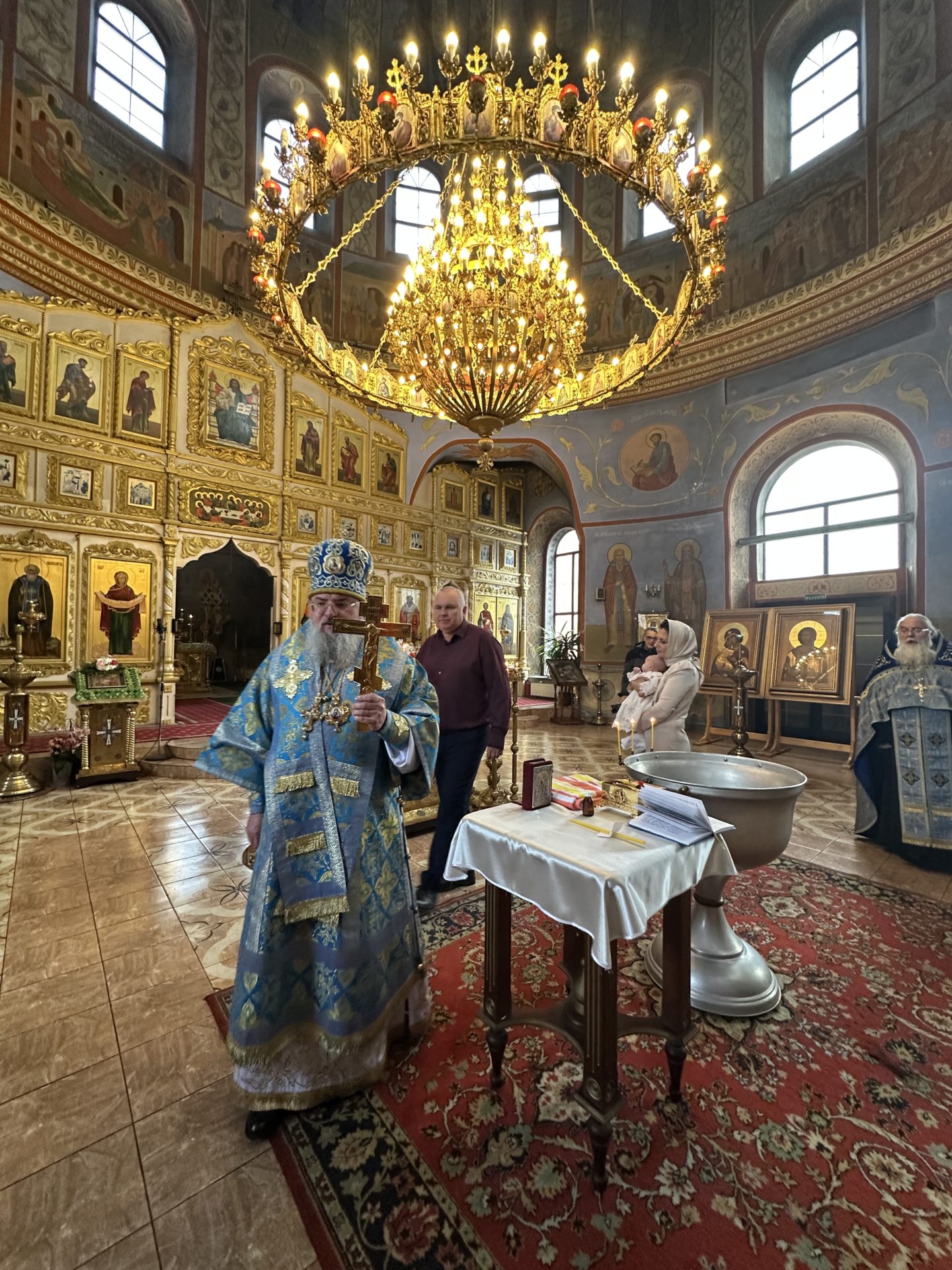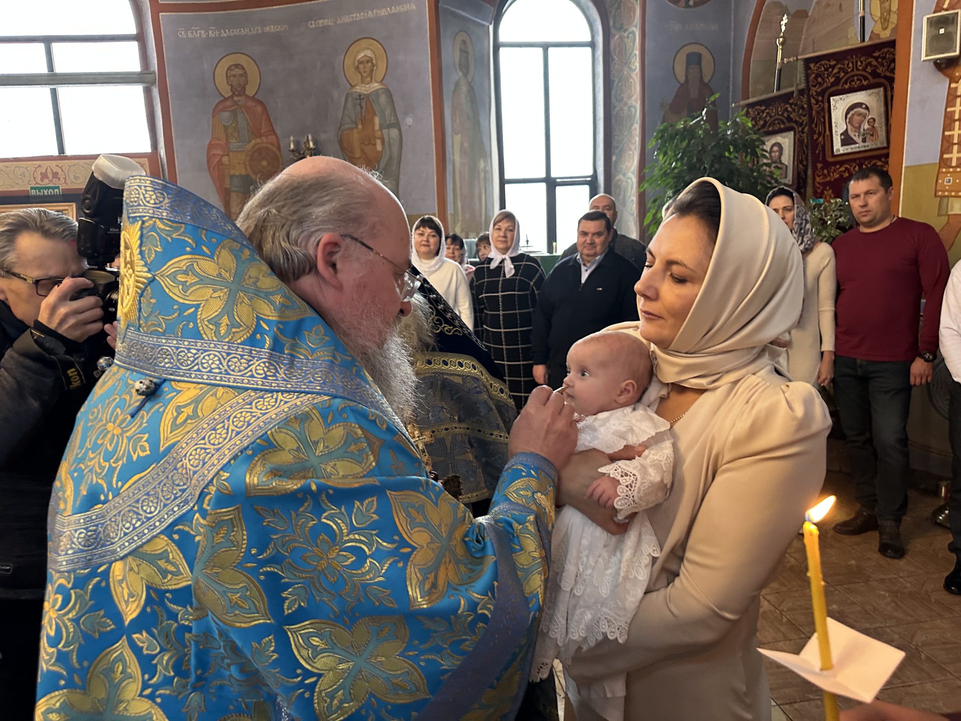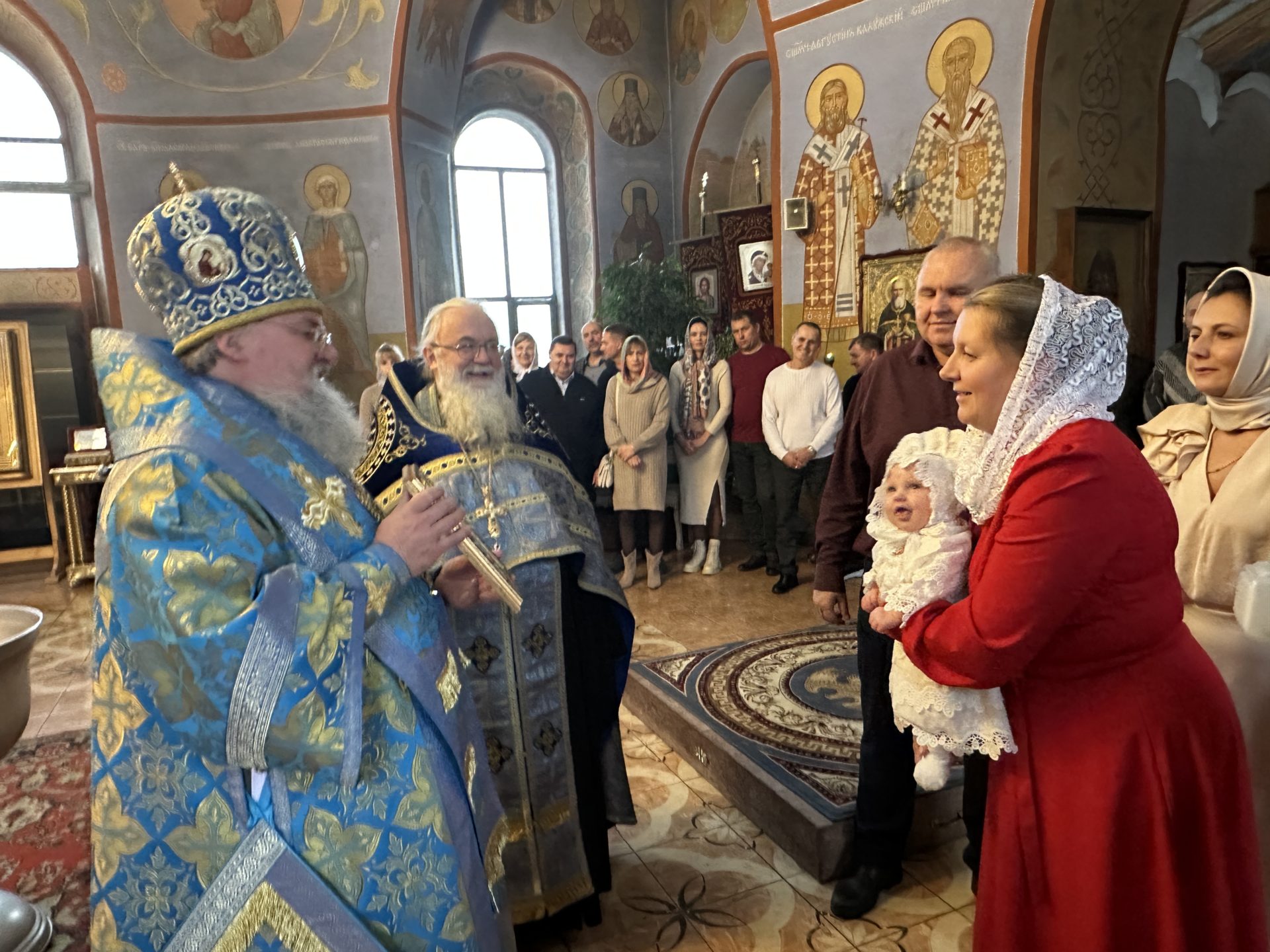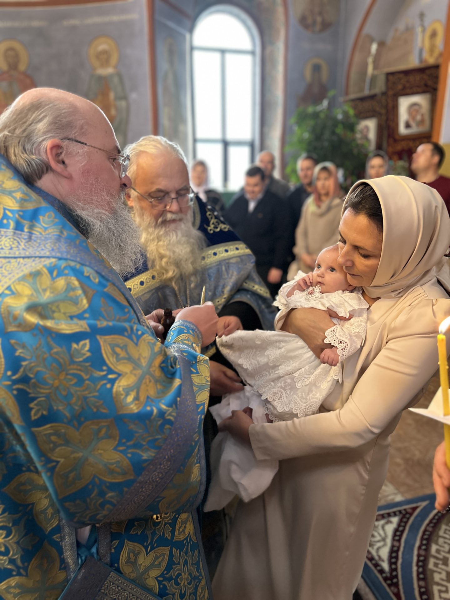Архипастырю сослужили: настоятель прихода протоиерей Александр Рябов – отец крещаемой и протоиерей Алексий Жиганов – ее дедушка.