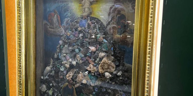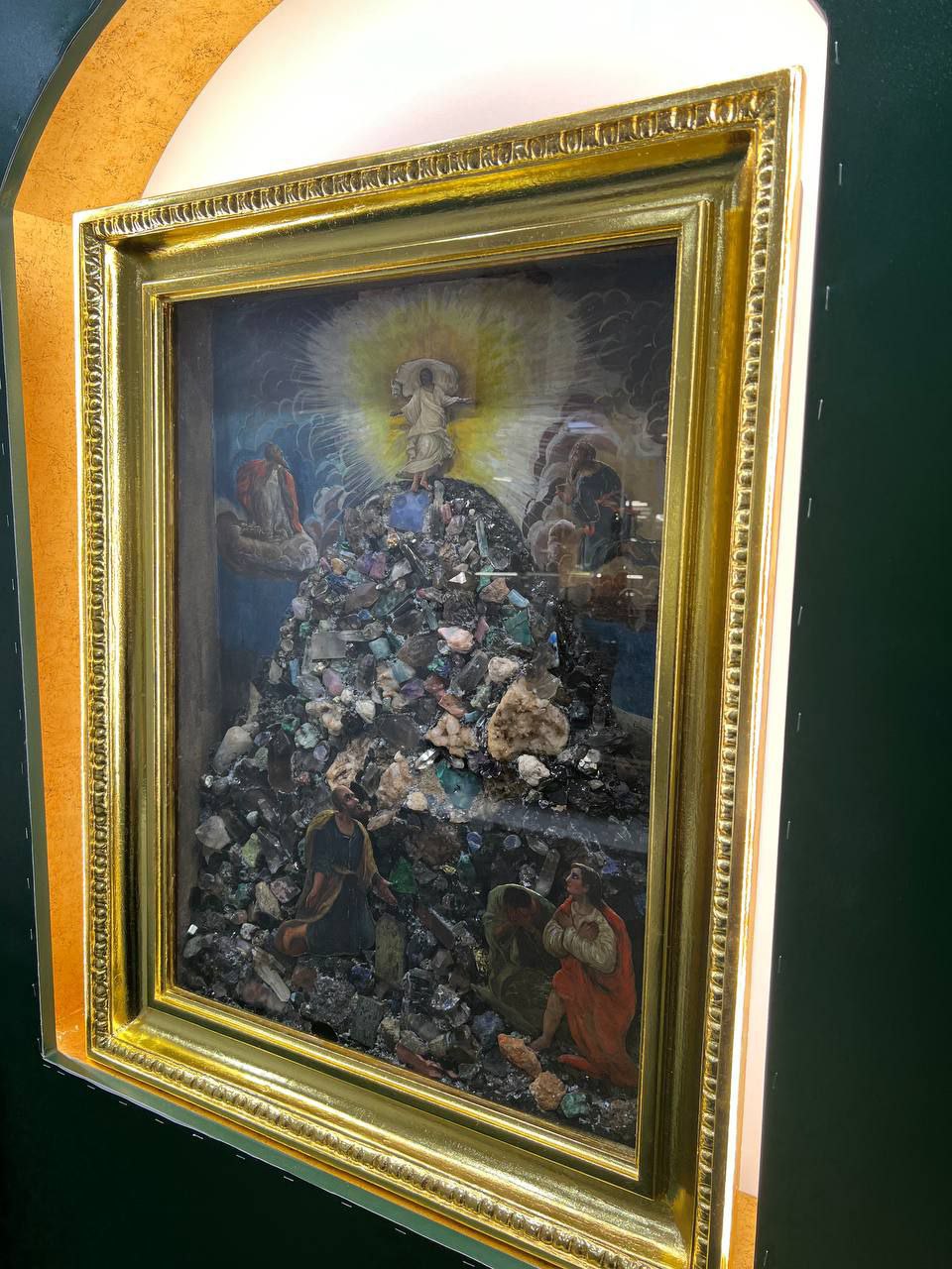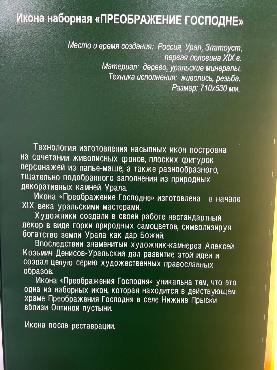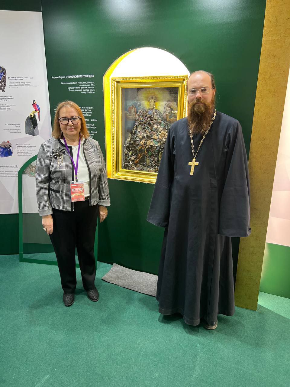 Наборная икона из уральских самоцветов из храма Преображения Господня села Нижние Прыски Козельской епархии явилась одним из центров экспозиции выставки «Мастера России. Ювелирное и камнерезное искусство. Московский самоцветный фестиваль — 2024».