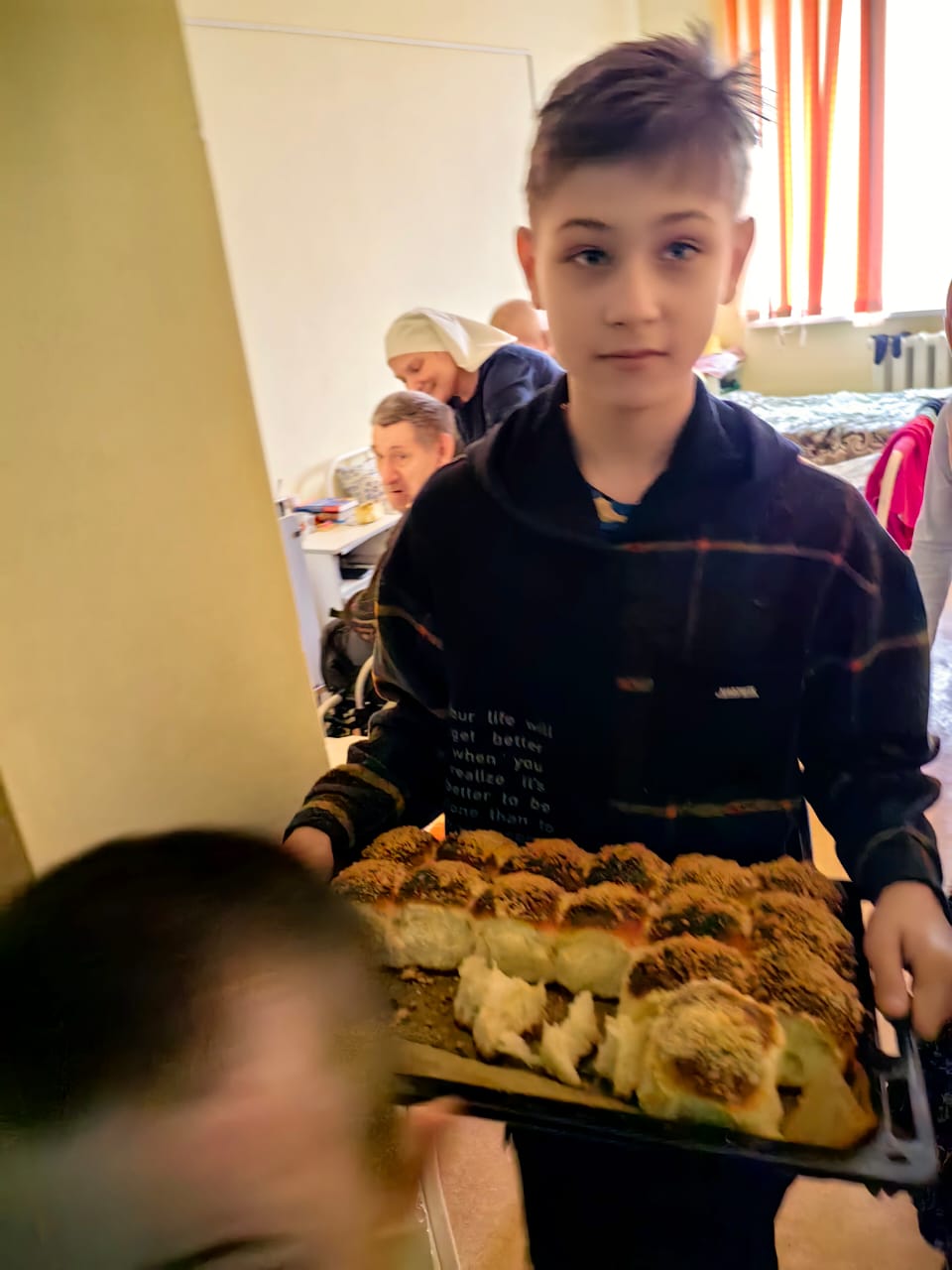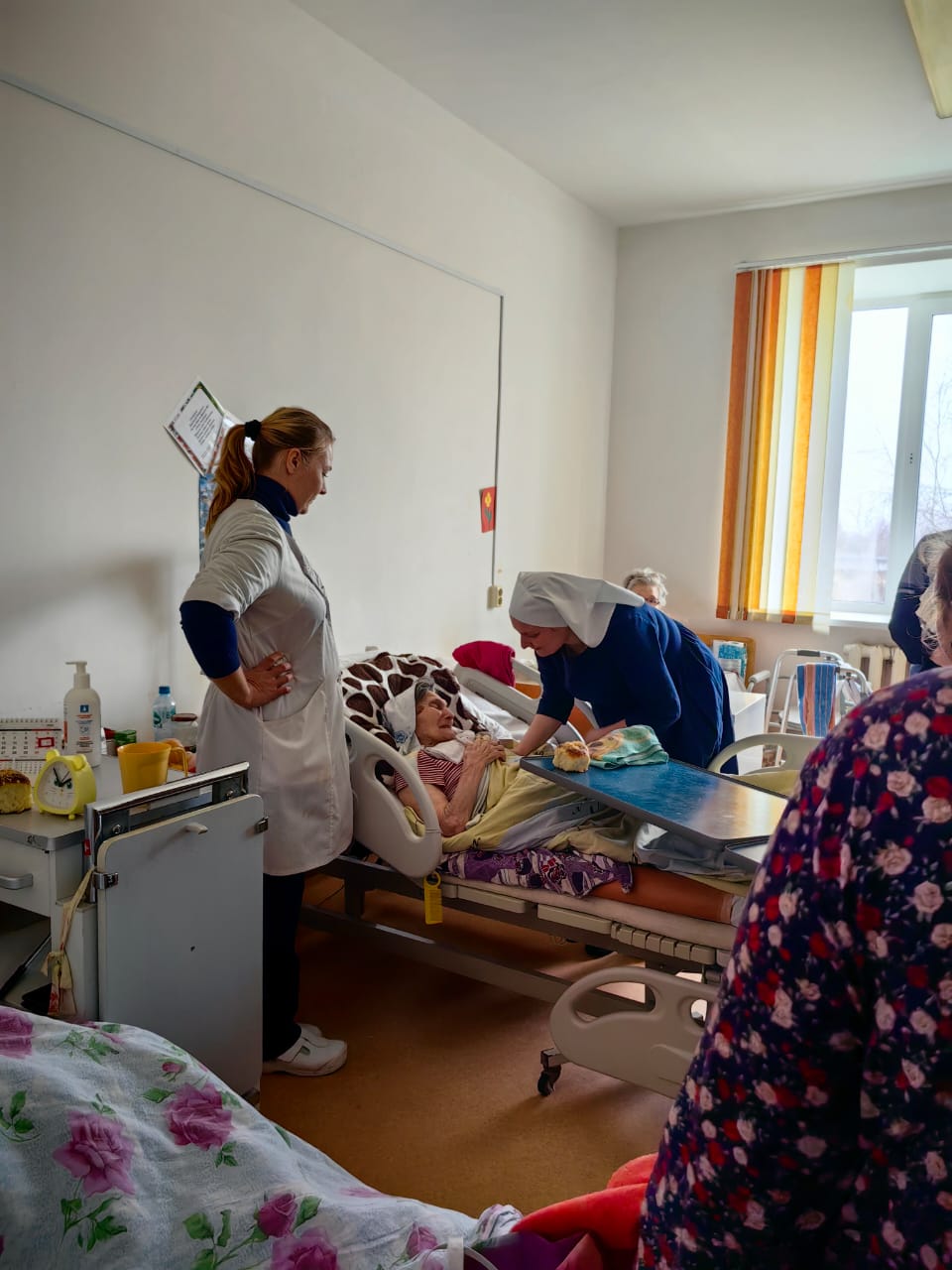 Приехали с гостинцами. Супруги Ульяновских священников Елена Садовникова, Анна Гайсина и другие мамы испекли мягкие, сдобные булочки. Привезли и уходовую косметику для наших старичков.
