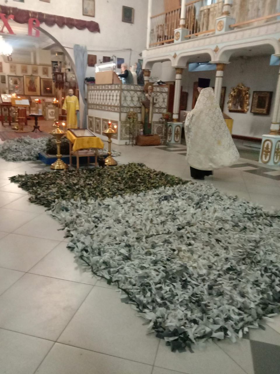 Маскировочные сети, которые плетут в помещениях при Казанском соборе города Людиново, освящаются на молебнах настоятелем храма протоиереем Алексием Жигановым и клириком храма иереем Алексием Сначевым.