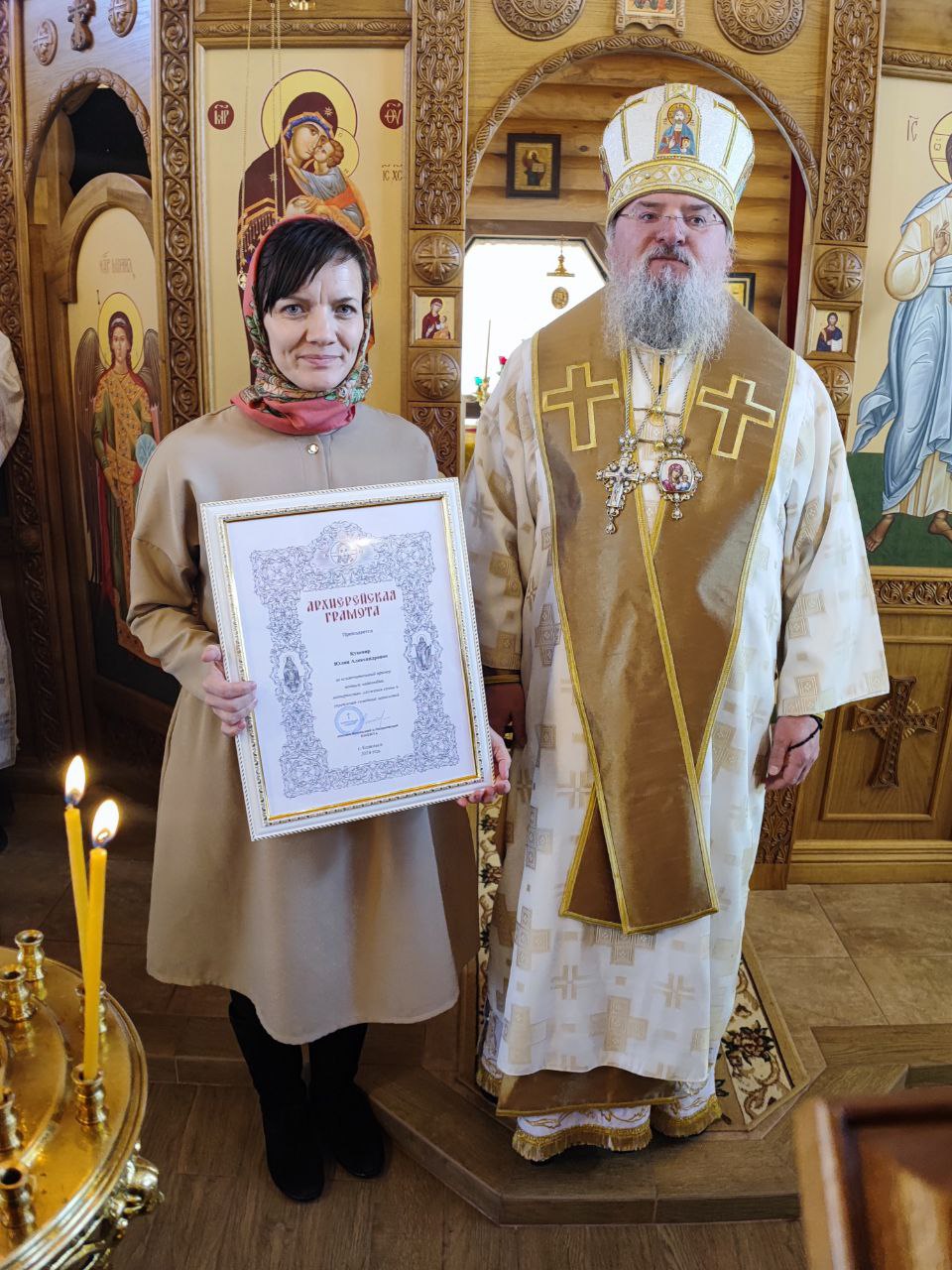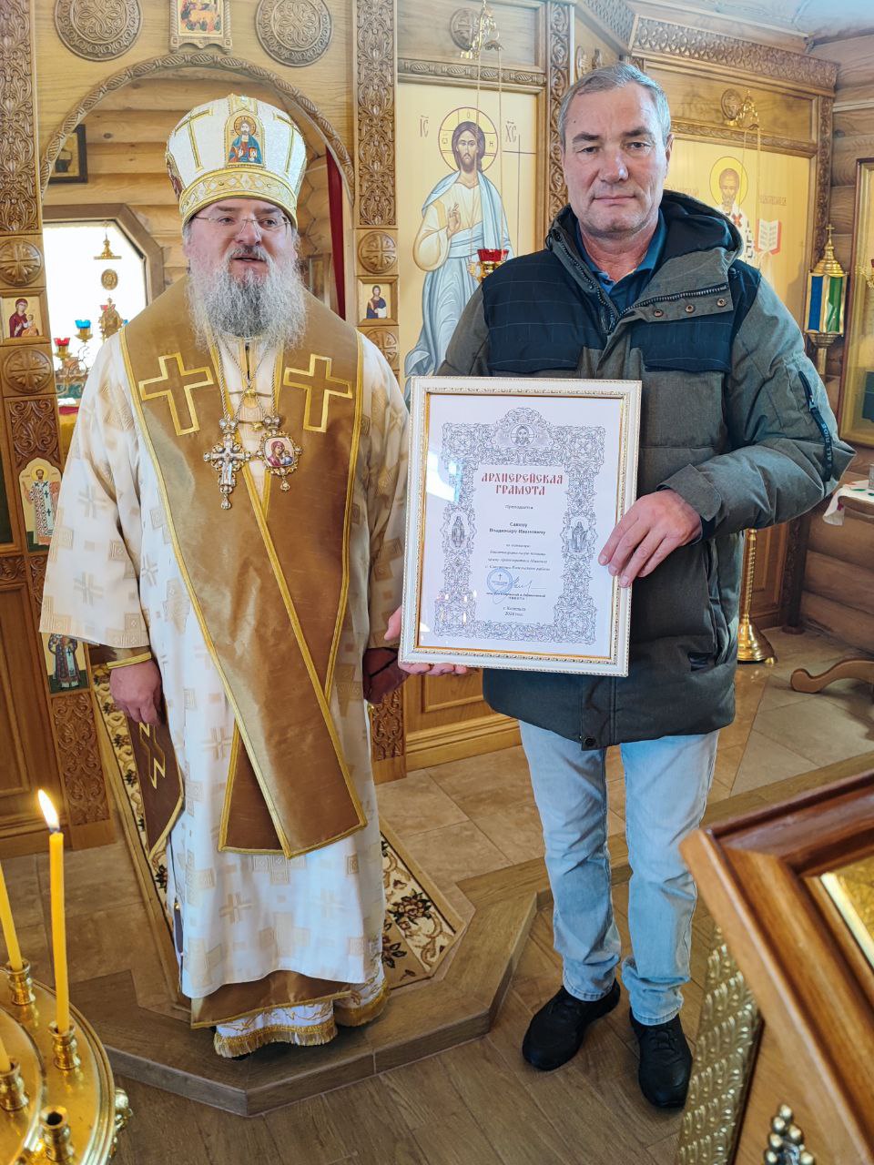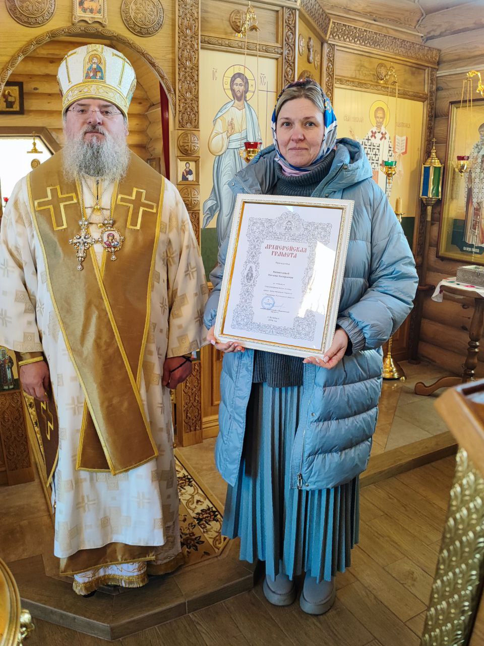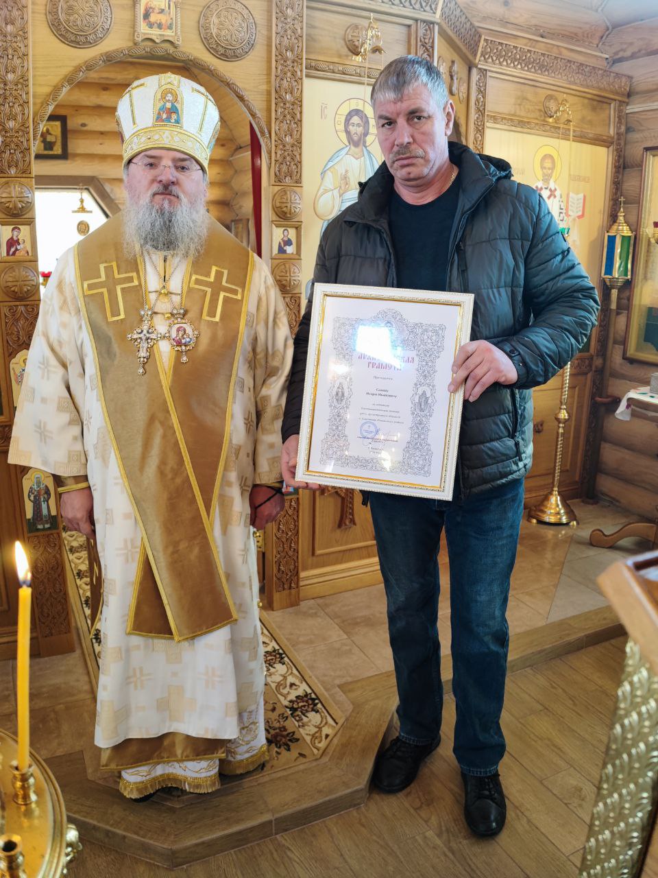 Архипастырь вручил благодарственные Архиерейские грамоты активным прихожанам, потрудившимся в благоустройстве и благоукрашении храма и приходского дома.