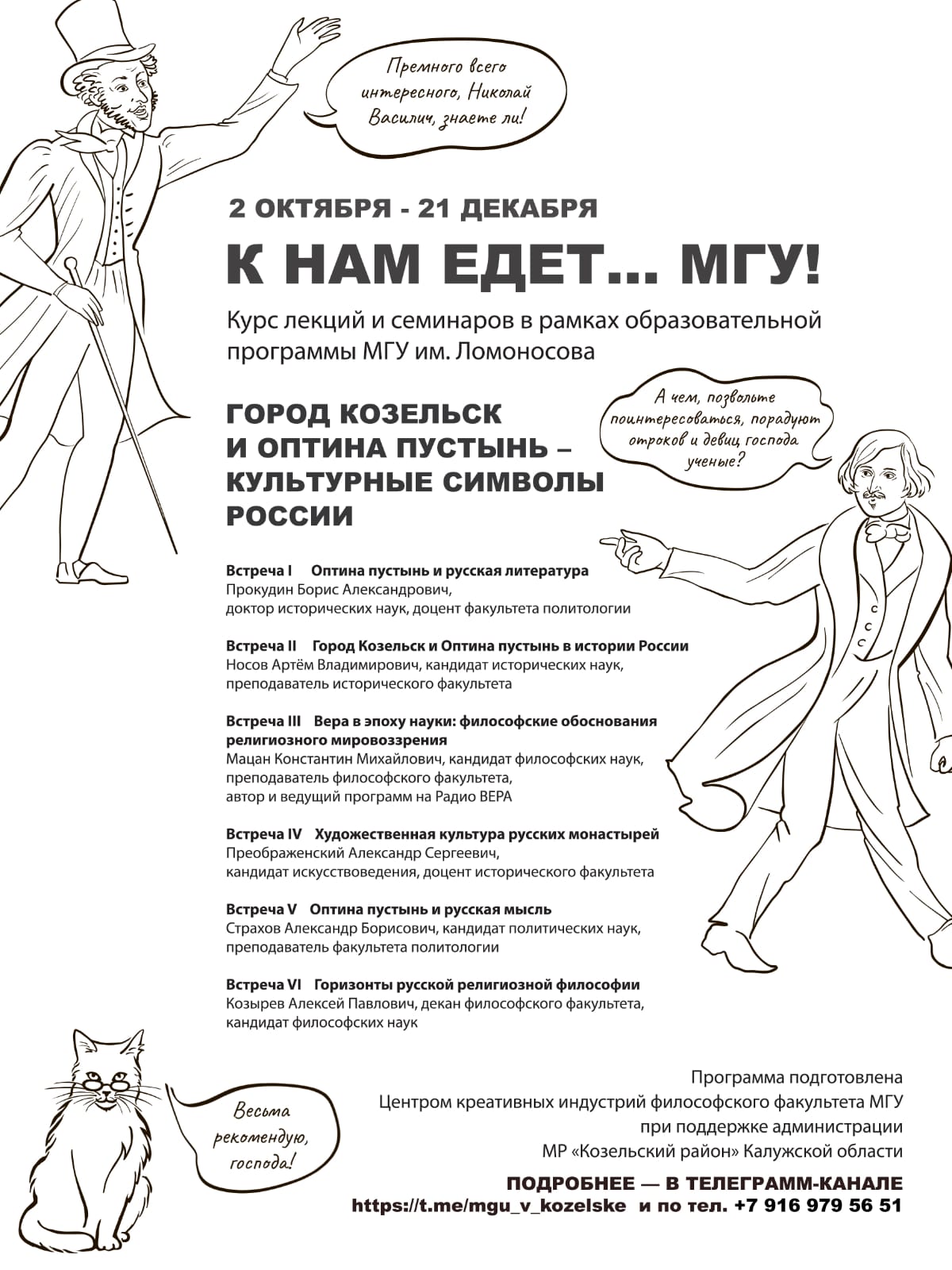 Проект представляет из себя образовательную программу «Город Козельск и Оптина пустынь – культурные символы России». Программа состоит из цикла лекций и семинаров онлайн и оффлайн форматах, которые проводят ведущие деятели различных факультетов МГУ. Программа рассчитана на подростков- старшеклассников и студенческую молодёжь.