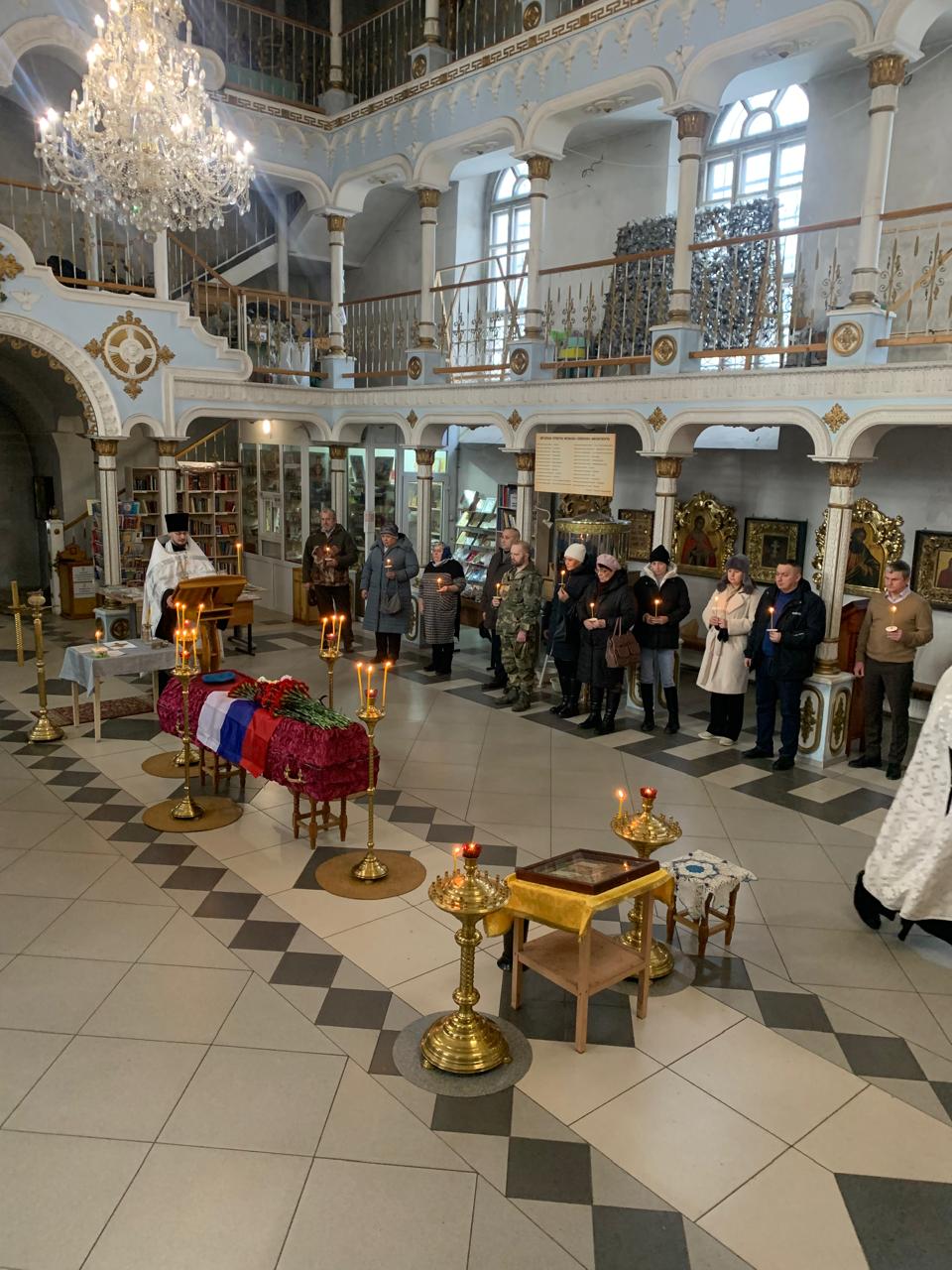 В храме о упокоении убиенного воина Алексея молились родные и близкие, а также официальные лица: зам главы администрации «Город Людиново и Людиновский район» Ольга Рысина, военный комиссар Людиновского и Жиздринского районов Владимир Воронцов, сопредседатель муниципального отделения «Отцы России» в городе Людиново Сергей Маркасов, прихожане собора и жители города.