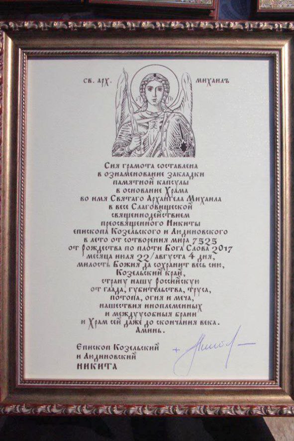 24 ноября, в Воскресный день, в селе Слаговищи, в храме Архистратига Божиего Михаила состоялось праздничное Богослужение, которое возглавил епископ Козельский и Людиновский Никита. По окончании Литургии в дар сельскому храму на молитвенную память был преподнесен образ Архистратига Божьего Михаила, который был доставлен в этот день настоятелем храма Преображения Господня села Нижние Прыски иереем Тихоном Худяковым.