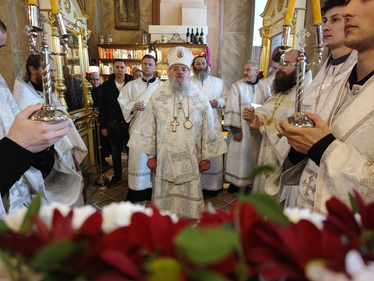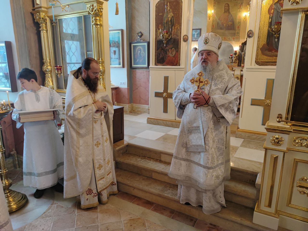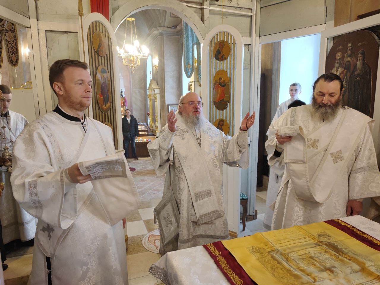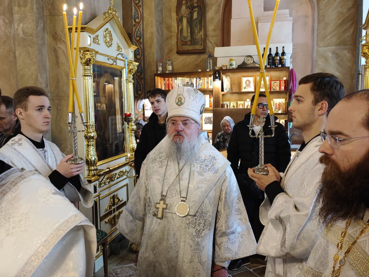 Архипастырю сослужили: иерей Тихон Худяков – настоятель прихода, иерей Симеон Худяков, иерей Виктор Носов, иерей Филипп Лисенков, иерей Евгений Чуркин, диакон Евгений Ковригин и диакон Валерий Волков.