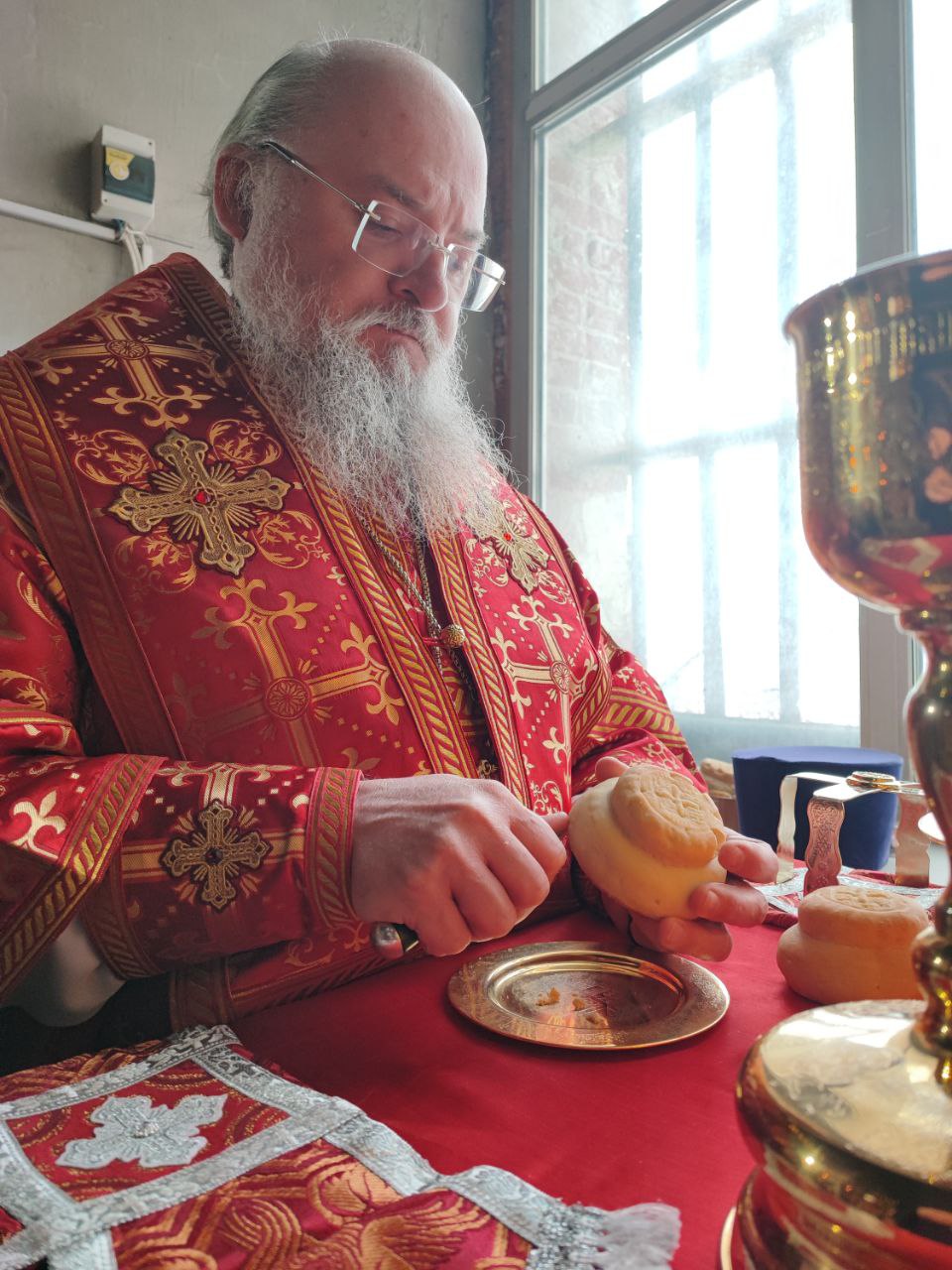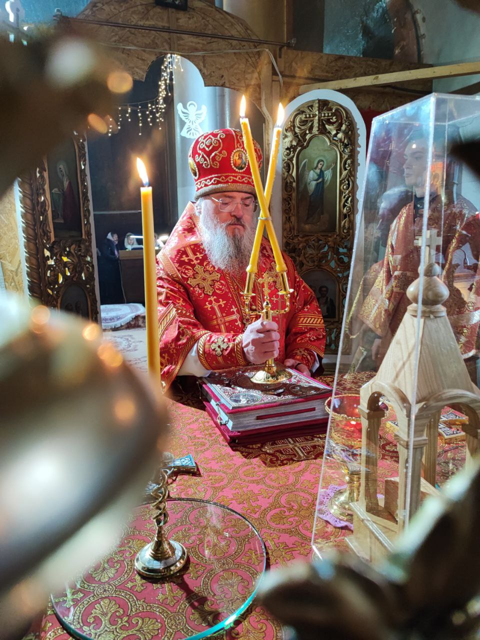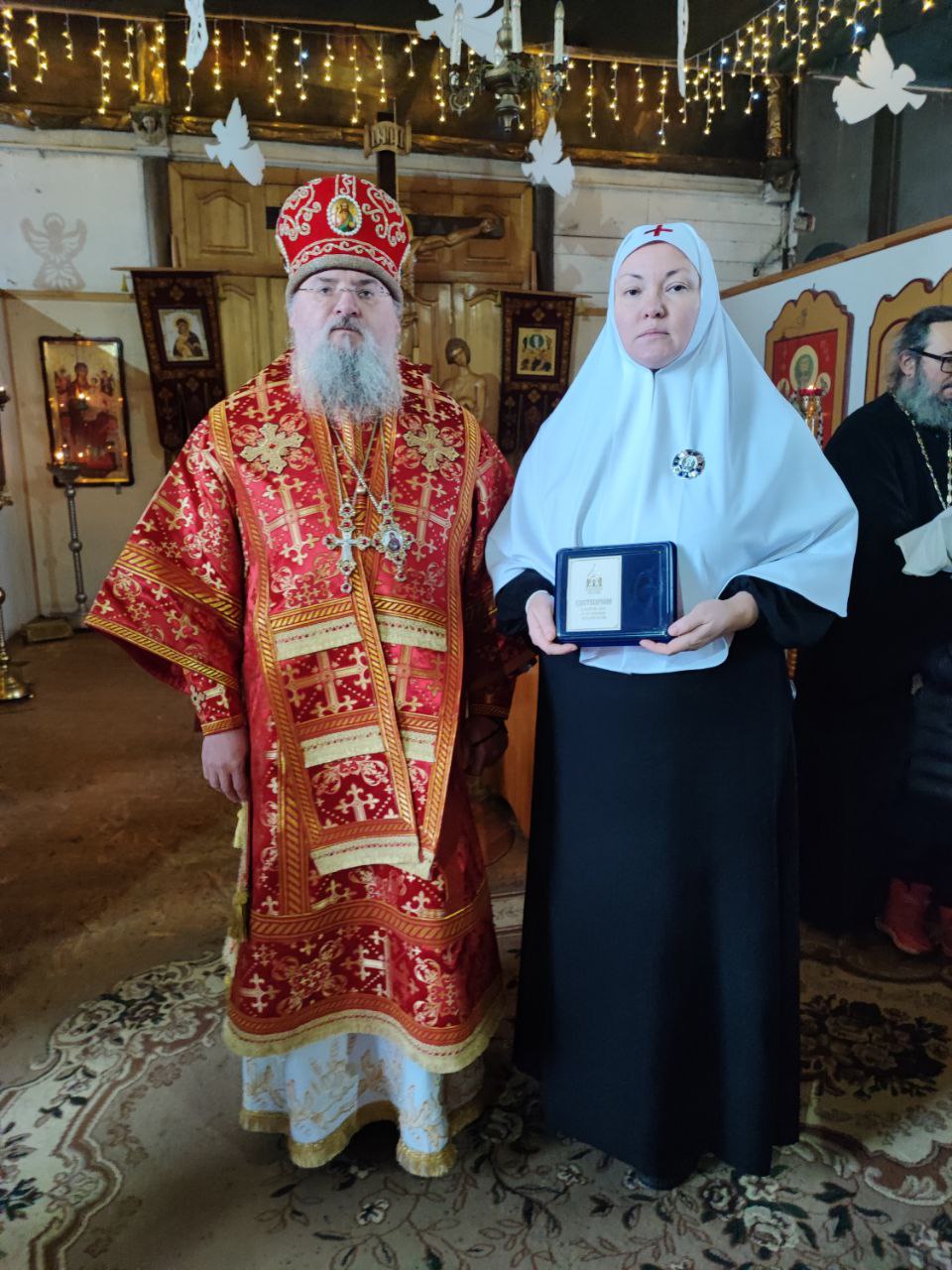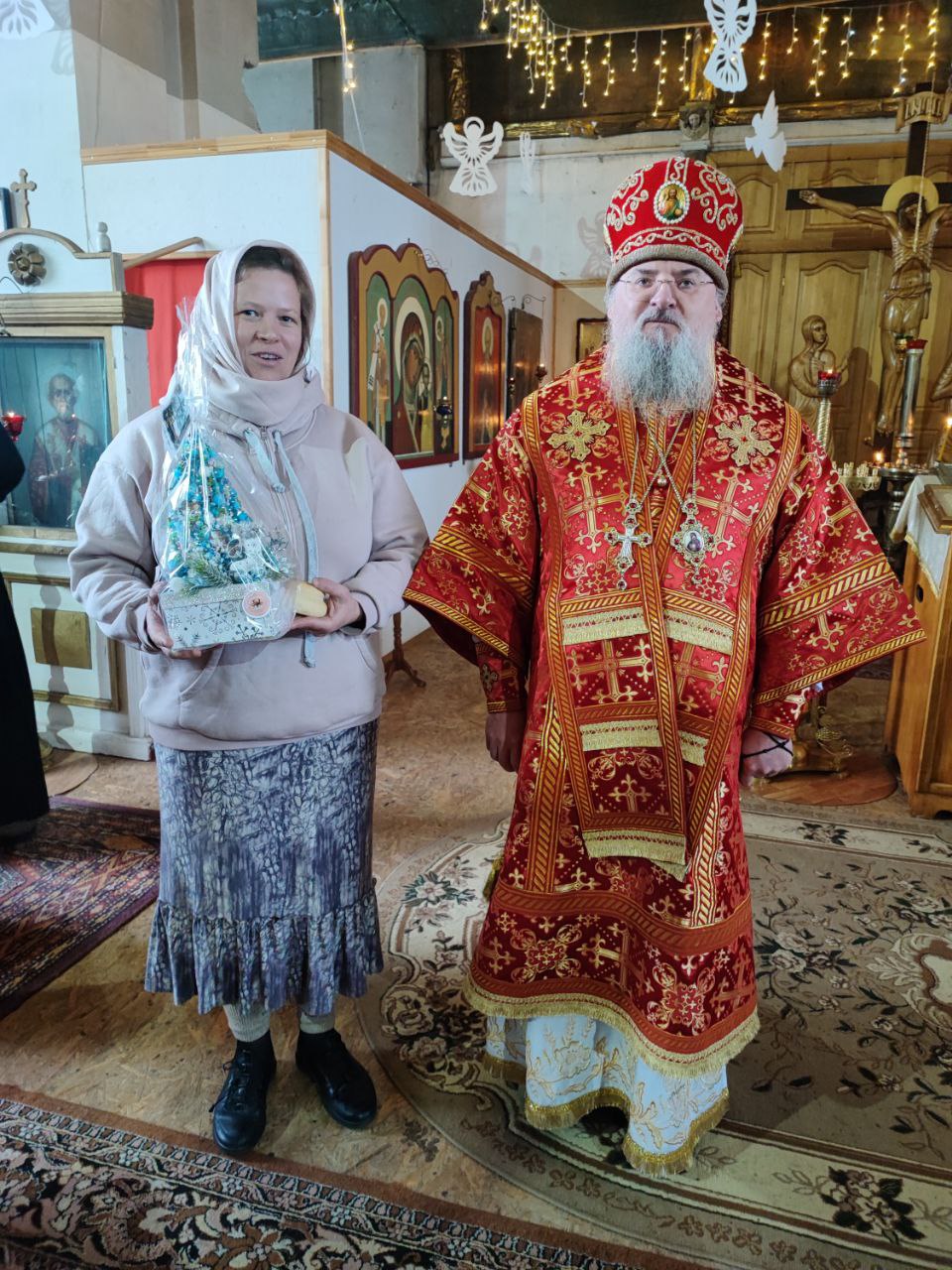 Также с именинами архипастырь поздравил регента хора Екатерину Юрель и преподнес ей святую просфору и подарок.