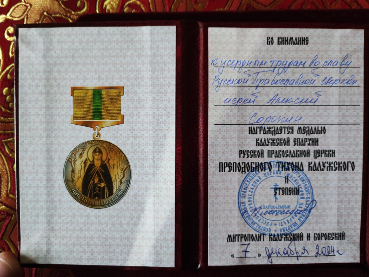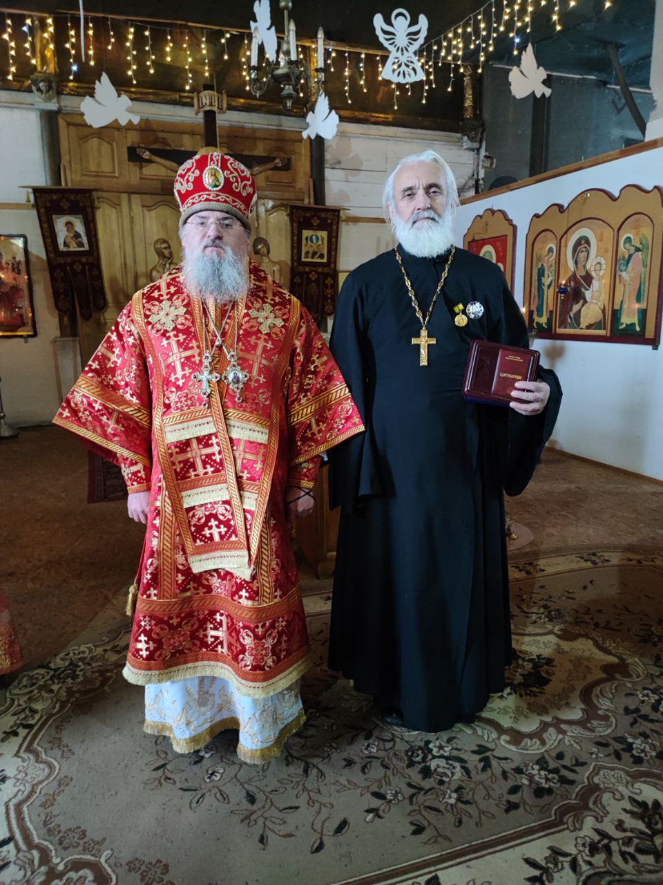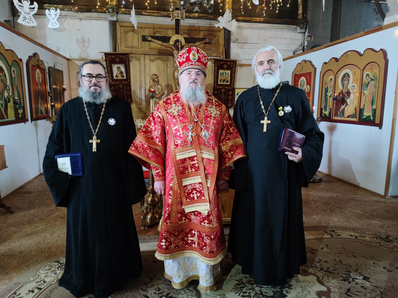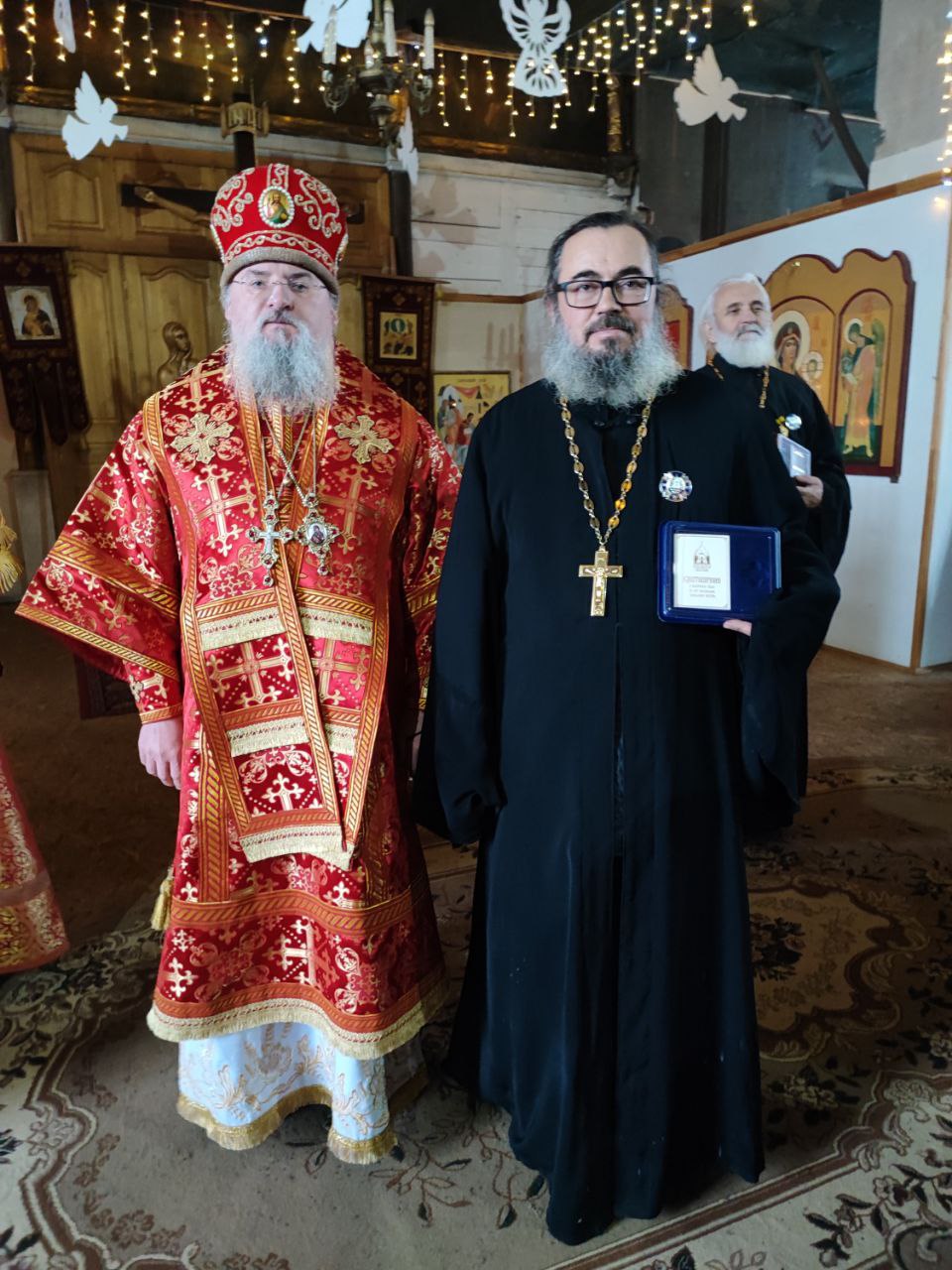 Архипастырь вручил церковные награды: по благословению Главы Митрополии митрополита Калужского и Боровского Климента, в связи с шестидесятипятилетием со дня рождения был удостоен настоятель прихода в честь Казанской иконы Божией Матери в селе Дудоровский иерей Алексий Сорокин. Памятным знаком десятилетия образования Козельской епархии были награждены: иерей Стахий Гайсин – настоятель храма святых мучениц Евдокии, Дарии, Дарии и Марии Дивеевских села Уколица, а также Елена Матвеевна Григорьева – старшая сестра Епархиального сестричества милосердия имени святой императрицы Александры Феодоровны.