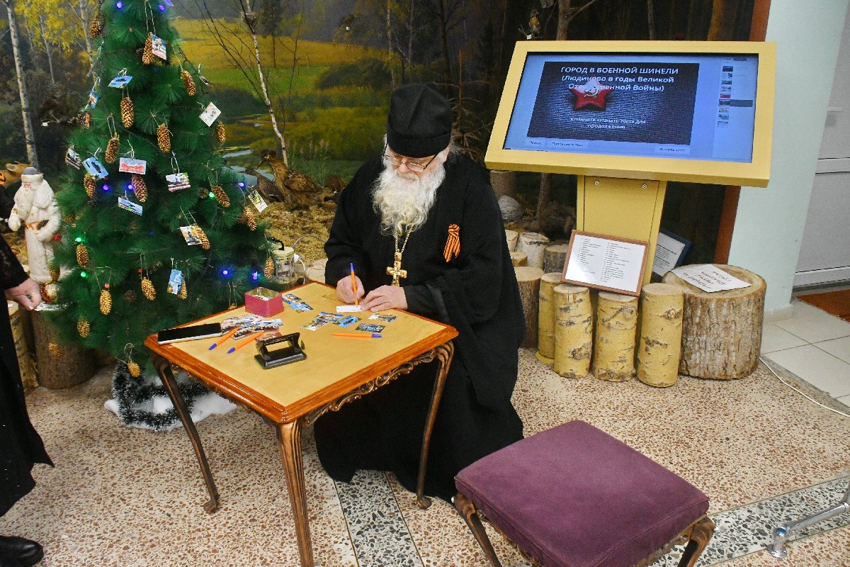 На первом этаже музея проходила тематическая акция ко Дню героев Отечества. На старинных военных открытках и открытках с изображениями видов города Людиново все желающие гости писали пожелания для воинов СВО, а затем эти открытки размещали на стоящей здесь же ёлочке. После проведения акции все открытки с добрыми пожеланиями от людиновцев отправятся нашим бойцам в зону СВО. Здесь же всем гостям прикреплялась Георгиевская ленточка – символ праздника.
