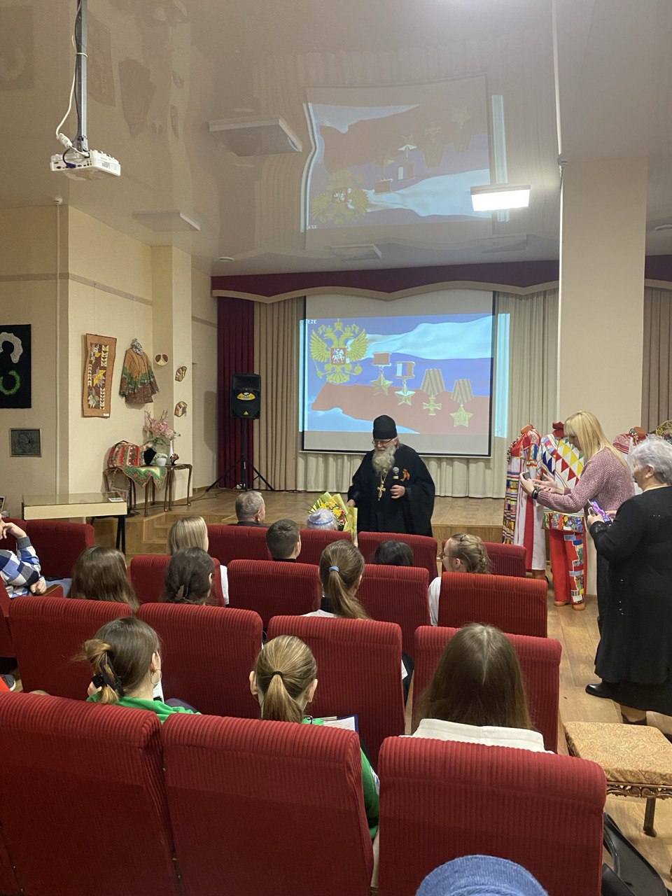 В заключение мероприятия ведущая, отметив, что предстоящий 2025 год объявлен Годом 80 – летия Победы в Великой Отечественной войне, а также годом мира и единства в борьбе с нацизмом, предоставила слово протоиерею Алексию Жиганову. Отец Алексий поздравил всех с праздником – Днём героев Отечества и напомнил, что: «В этот день почитается наш заступник земли Русской святой великомученик Георгий Победоносец. Мы все вместе куём Победу: кто – то на передовой, кто — то в тылу. Главное, что в настоящее время все мы едины, значит, Победа обязательно будет!»