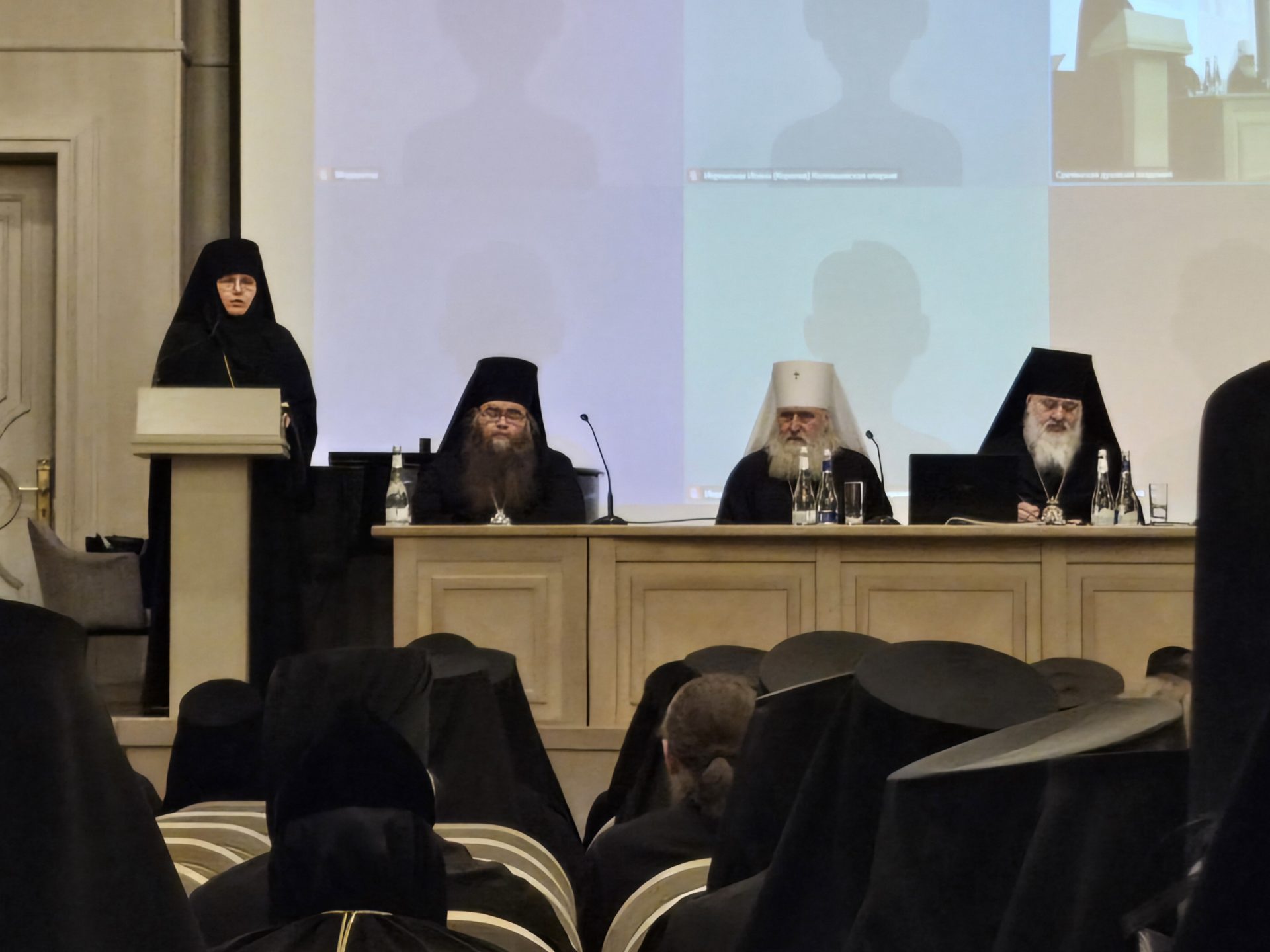 Открывая собрание, председатель Синодального отдела по монастырям и монашеству передал участникам благословение Святейшего Патриарха Московского и всея Руси Кирилла и пожелание Его Святейшества всесторонне обсудить в атмосфере братской встречи вопросы, волнующие современное монашество. После краткого приветствия митрополит Феогност предоставил слово игумении Иулиании. О прошедших в епархиях мероприятиях XIV направления «Древние монашеские традиции в условиях современности» регионального этапа Международных образовательных Рождественских чтений участникам собрания рассказали настоятель Николо-Шартомского мужского монастыря Шуйской епархии архимандрит Филипп (Понамарчук); настоятель Свято-Троицкого Холковского мужского монастыря Белгородской епархии игумен Никодим (Мирошниченко); казначей Троицкого мужского монастыря Мичуринской епархии иеромонах Никон (Машканцев). О деятельности монастырей по оказанию помощи участникам специальной военной операции сообщила собравшимся игумения Елисавета (Позднякова), настоятельница Марфо-Мариинской обители милосердия. Председатель рабочей группы Коллегии Синодального отдела по сбору материалов о новомучениках и исповедниках Церкви Русской и подвижниках благочестия, почитаемых в монастырях, епископ Видновский Тихон, наместник Екатерининского ставропигиального монастыря познакомил собравшихся с ключевыми этапами деятельности группы и мероприятиями, которые провели ставропигиальные обители по увековечиванию памяти новомучеников и исповедников в 2024 году. Владыка также анонсировал издание первого тома двухтомника «Новомученики и исповедники Церкви Русской, особо почитаемые в ставропигиальных монастырях (Январь‒Июнь)». Тему увековечения памяти новомучеников и исповедников Церкви Русской продолжил настоятель Петровского мужского монастыря Ростова Великого, игумен Климент (Новиков), благочинный монастырей Ярославской епархии. По благословению Святейшего Патриарха Московского и всея Руси Кирилла в течение уже десяти лет представители Синодального отдела посещают с инспекционными поездками монастыри. Рассказать об этой деятельности попросили игумена Исаакия (Иванова), благочинного монастырей Рязанской епархии, настоятеля Иоанно-Богословского монастыря в селе Пощупово. Вслед за выступлением отца Исаакия игумения Иулиания пригласила игумена Льва (Грызуна), настоятеля мужского монастыря «Крестовая пустынь» Сочинской епархии рассказать о последней по времени поездке делегации монашествующих в монастыри Египта. Об актуальных правовых вопросах проинформировала участников собрания игумения Ксения (Чернега), руководитель Правового Управления Московской Патриархии, настоятельница Алексеевского ставропигиального женского монастыря Москвы. О целях и задачах информационной работы в современных условиях рассказал участникам собрания пресс-секретарь Синодального отдела по монастырям и монашеству архимандрит Мелхиседек (Артюхин), настоятель Московского подворья Свято-Введенского монастыря Оптина пустынь. Затем слово было предоставлено главному редактору сайта «Монастырский вестник», Екатерине Орловой. Заместитель председателя Синодального отдела по монастырям и монашеству архимандрит Стефан (Тараканов) выступил с кратким сообщением о деят