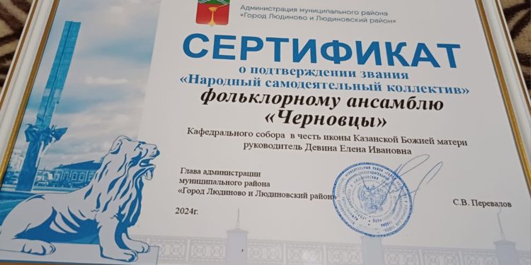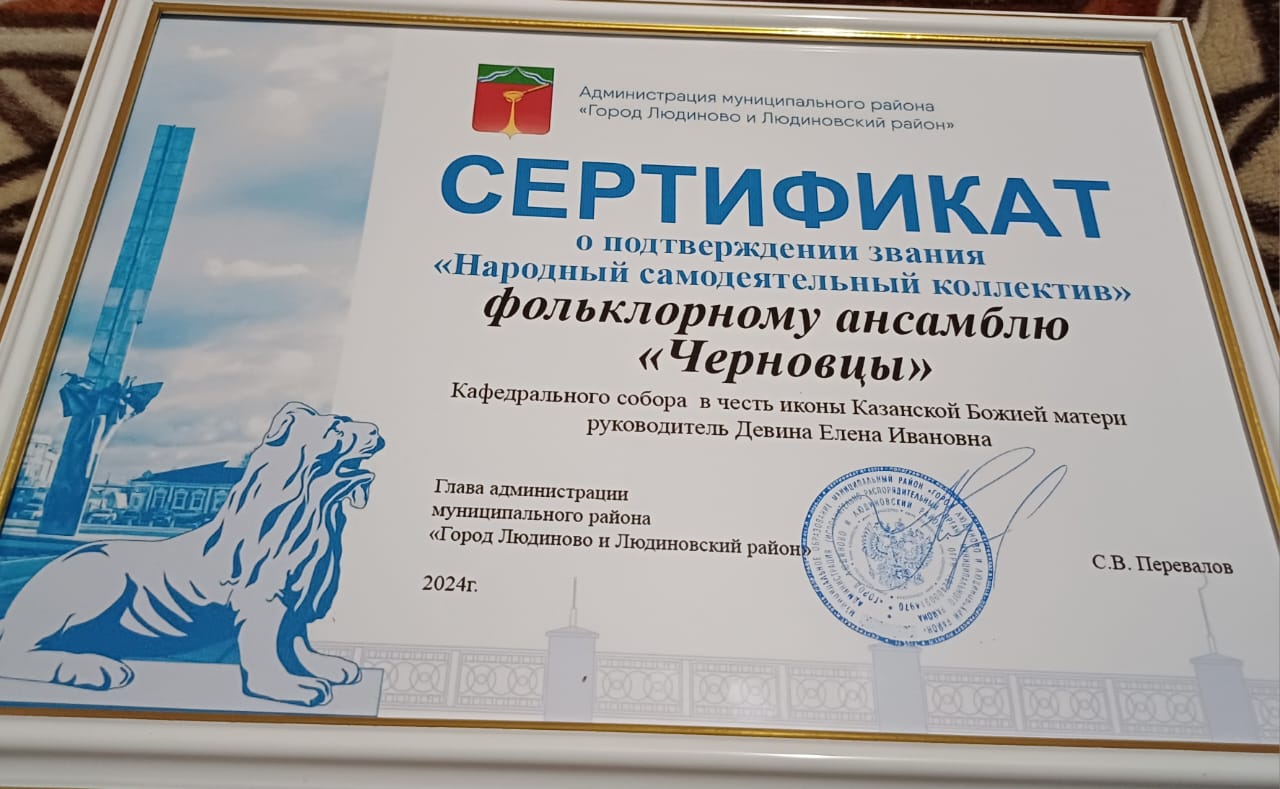 Фольклорный ансамбль «Черновцы» при Казанском соборе города Людиново получил сертификат «Народного самодеятельного коллектива»