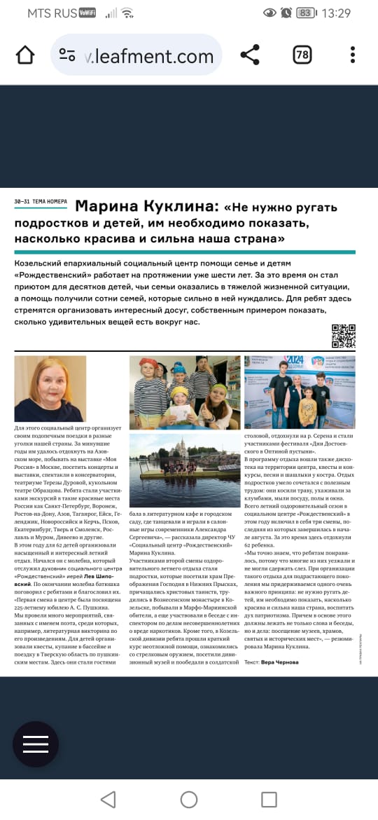 В информационно-аналитическом журнале Социальная защита в России вышла статья о Козельском епархиальном социальном центре «Рождественский»