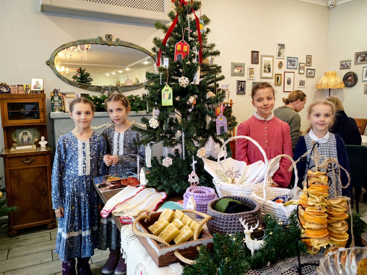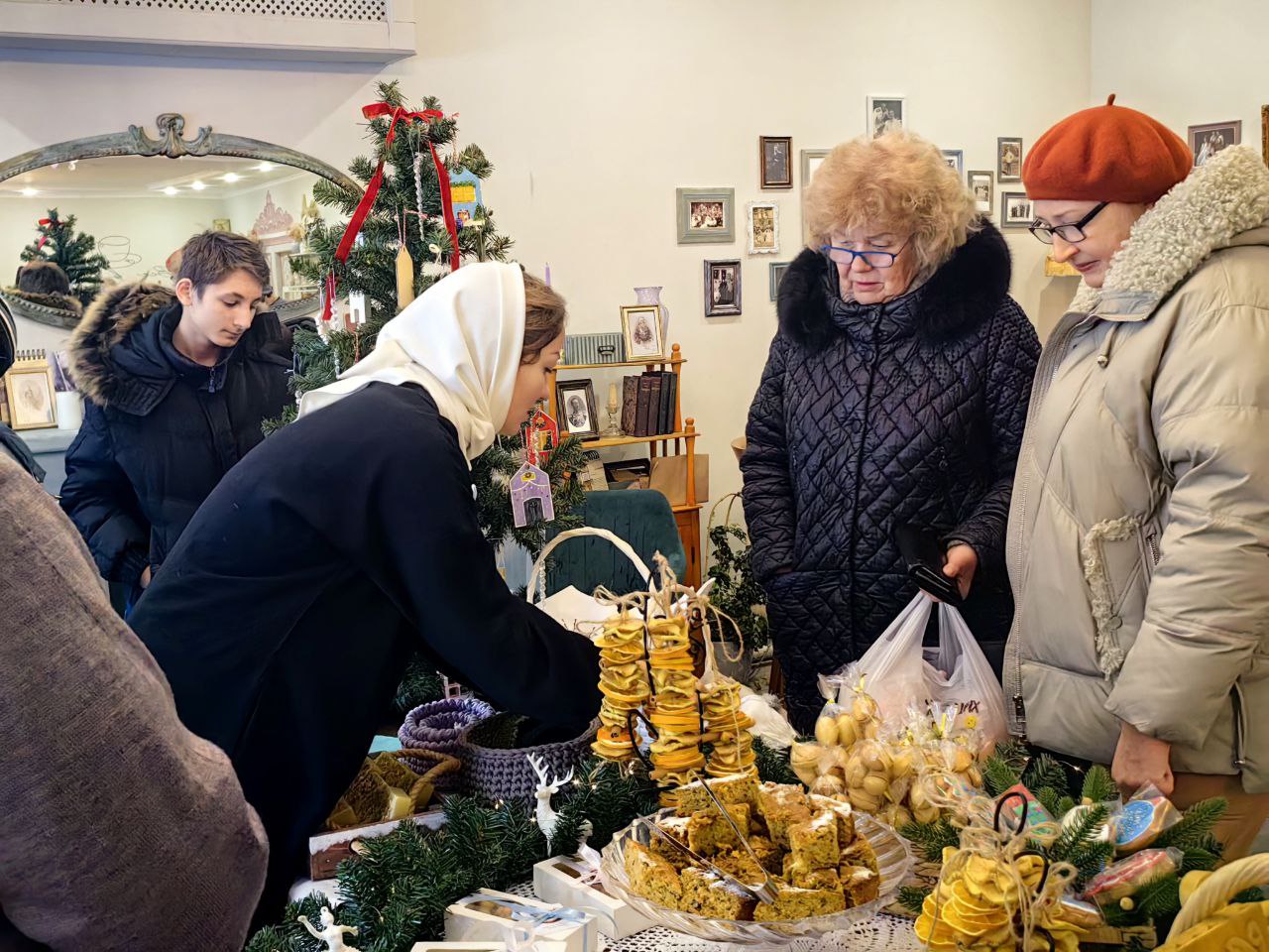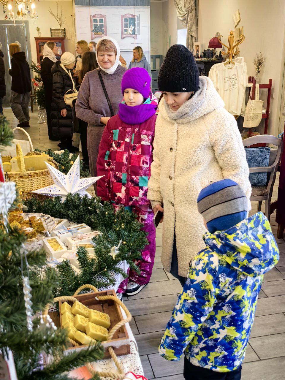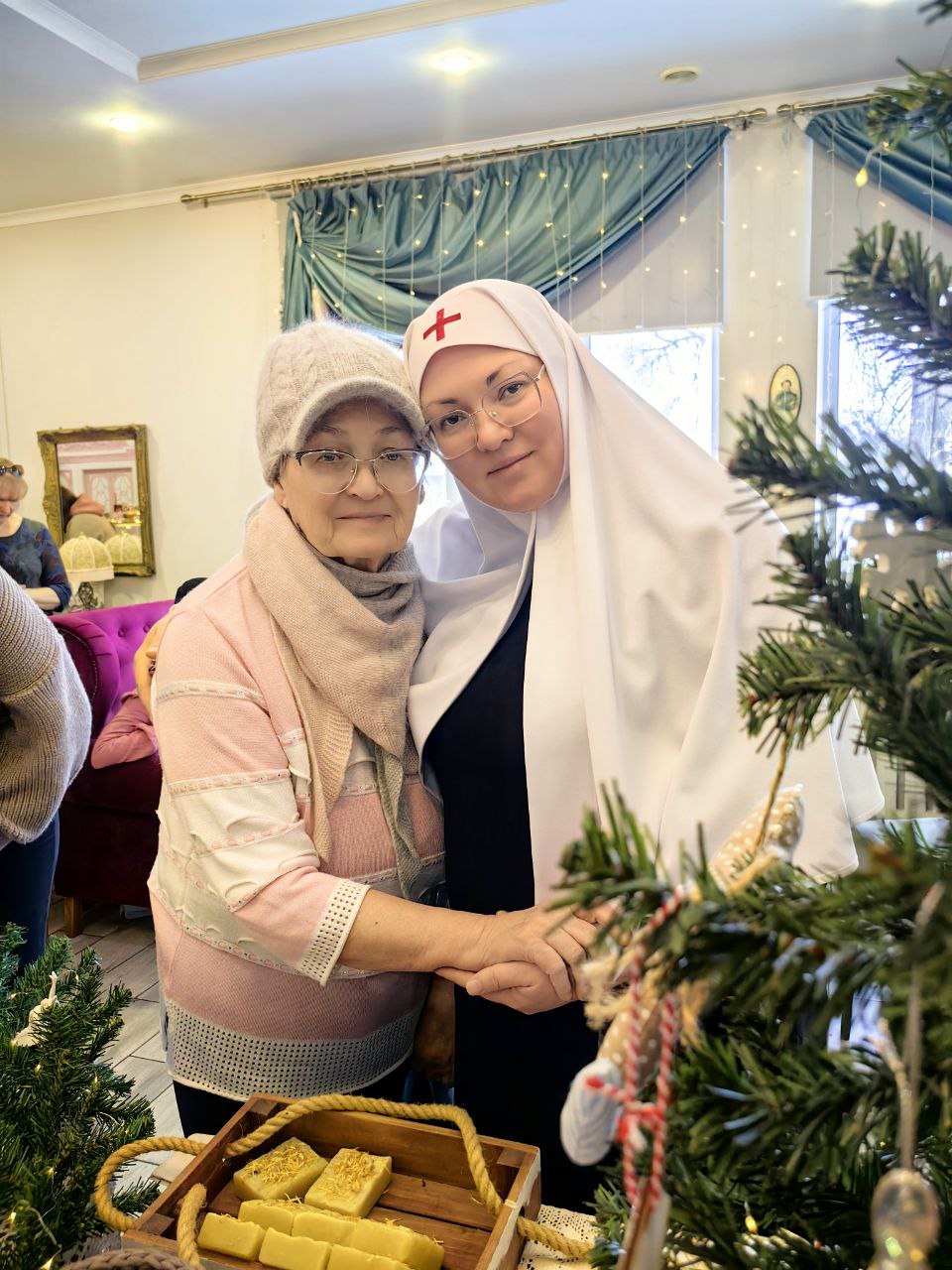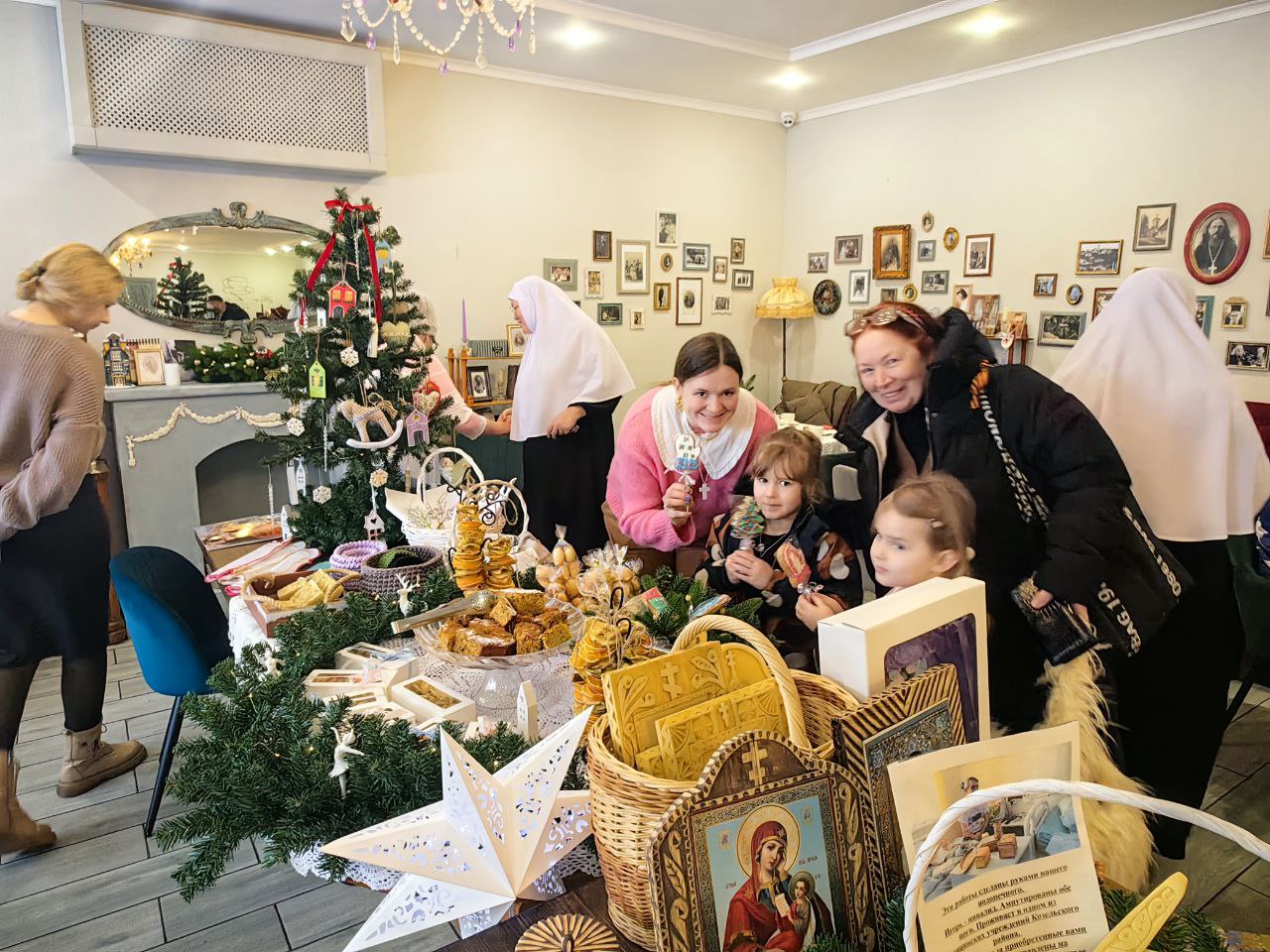 Сестры милосердия представили на ярмарке изделия ручной работы, которые изготовили своими силами: тканевые игрушки на ёлку, гипсовые раскрашенные рождественские домики, ароматное мыло ручной работы, изысканный морковно-мандариновый кекс, расписные имбирные пряники и печенья, домашние орешки со сгущенкой и гирлянды сухофруктов, привнесших в пространство ярмарки зимний ванильно-цитрусовый аромат.