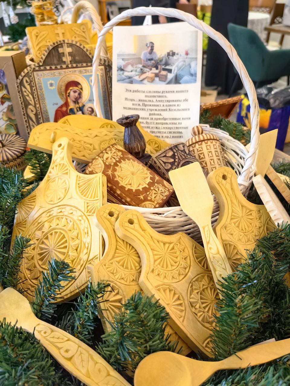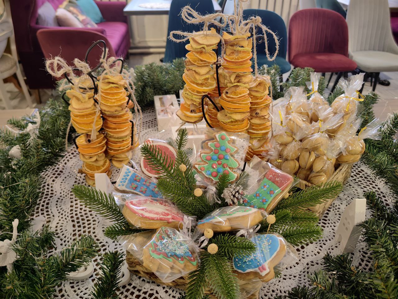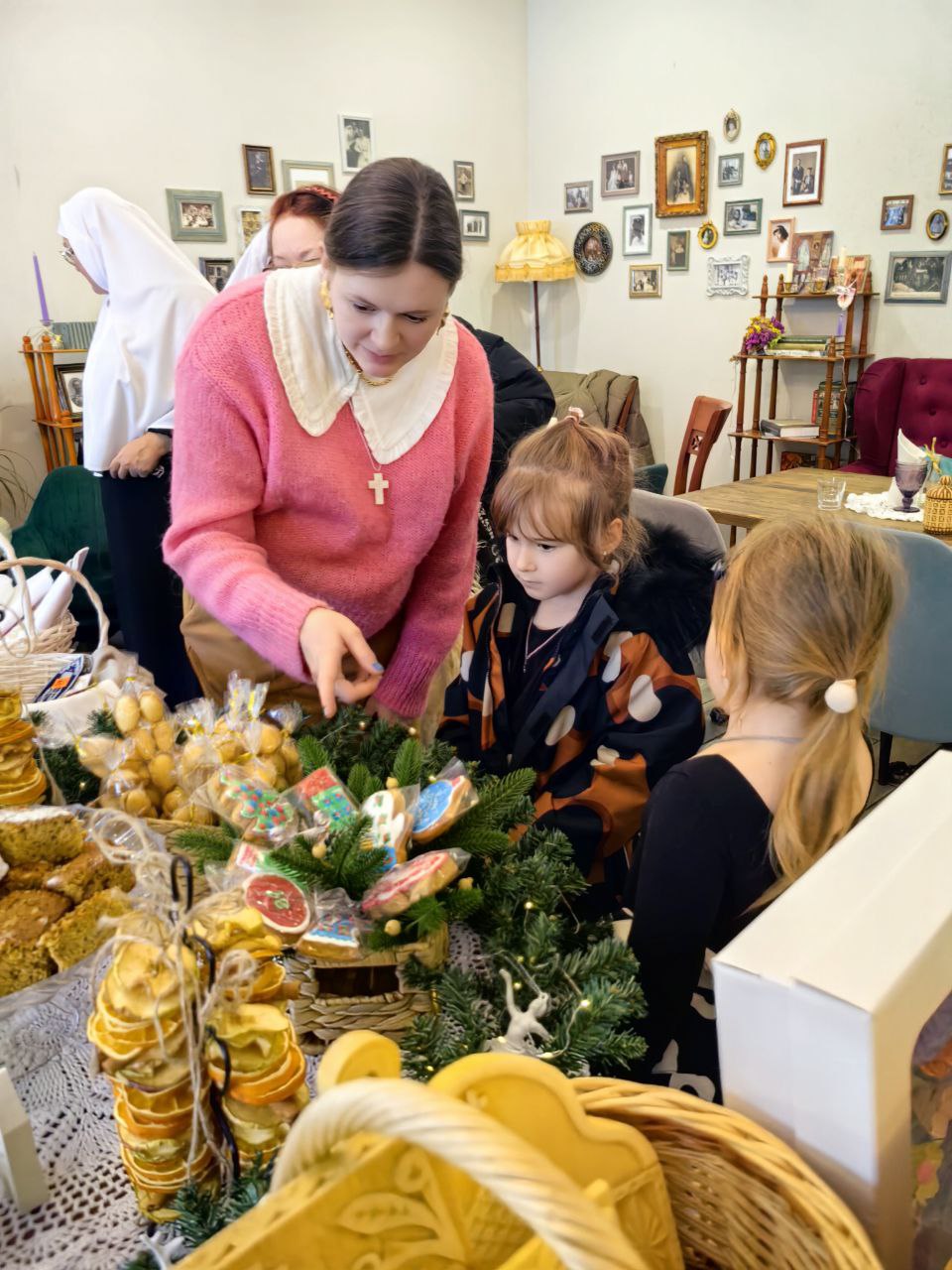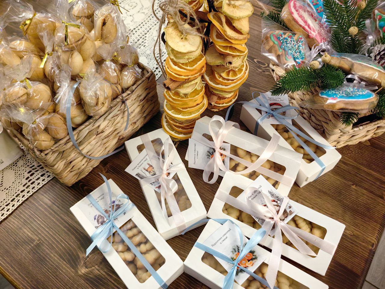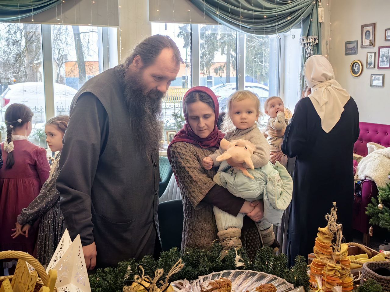 Сестры милосердия представили на ярмарке изделия ручной работы, которые изготовили своими силами: тканевые игрушки на ёлку, гипсовые раскрашенные рождественские домики, ароматное мыло ручной работы, изысканный морковно-мандариновый кекс, расписные имбирные пряники и печенья, домашние орешки со сгущенкой и гирлянды сухофруктов, привнесших в пространство ярмарки зимний ванильно-цитрусовый аромат.
