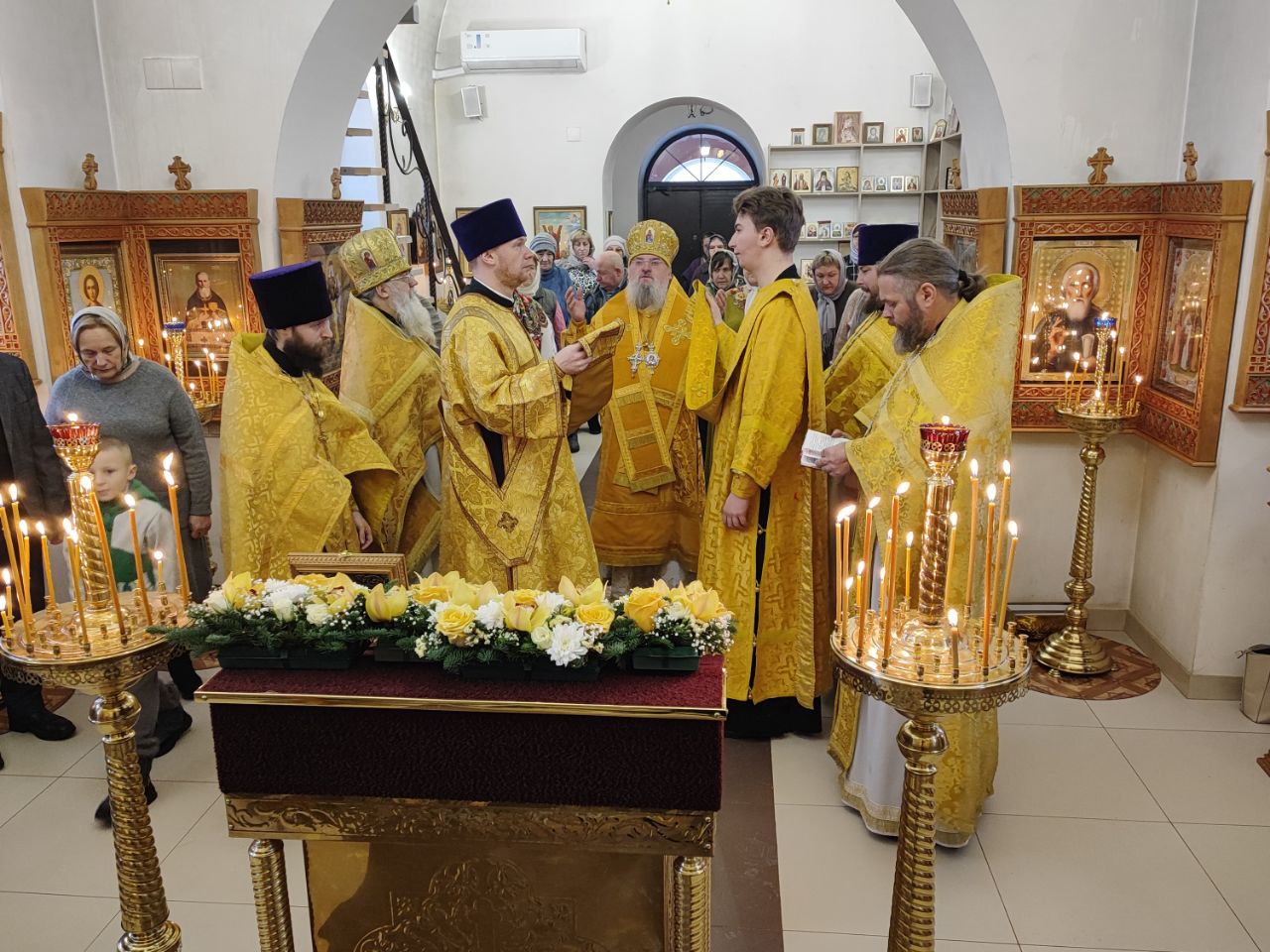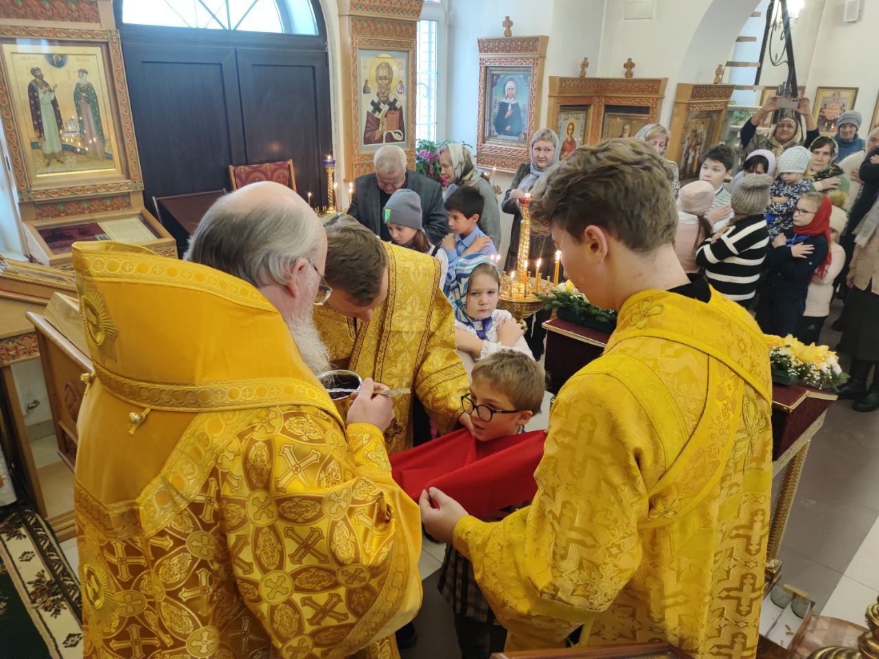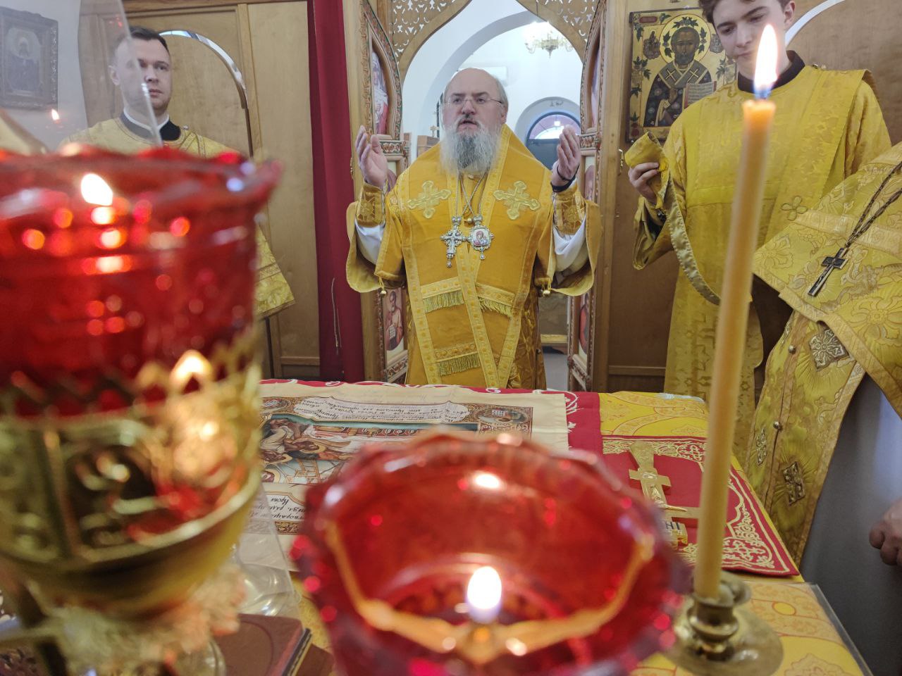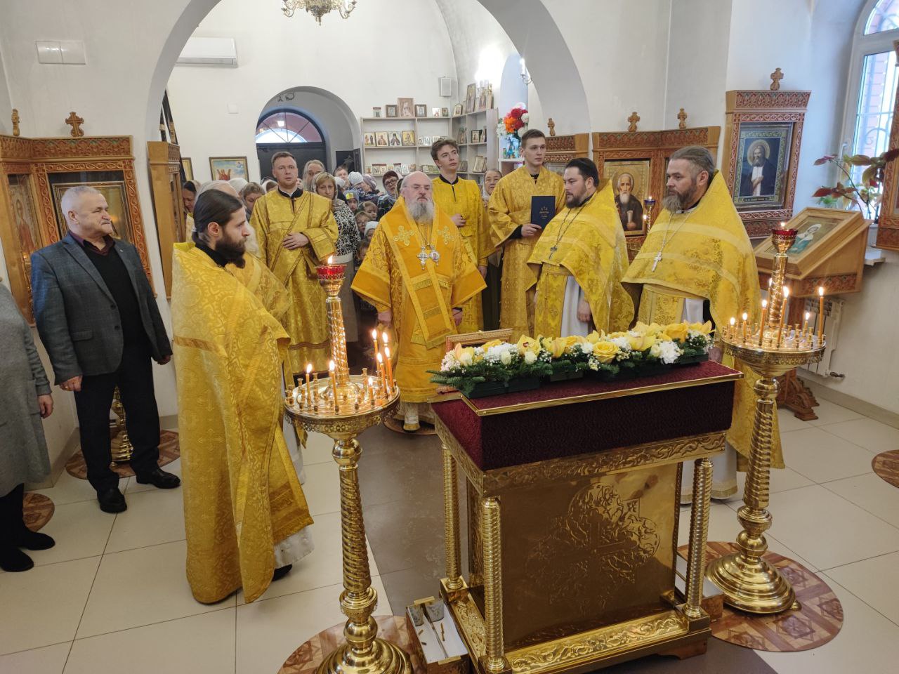 Архипастырю сослужили: протоиерей Алексий Жиганов, протоиерей Антоний Хатунцев, иерей Алексий Ефименков – благочинный округа, иерей Алексий Скрипкин – настоятель храма, диакон Евгений Ковригин и диакон Никита Агарев.