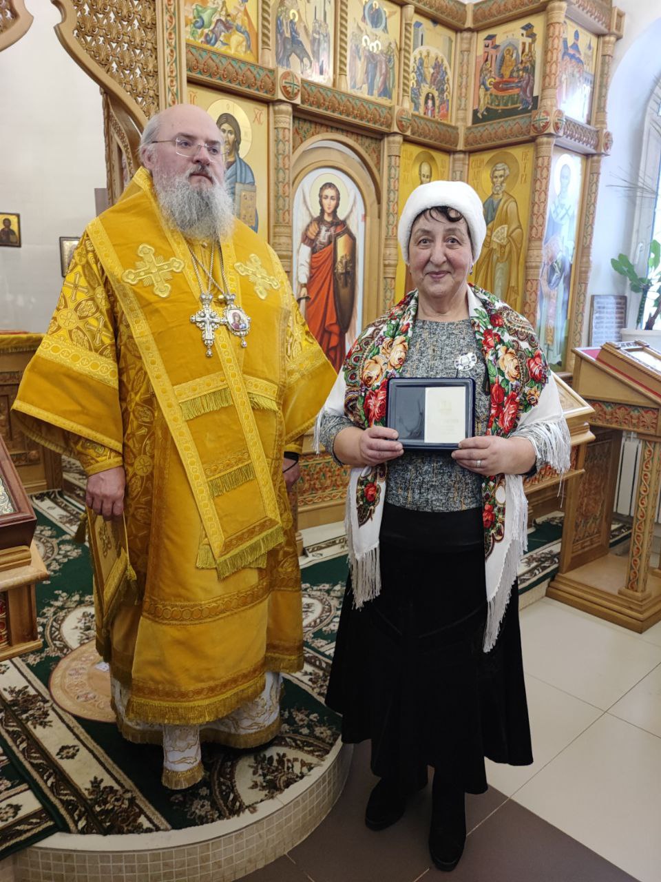 Памятный знак 10-летия образования Козельской епархии владыка вручил настоятелю храма иерею Алексию Скрипкину и его помощнице Зарубиной Галине Алексеевне.