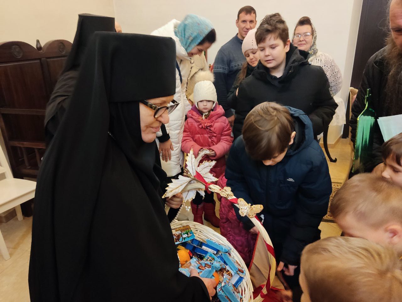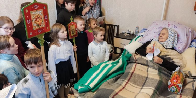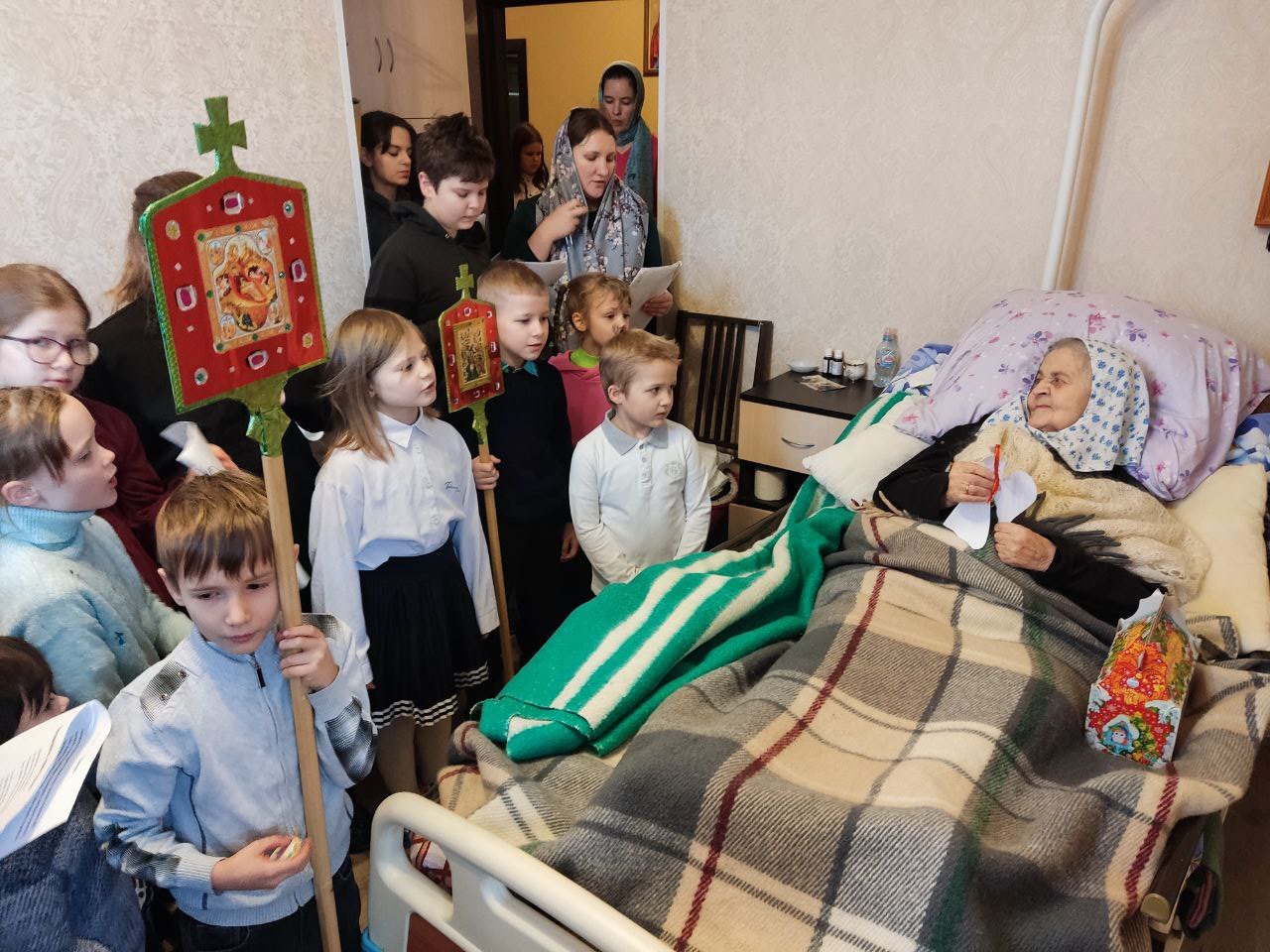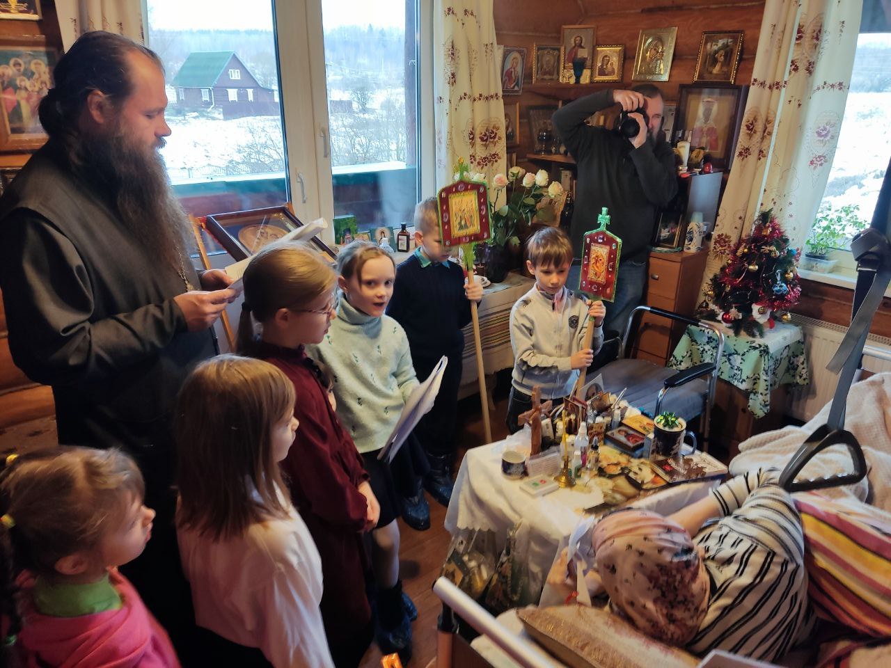 Так же, важной целью наших поездок является посещение больных и пожилых людей, в богадельнях, в селах Стенино и Клыково, которые особенно нуждаются во внимании и общении в эти праздничные дни. Старичков, помимо пения колядок, порадовали сладкими подарками, а ещё вручили бумажных ангелов, подписанными изречениями святых отцов.