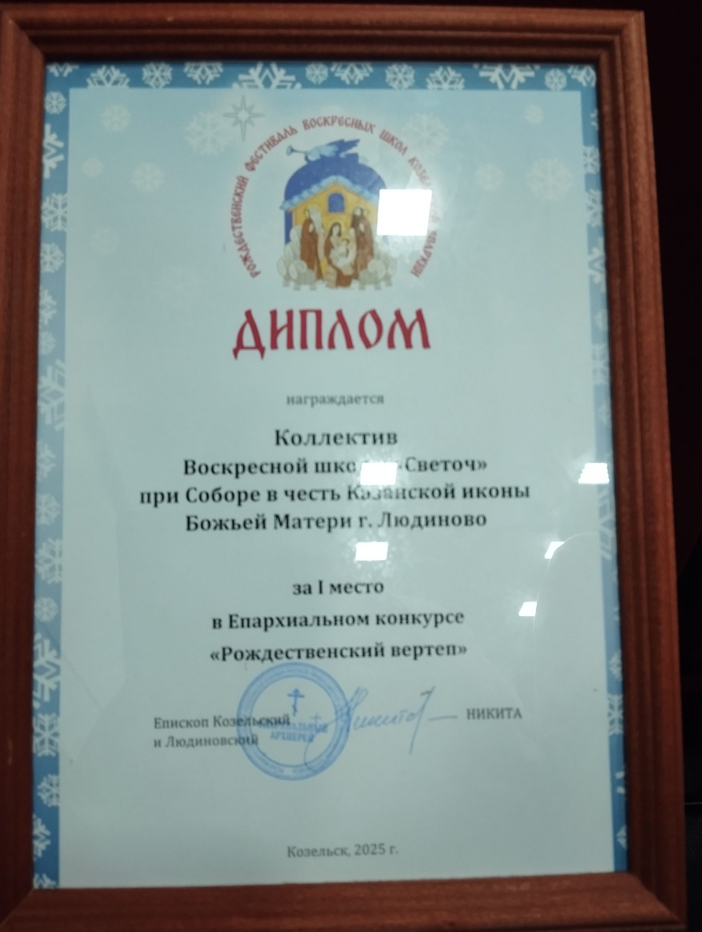 Во второй части торжества был блок награждения, где среди многих дипломантов, участникам ВШ «Светоч» был вручён диплом за первое место в номинации «Коллективный Рождественский вертеп» и подарок. И хотя диплом вручён воскресной школе, но победа принадлежит всему приходу Казанского собора, кто участвовал в устроении Рождественского вертепа в ограде Казанского собора города Людиново: братчики Прихода, сотрудники церковного музея, педагоги и воспитанники ВШ.