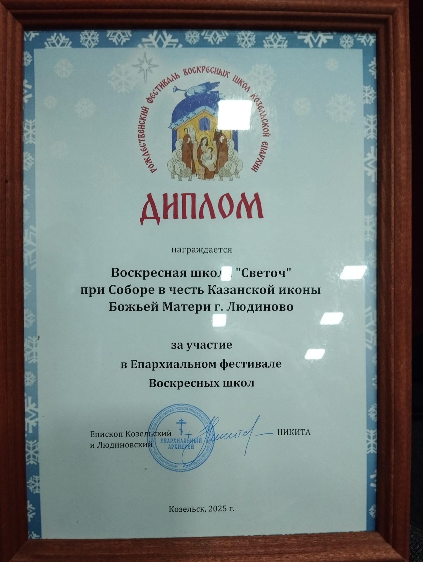 12 января 2025 года в Козельске по благословению Епископа Козельского и Людиновского Никиты прошел Епархиальный Рождественский фестиваль, в котором, среди других образовательных православных организаций, приняли участие воспитанники и педагоги Воскресной школы «Светоч» Казанского собора города Людиново.