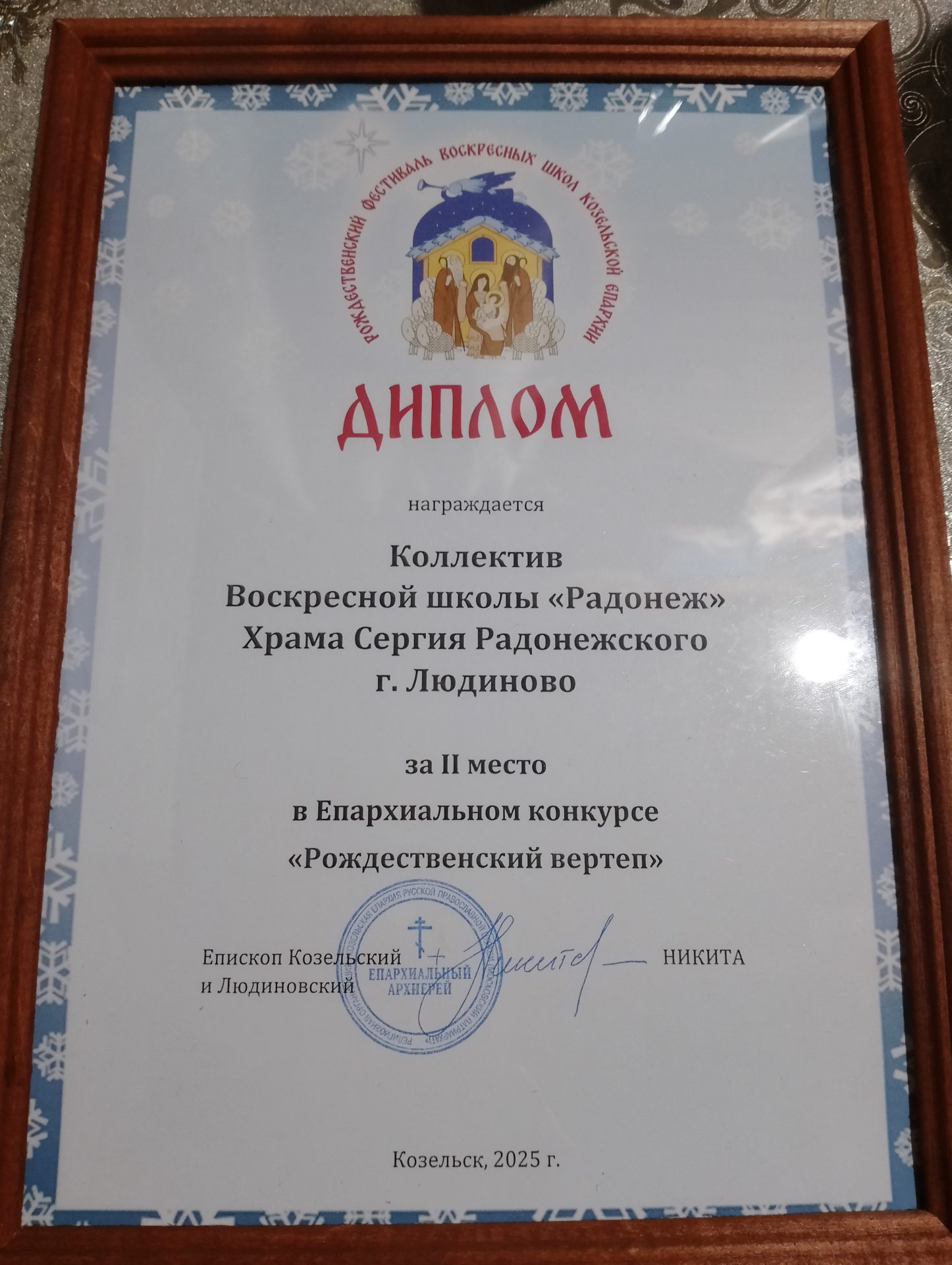 12 января 2025 года в Козельске по благословению Епископа Козельского и Людиновского Никиты прошел Епархиальный Рождественский фестиваль, в котором, среди других образовательных православных организаций, приняли участие воспитанники и педагоги Воскресной школы «Радонеж» храма преподобного Сергия Радонежского города Людиново. Владыка Никита наградил дипломантов и участников фестиваля и преподнес памятные подарки. Диплом за I место получили Михалевы Анастасия и София, II место заняла Чеботаева Злата, участники фестиваля так же были награждены дипломами: Жиганов Никита, Дюжев Иоанн, Царькова Александра, Шаршавенкова Мария, Засова Полина. Коллектив Воскресной школы «Радонеж» храма Сергия Радонежского награжден дипломом за II место в Епархиальном конкурсе «Рождественский вертеп».