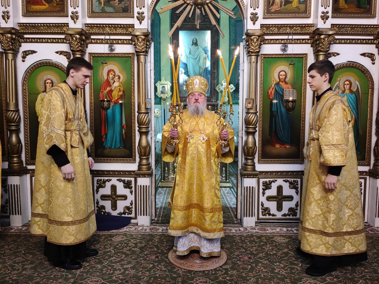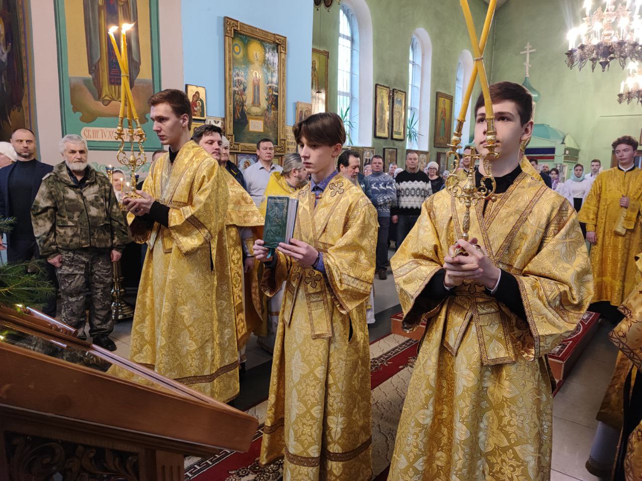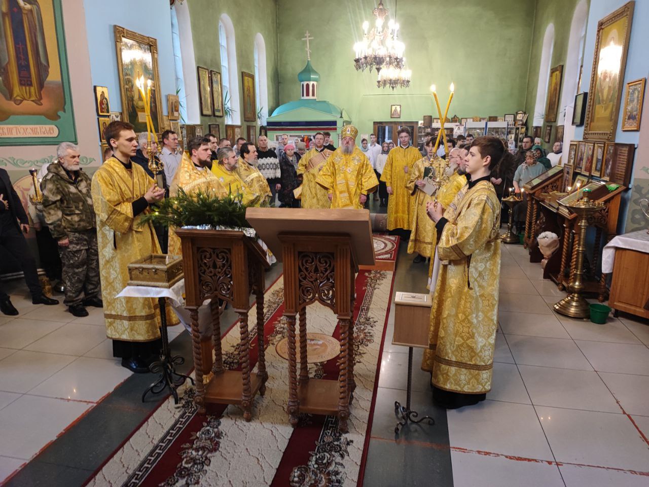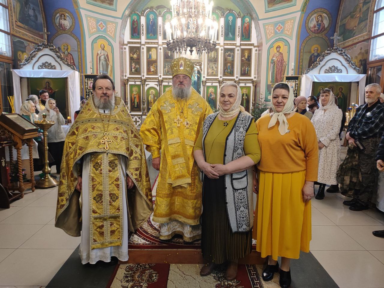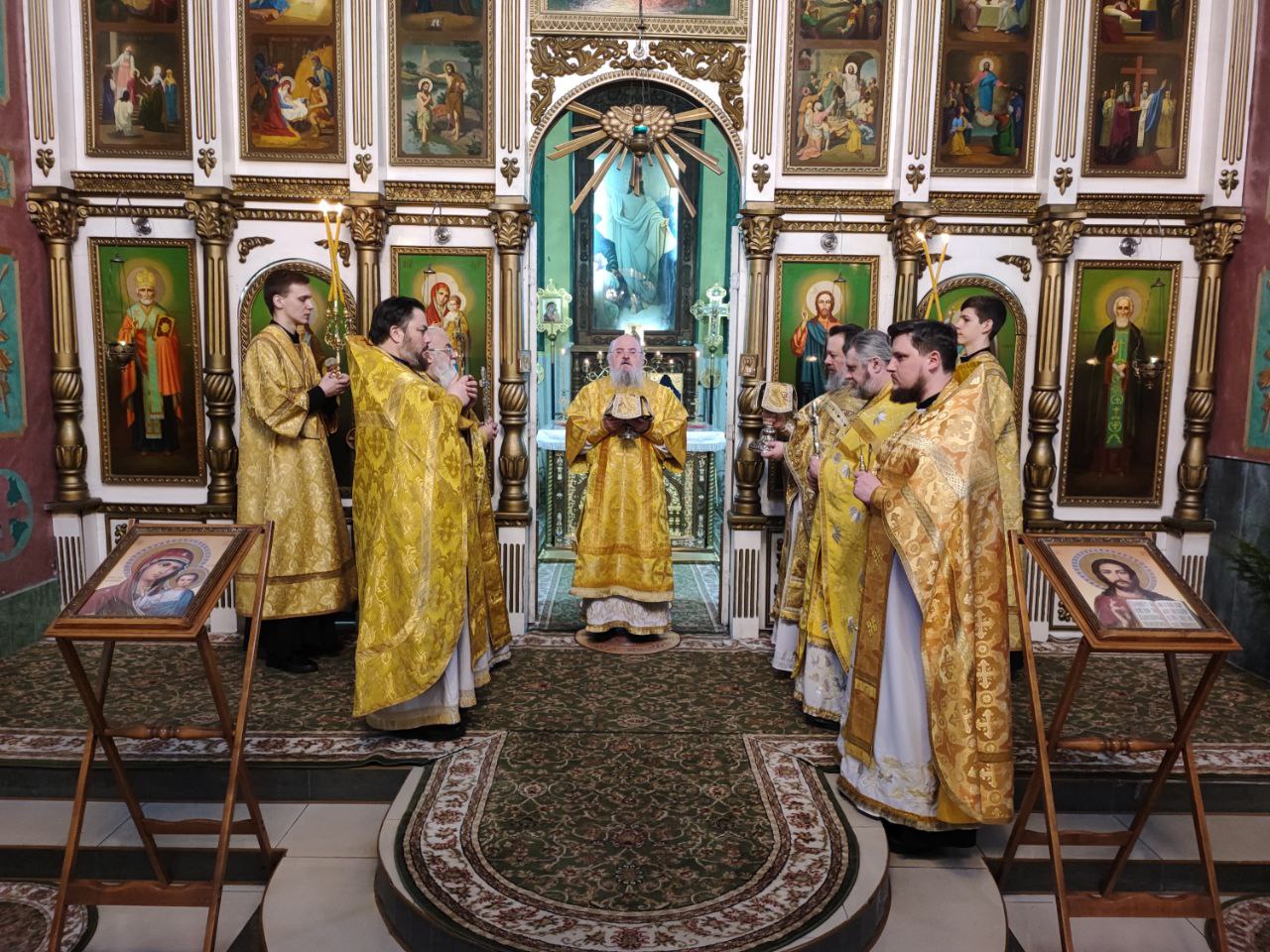 За Божественной литургией Его Преосвященству сослужили: протоиерей Алексий Жиганов – духовник епархии, благочинный округа; настоятель храма протоиерей Василий Биляк; протоиерей Михаил Карпенко, протоиерей Антоний Хатунцев, иерей Иоанн Майоров, диакон Евгений Ковригин и диакон Никита Агарев.