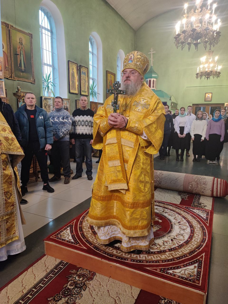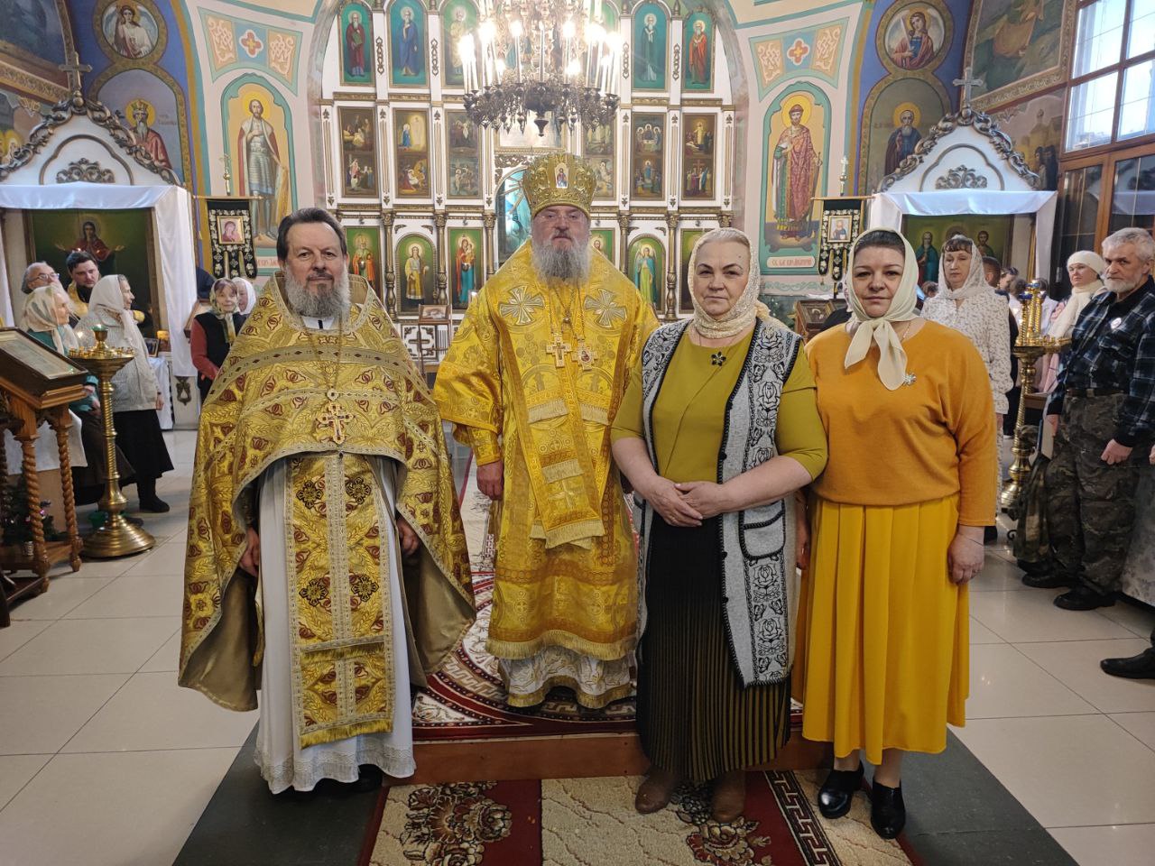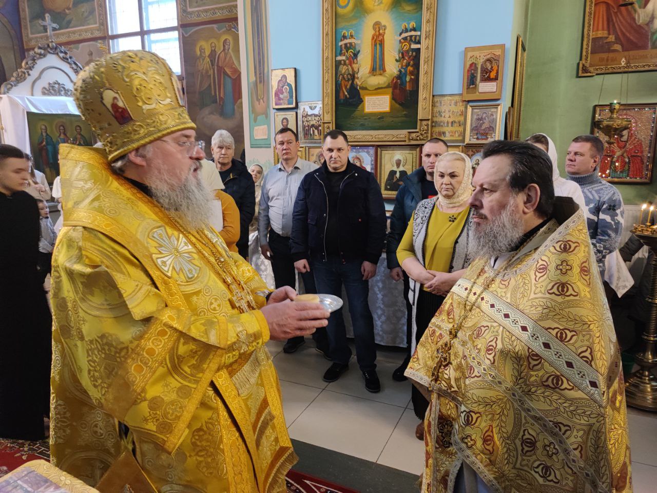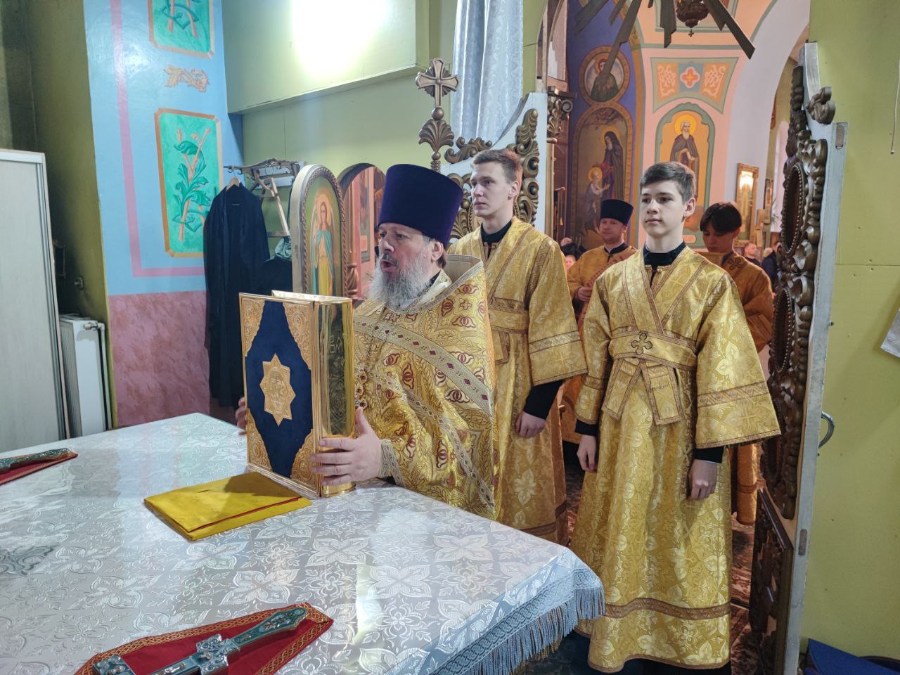За Божественной литургией Его Преосвященству сослужили: протоиерей Алексий Жиганов – духовник епархии, благочинный округа; настоятель храма протоиерей Василий Биляк; протоиерей Михаил Карпенко, протоиерей Антоний Хатунцев, иерей Иоанн Майоров, диакон Евгений Ковригин и диакон Никита Агарев.