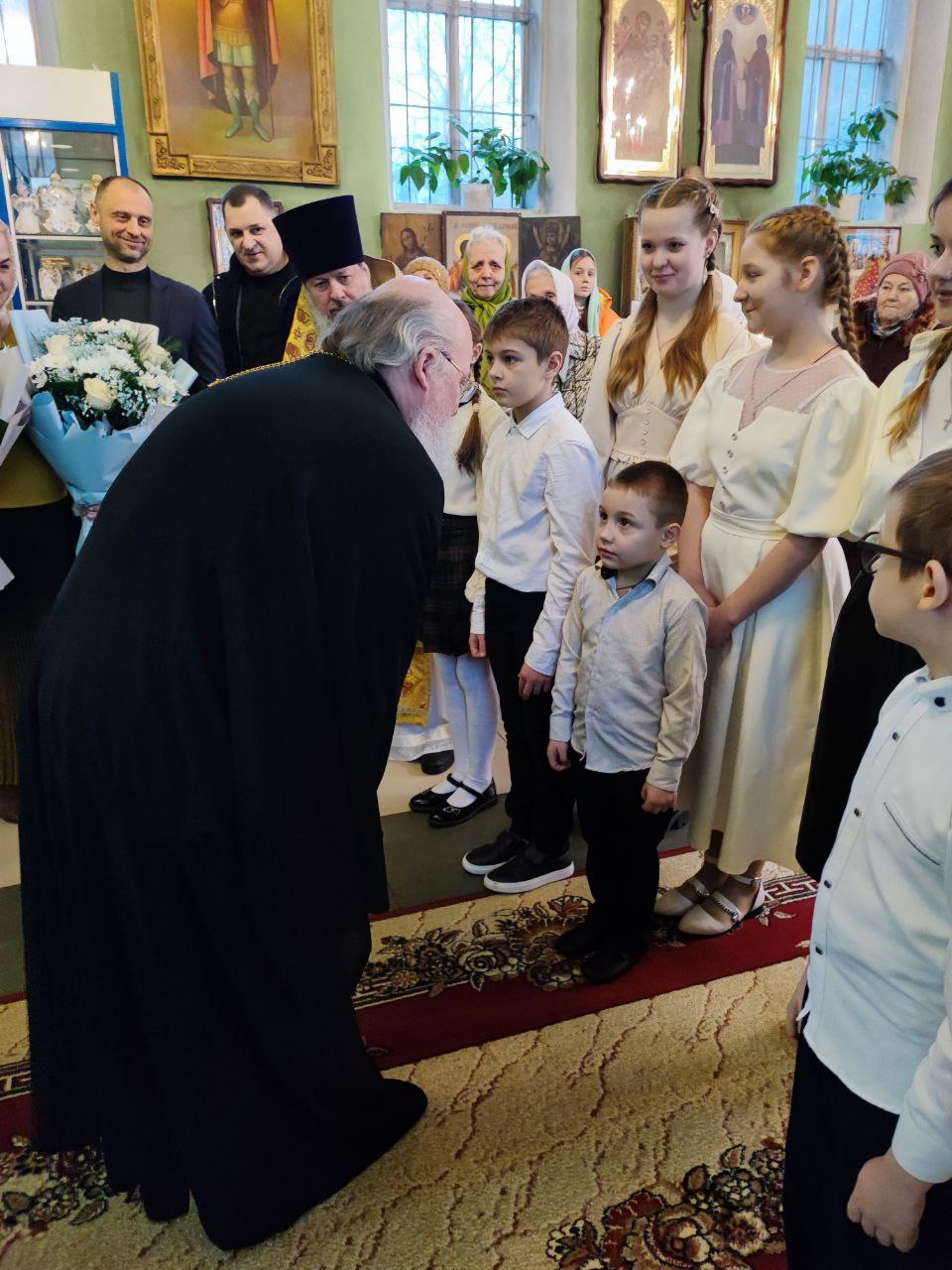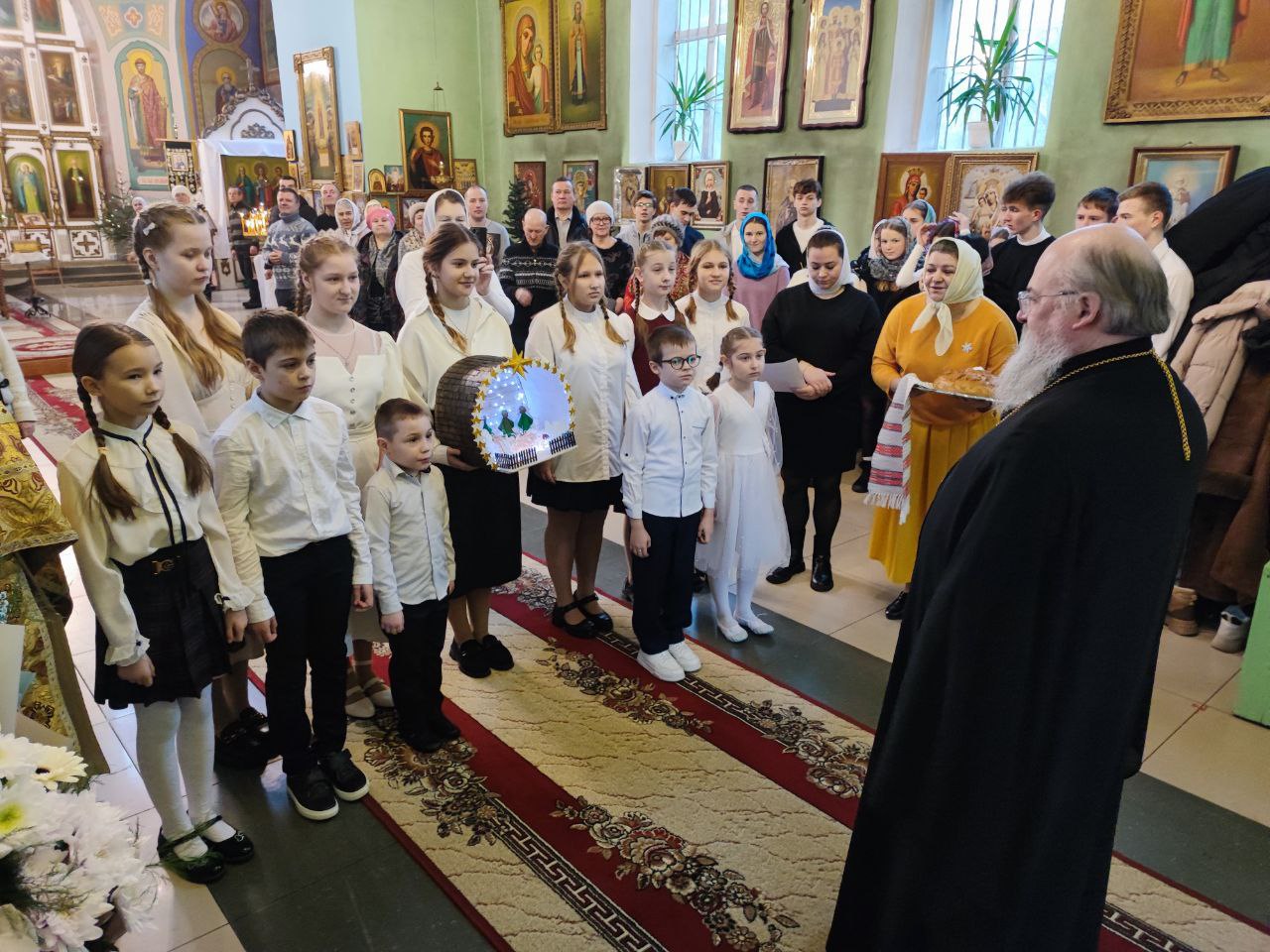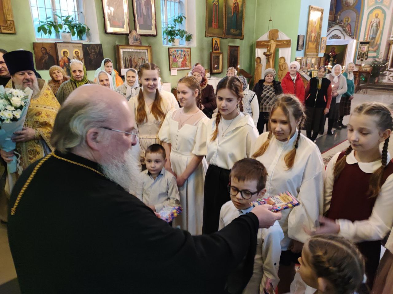 Перед началом богослужения со слов приветствия к архипастырю обратилась руководитель воскресной школы «Радонеж» Клячина Татьяна Ивановна, а затем ребята рассказали стихи, спели рождественские песнопения и колядки.