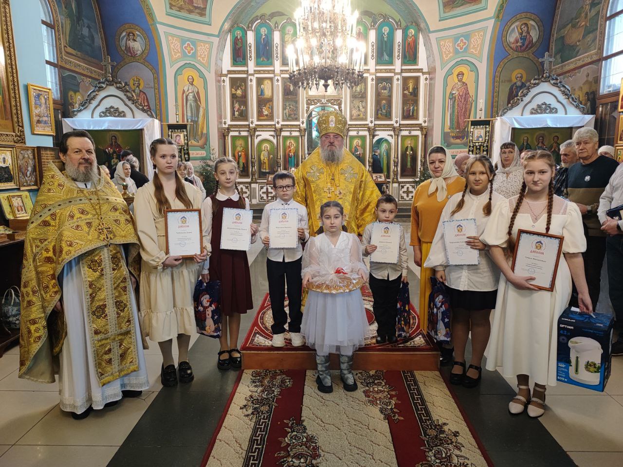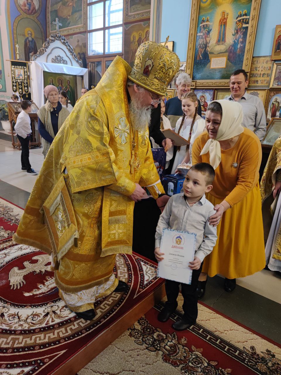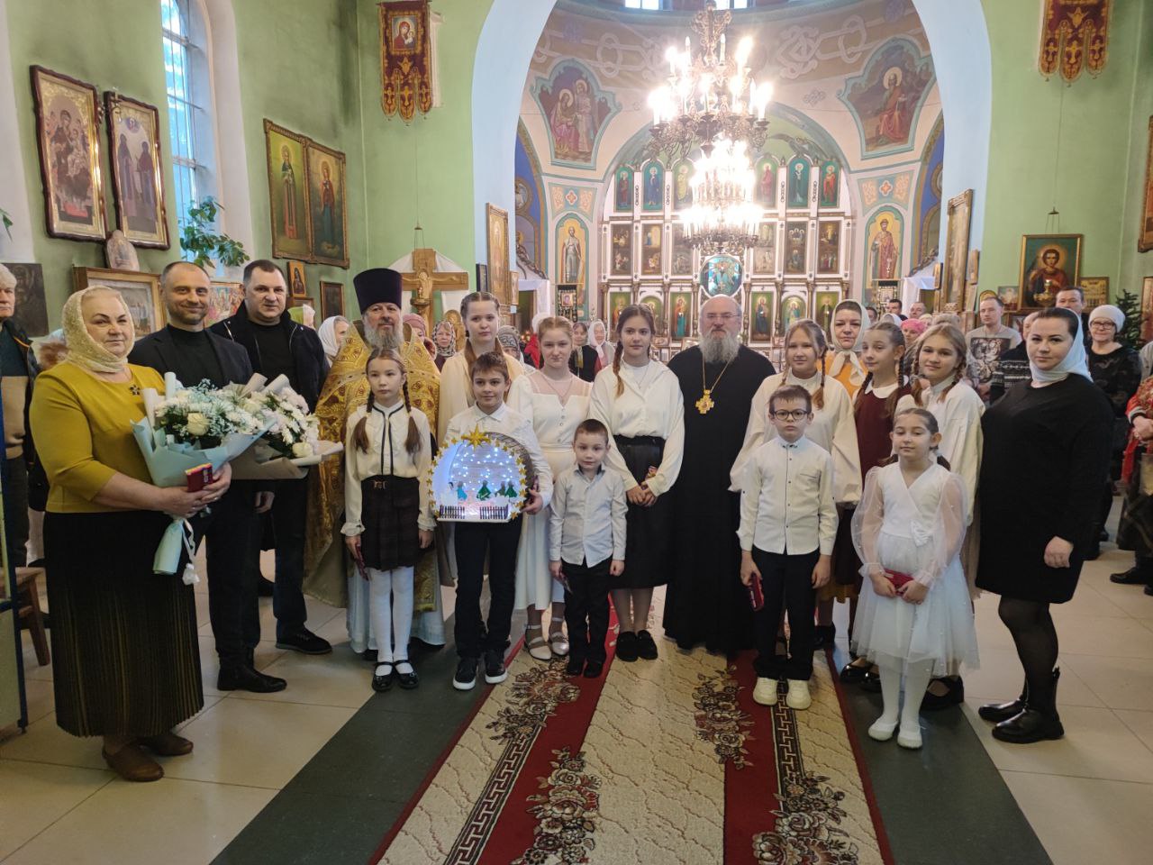 Перед началом богослужения со слов приветствия к архипастырю обратилась руководитель воскресной школы «Радонеж» Клячина Татьяна Ивановна, а затем ребята рассказали стихи, спели рождественские песнопения и колядки.