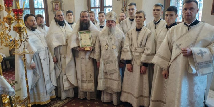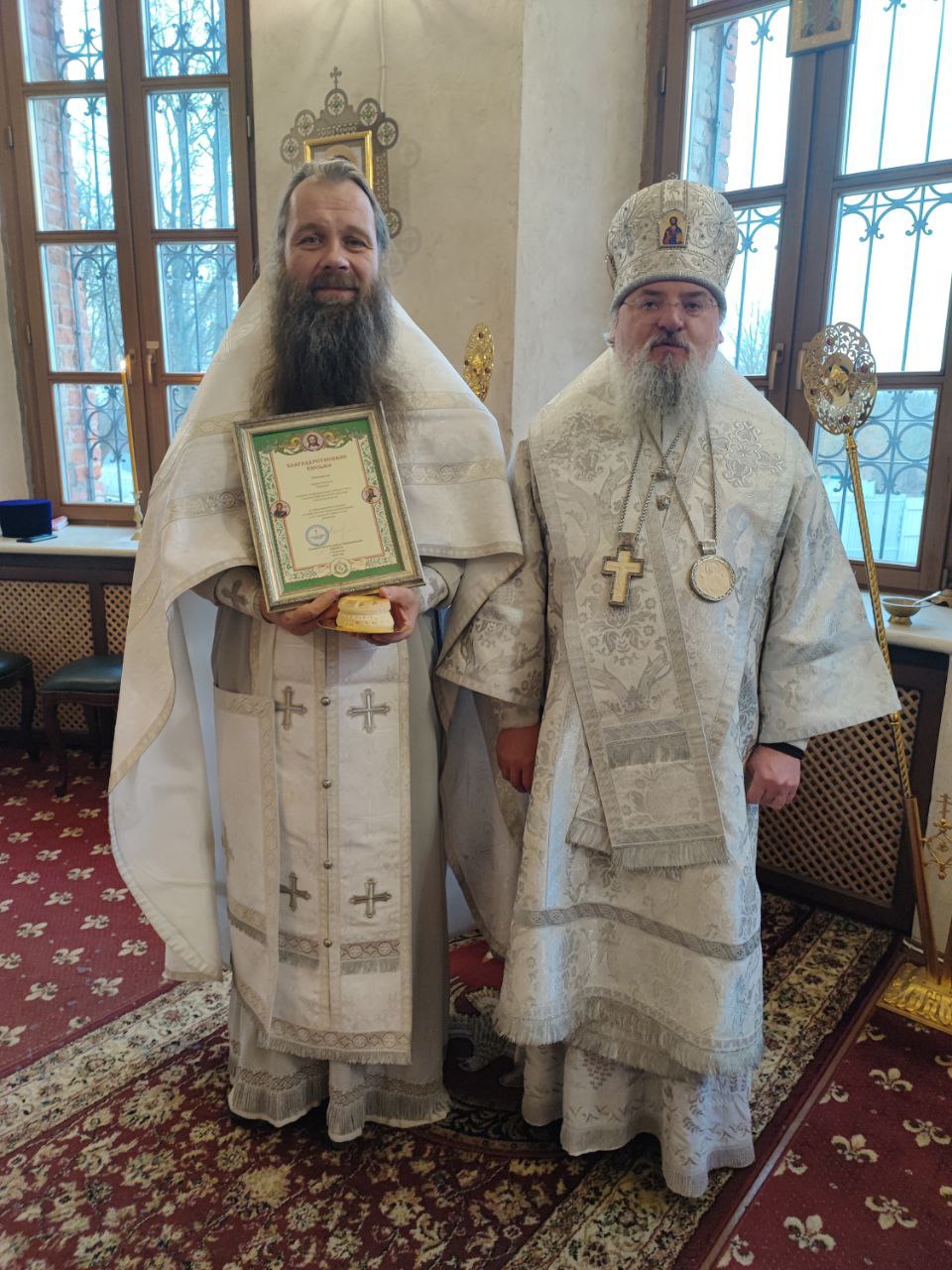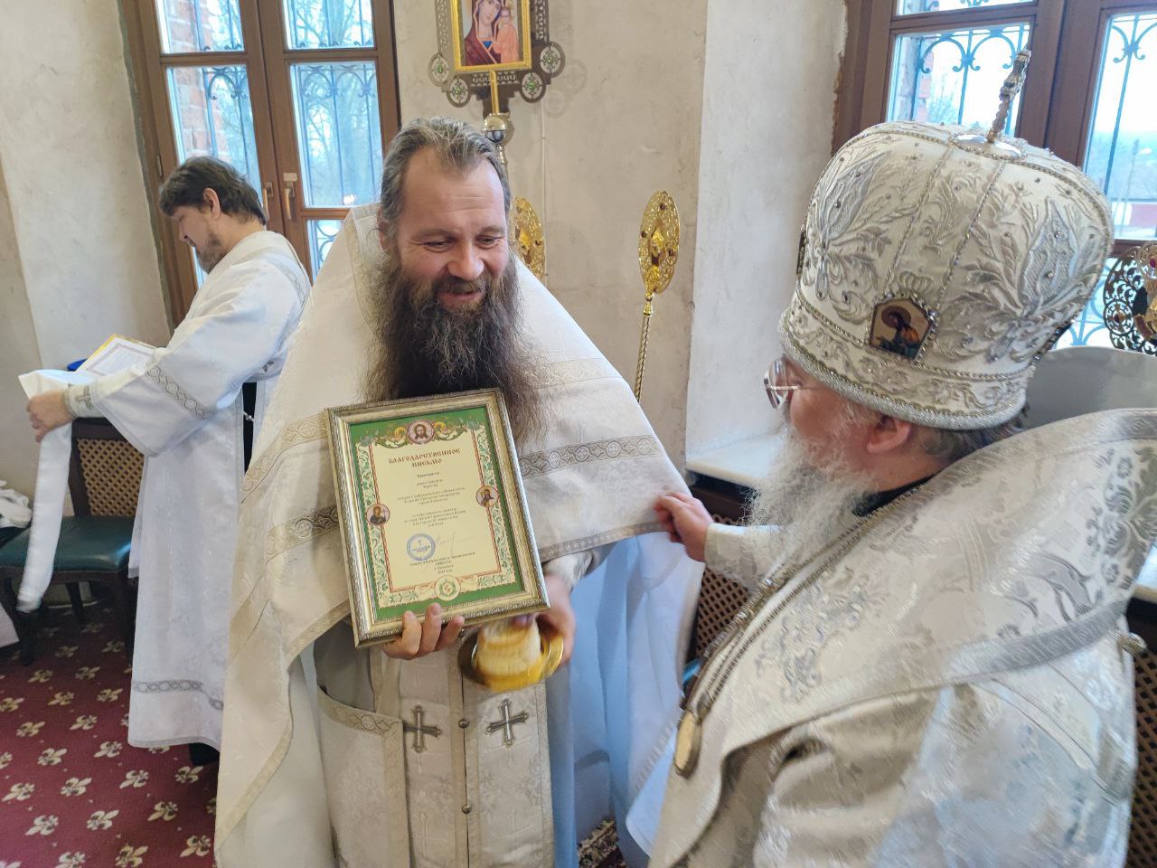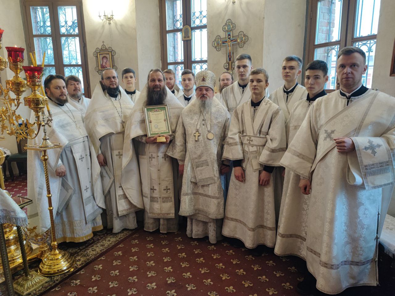 По запричастном стихе владыка поздравил с 45-летием клирика собора иерея Евгения Чуркина и преподнес ему святую просфору и благодарственное Архиерейское письмо.