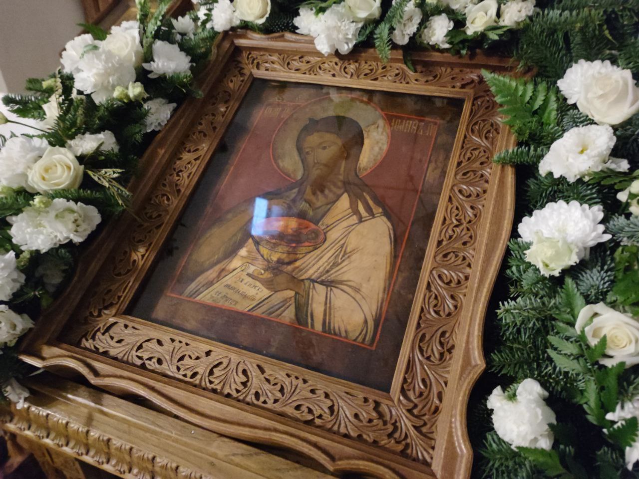 По отпусте литургии священнослужители, в центре храма, пред иконой святого, совершили славление праздника, а затем, вознеся молитву Крестителю Господню Иоанну, и окропив богомольцев святой водой, владыка обратился к прихожанам с проповедью.