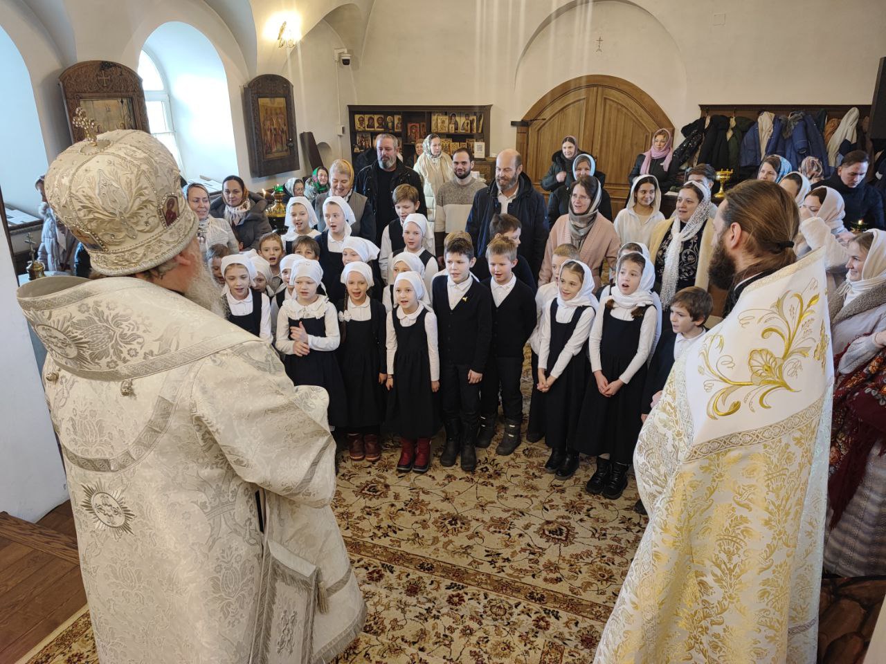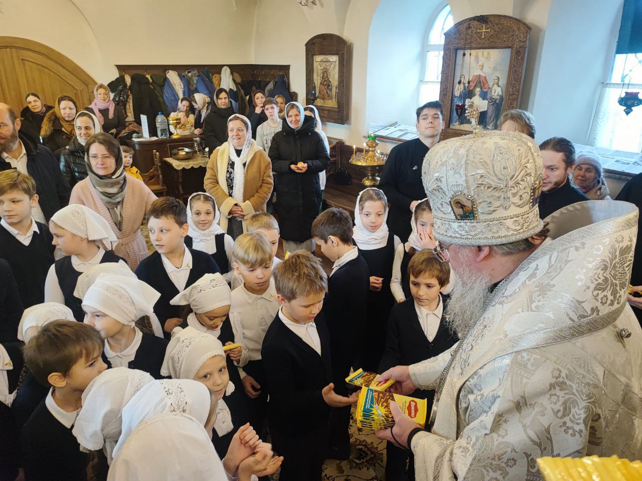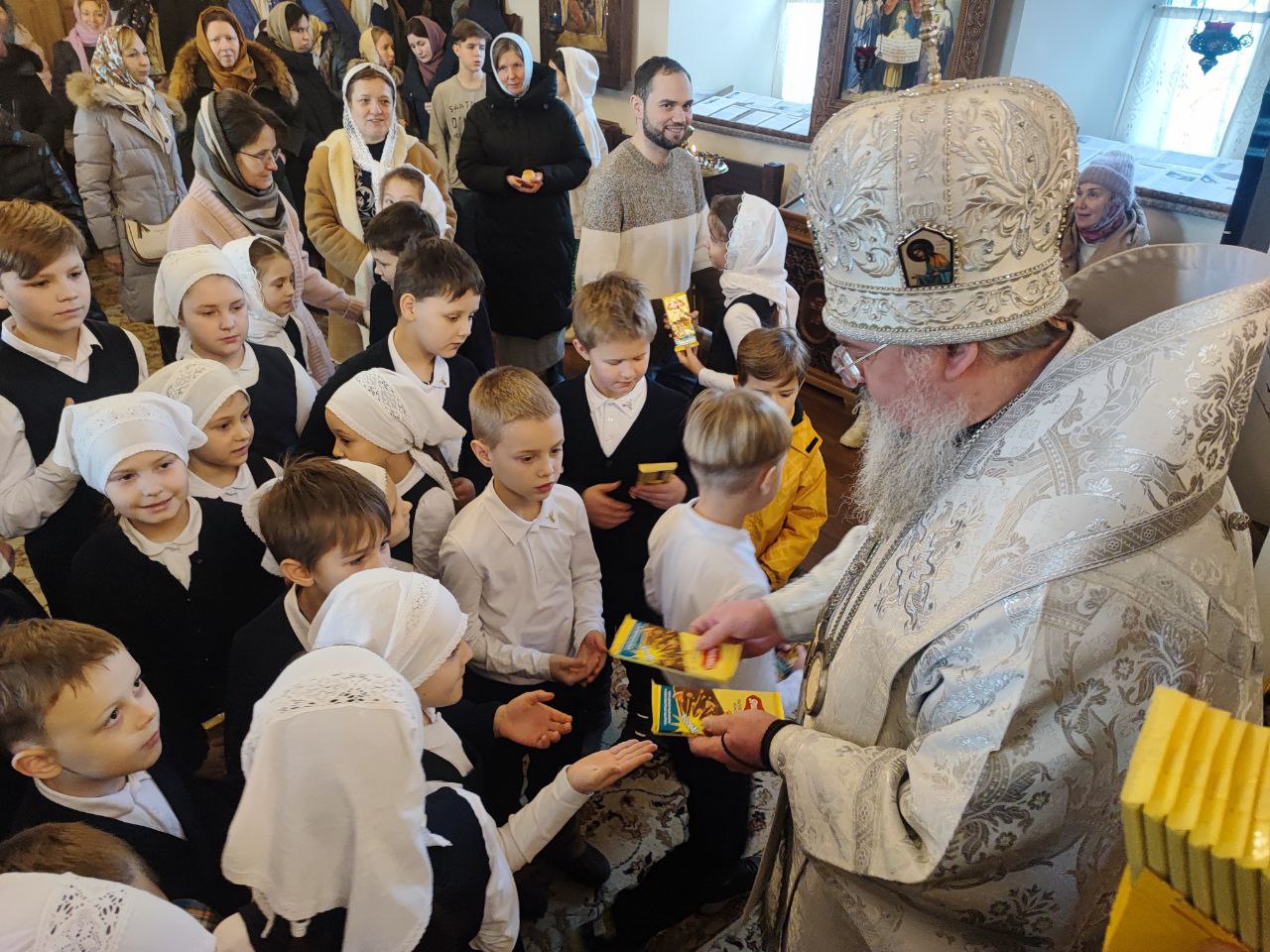 Священнослужителей и прихожан храма поздравили дети – учащиеся Русской классической школы. Владыка поблагодарил детишек за прекрасное выступление и вручил каждому сладкий подарок.
